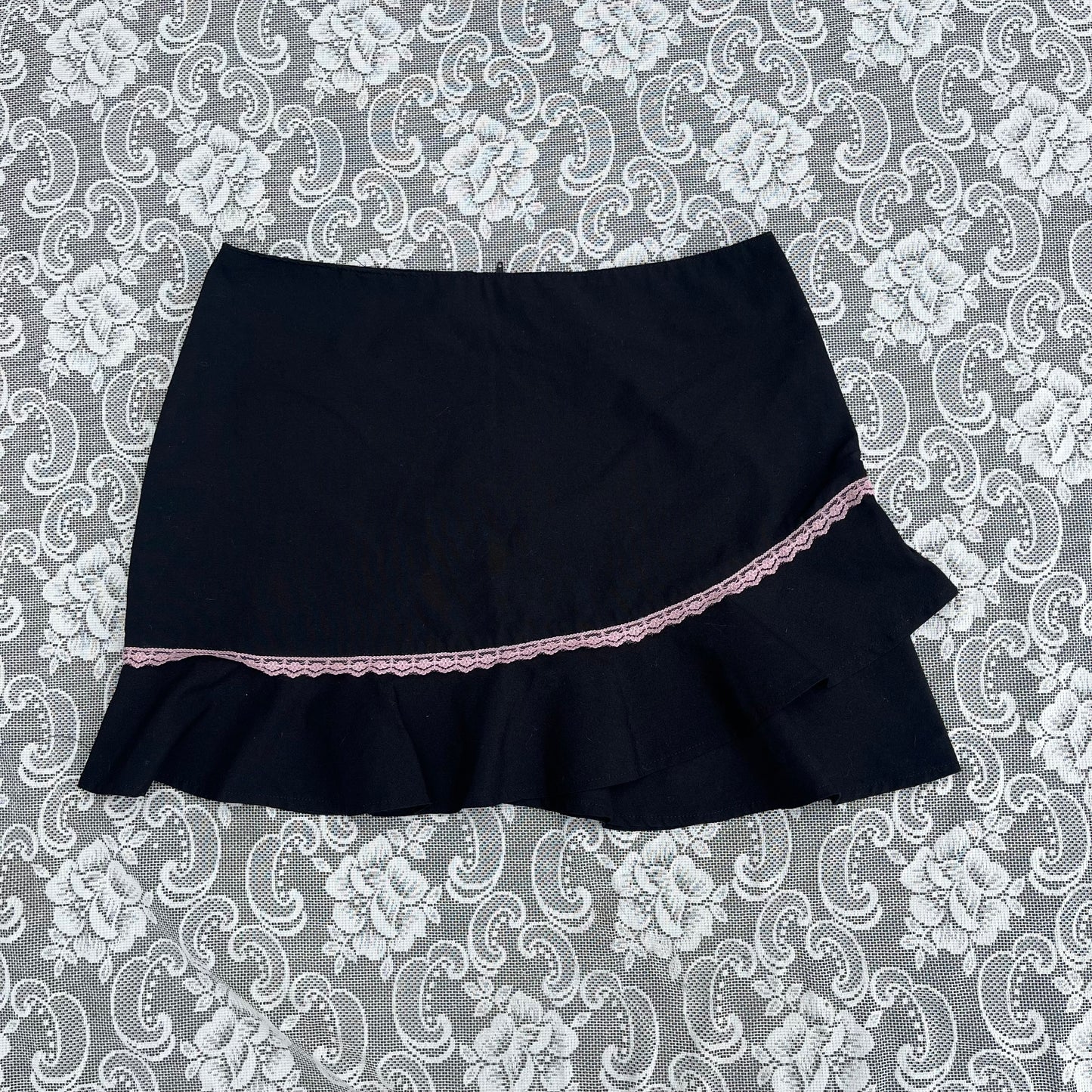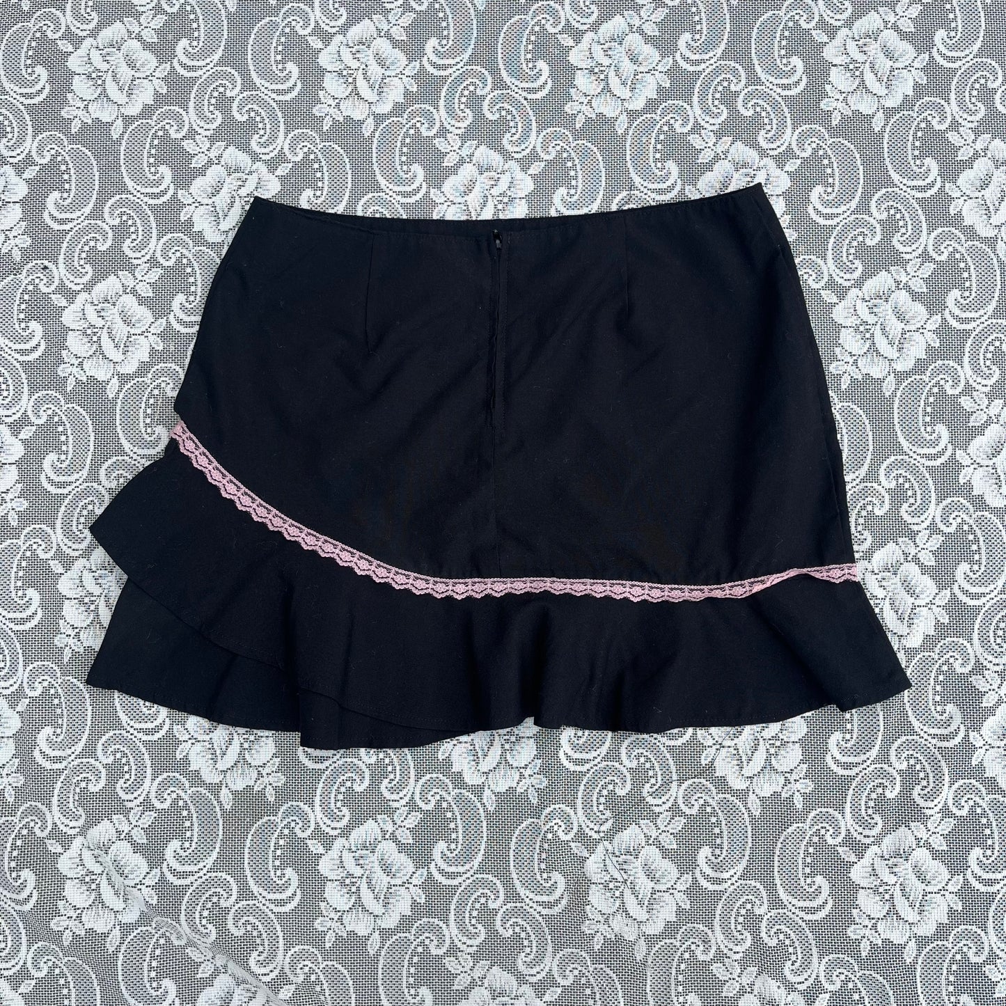 GOD there’s threads on the back on the model pic in sorry it does not come with those threads. this skirt is so cute and flattering. modern skirt lol. tag says size 7. waist is 29 inches. hips are 37 inches. length is 14 inches.