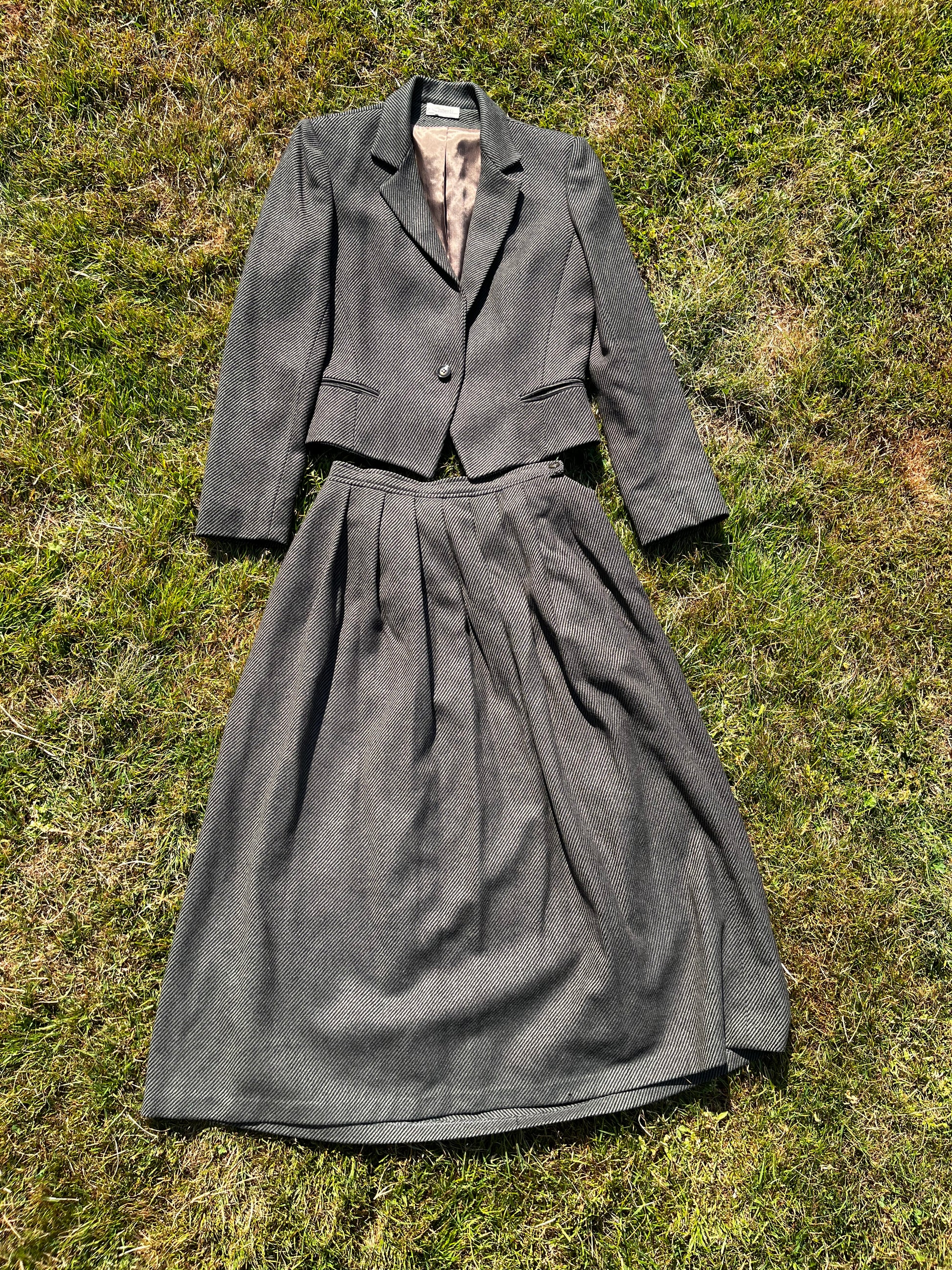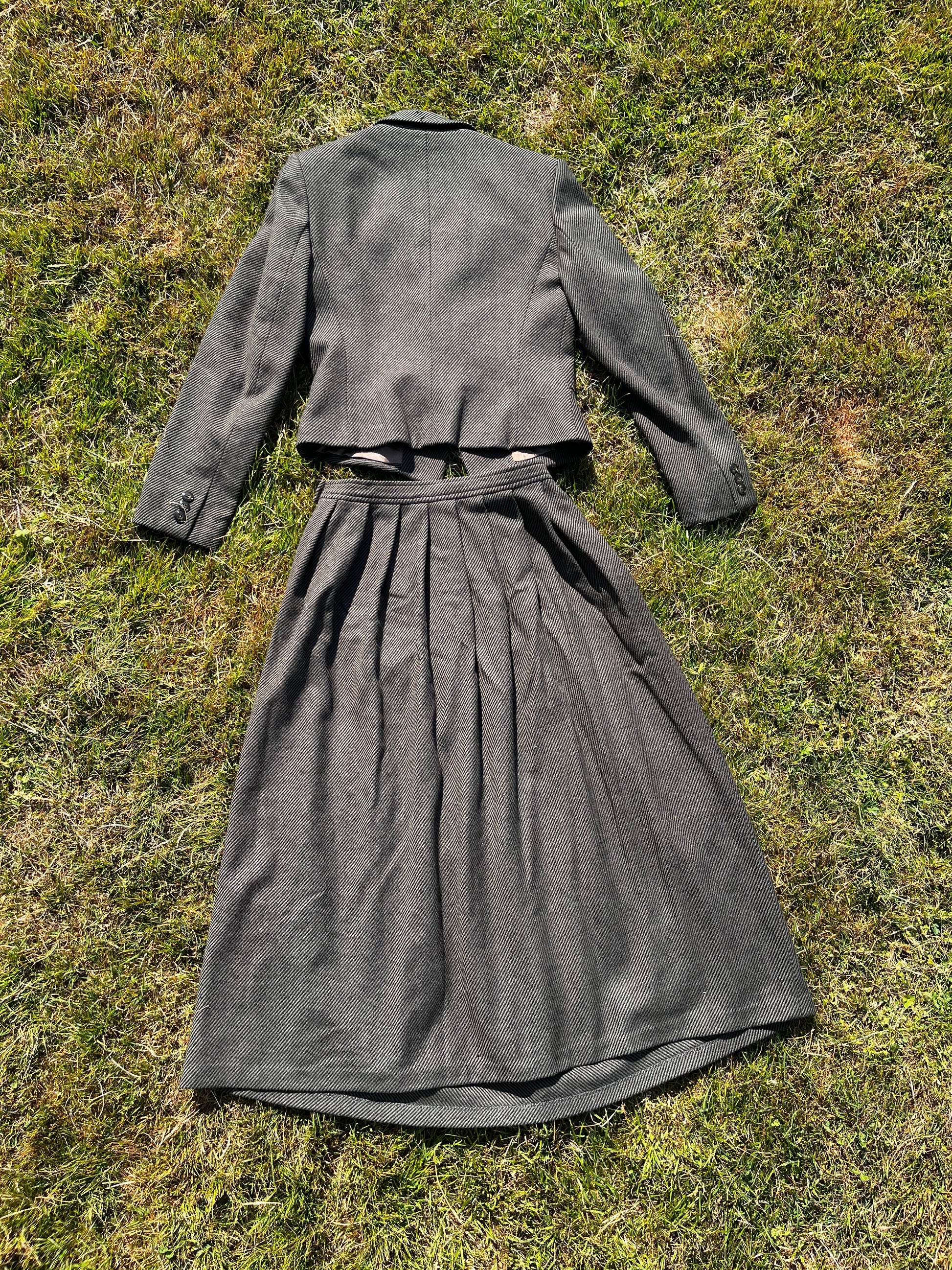 1960s wool green and black pinstripe 2 piece skirt and blazer set