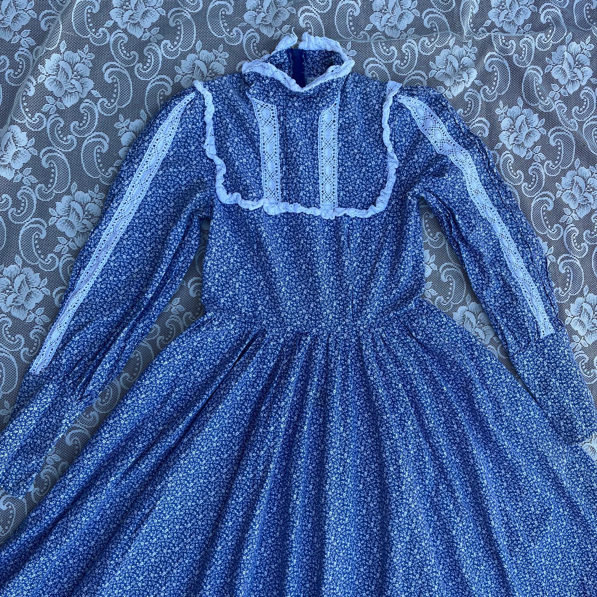 70S AUTHENTIC LAURA ASHLEY BLUE FLORAL N LACE PRAIRIE DRESS