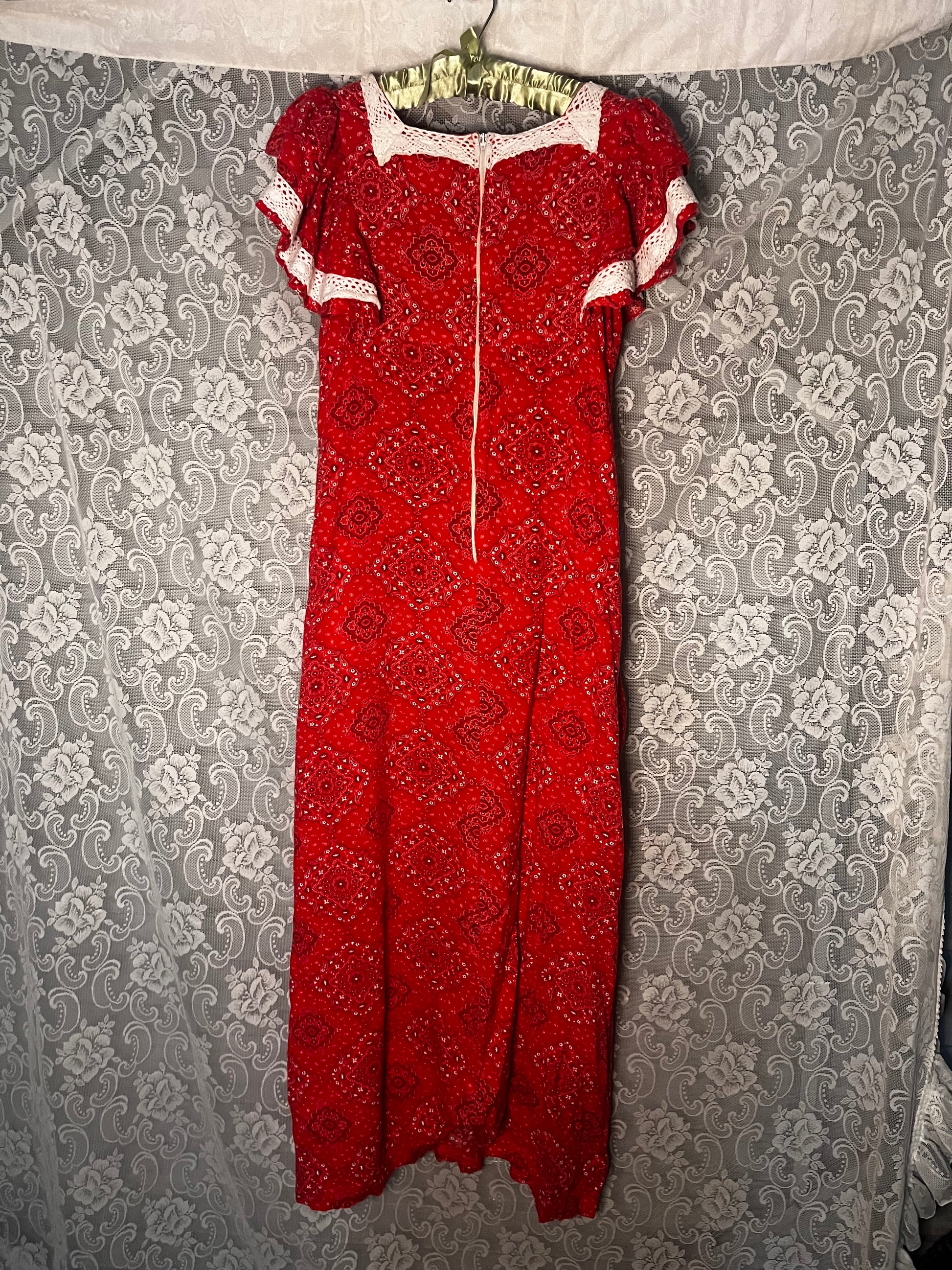 beautiful loooong lightweight cotton dress. length from shoulder to feet is 53 inches and the tightest point (underbust) is 30 inches. it has strings on the side to tie it to fit tighter and it has One pocket! that’s why it’s a lil crooked looking. i believe that it is handmade as i couldn’t find any tags!!