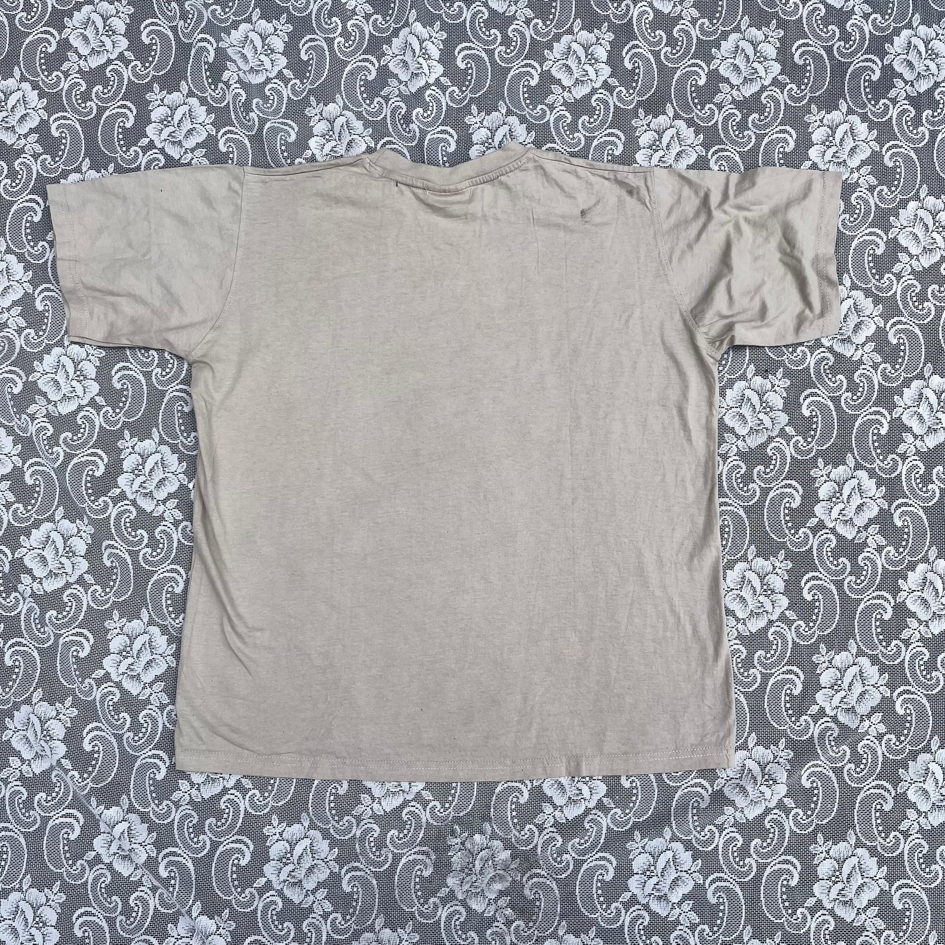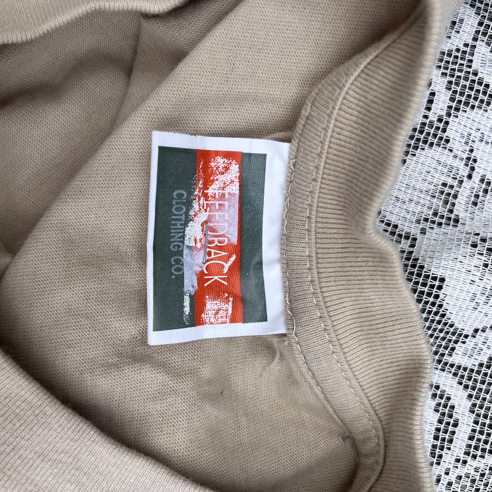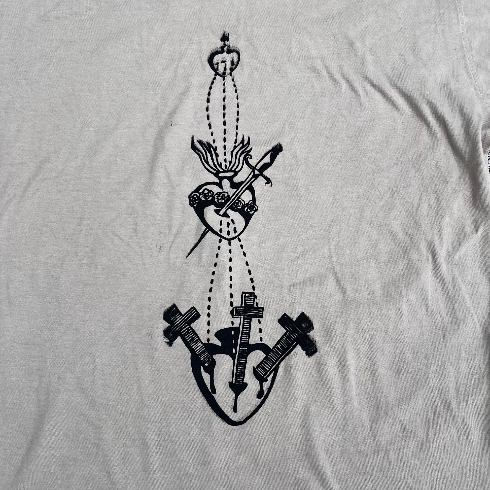 design by me. printed on an old beige blank. tag says size M on the back but it fits a lil bigger i think. couple lil printing errors, lil black smudge on the back.