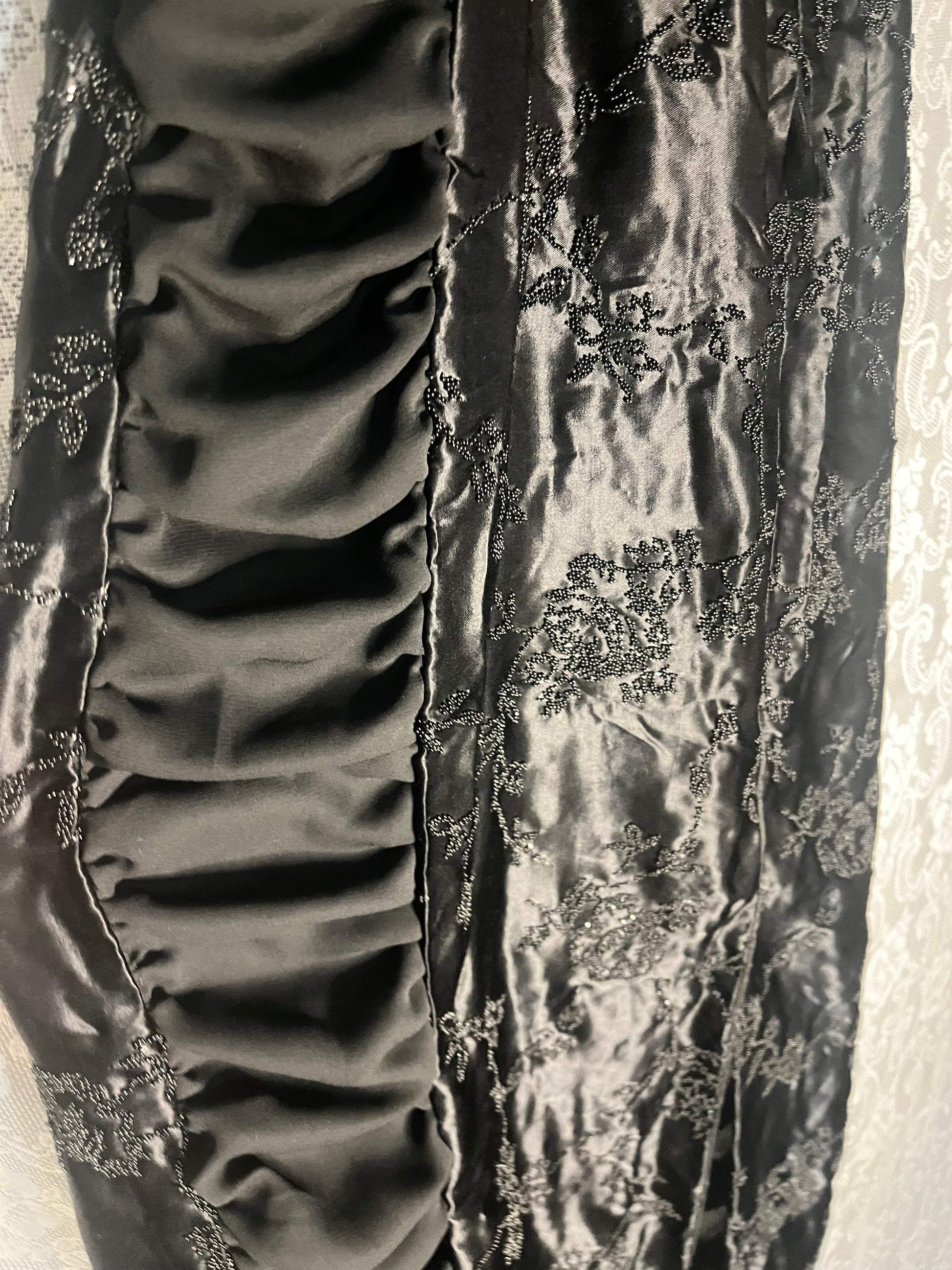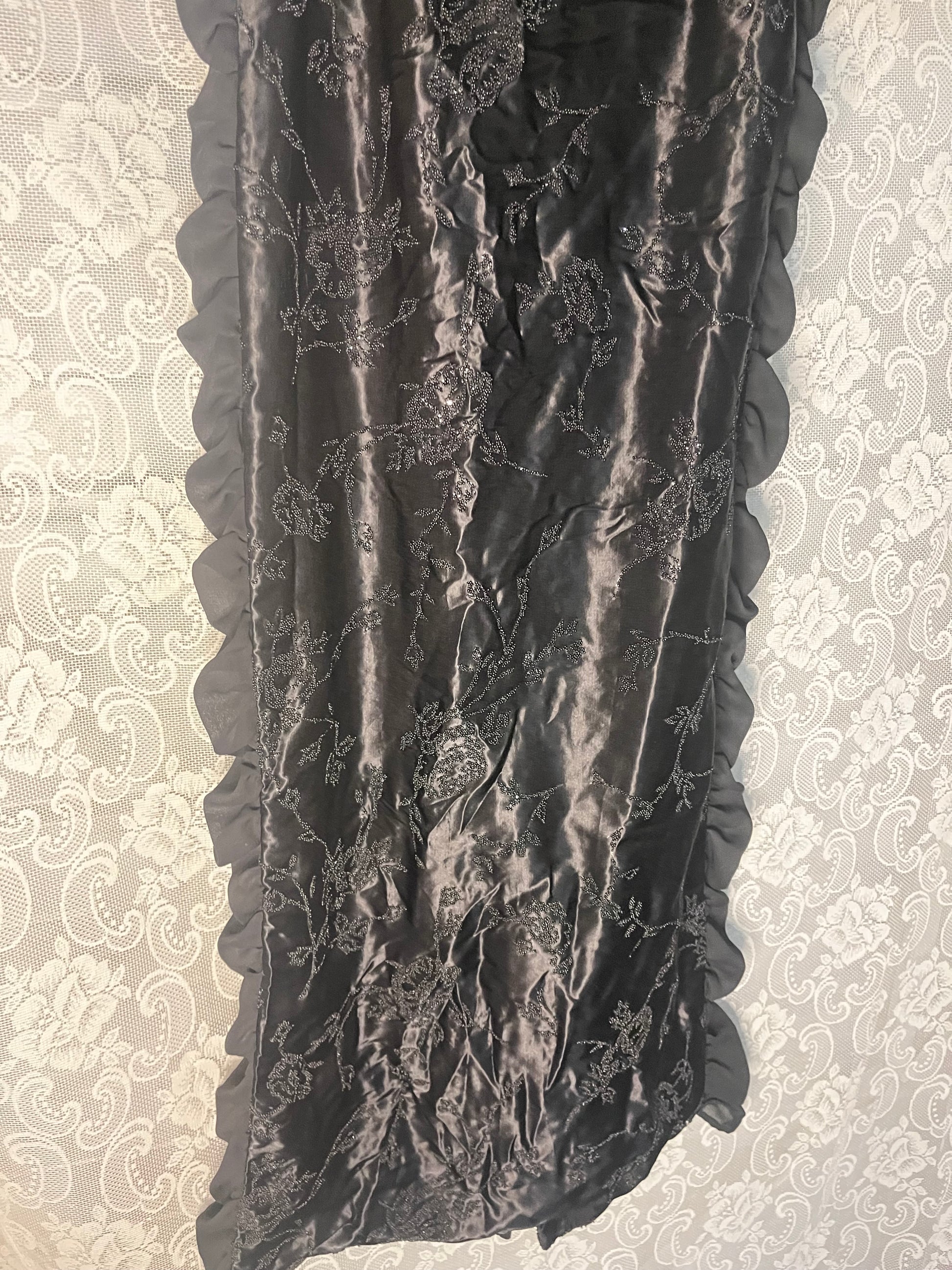 gorgeous beautiful stunning floor length evening gown. very delicately beaded florals. loooong slit that goes quite high up in the back, and the ruffled side panels are translucent. minor damage in the back as the slit is slightly torn and the zipper sticks out of the seam but the zipper can be easily tucked in tbh. length is 54 inches and the waist is 26 inches.