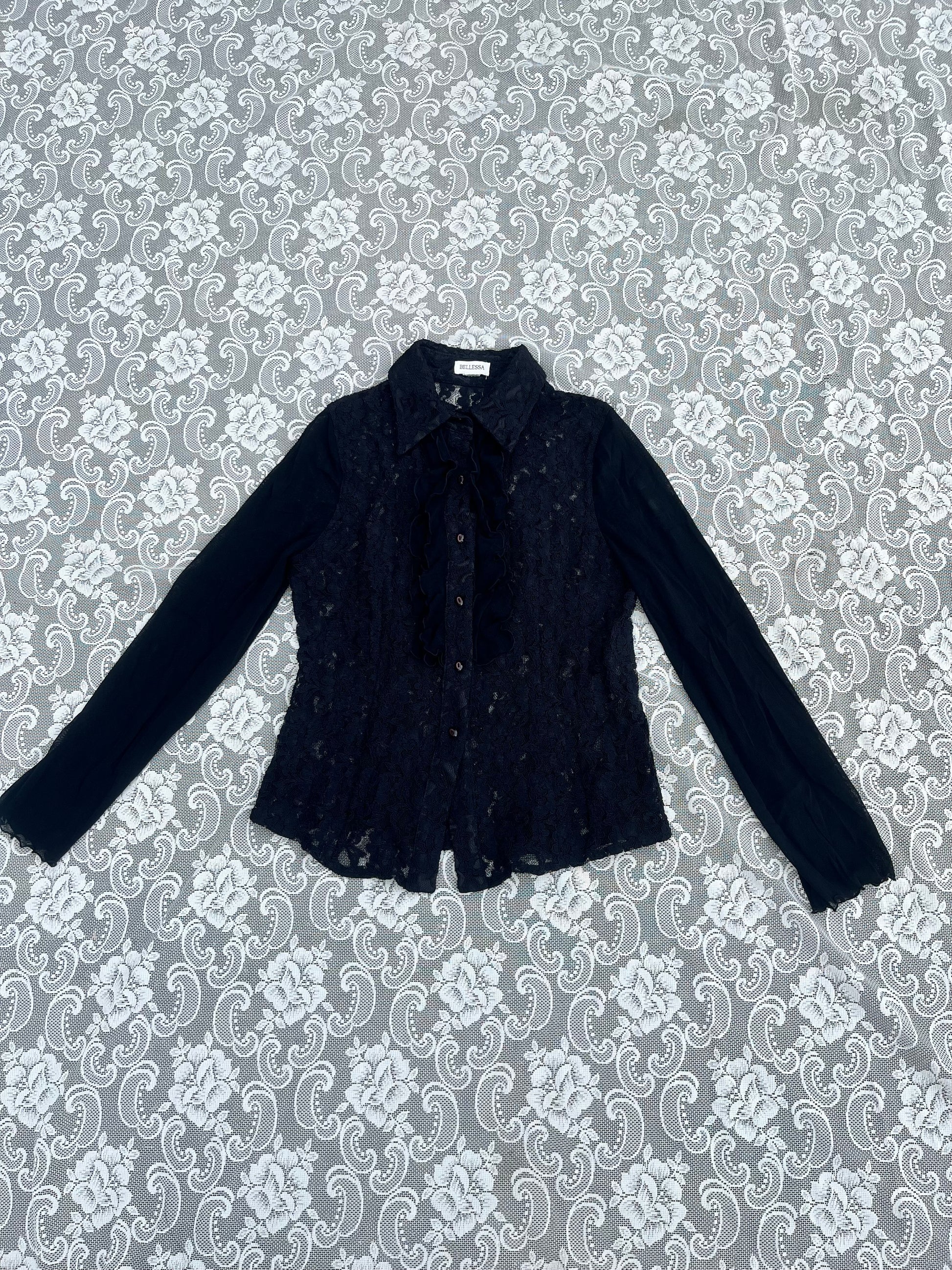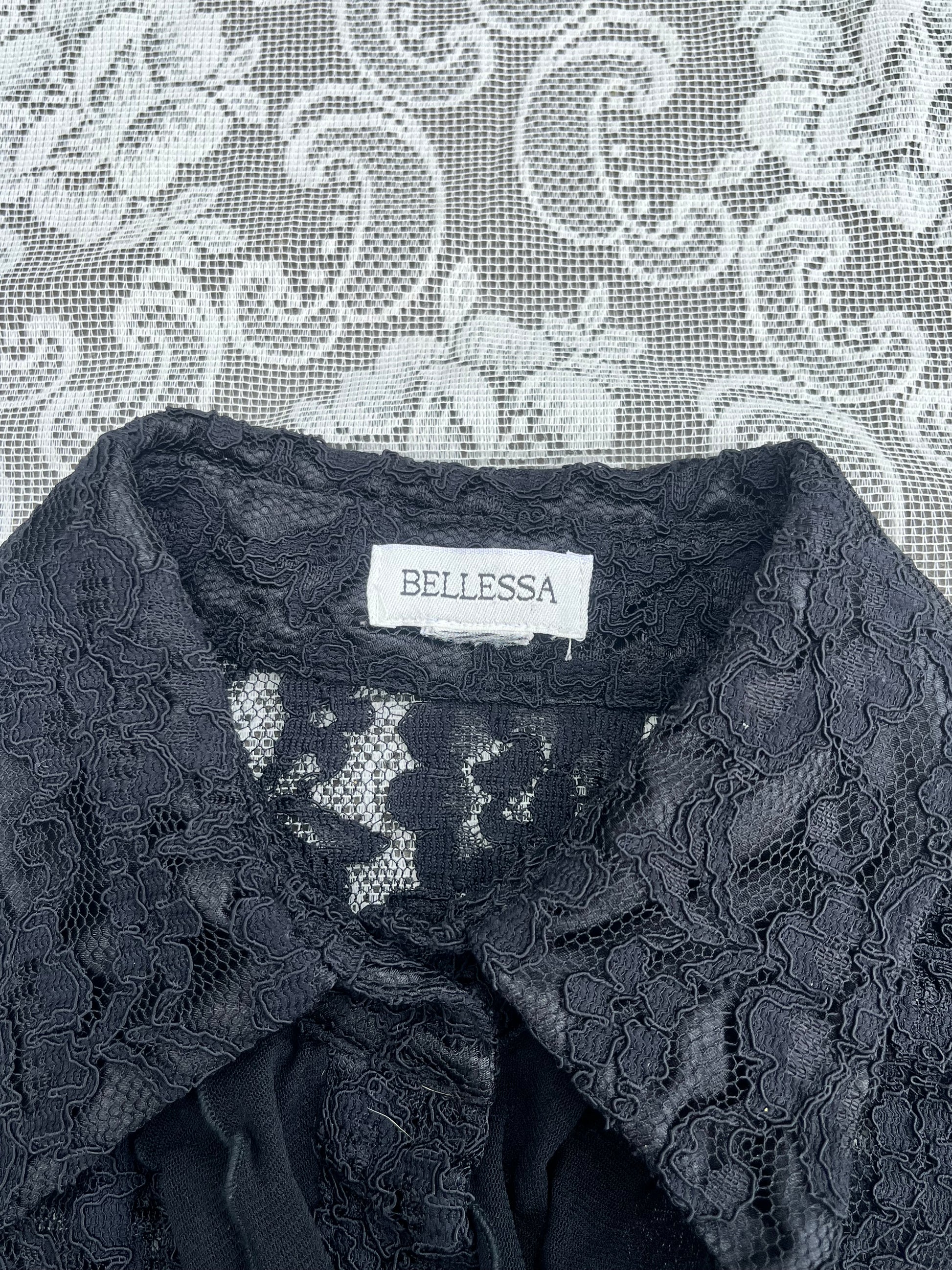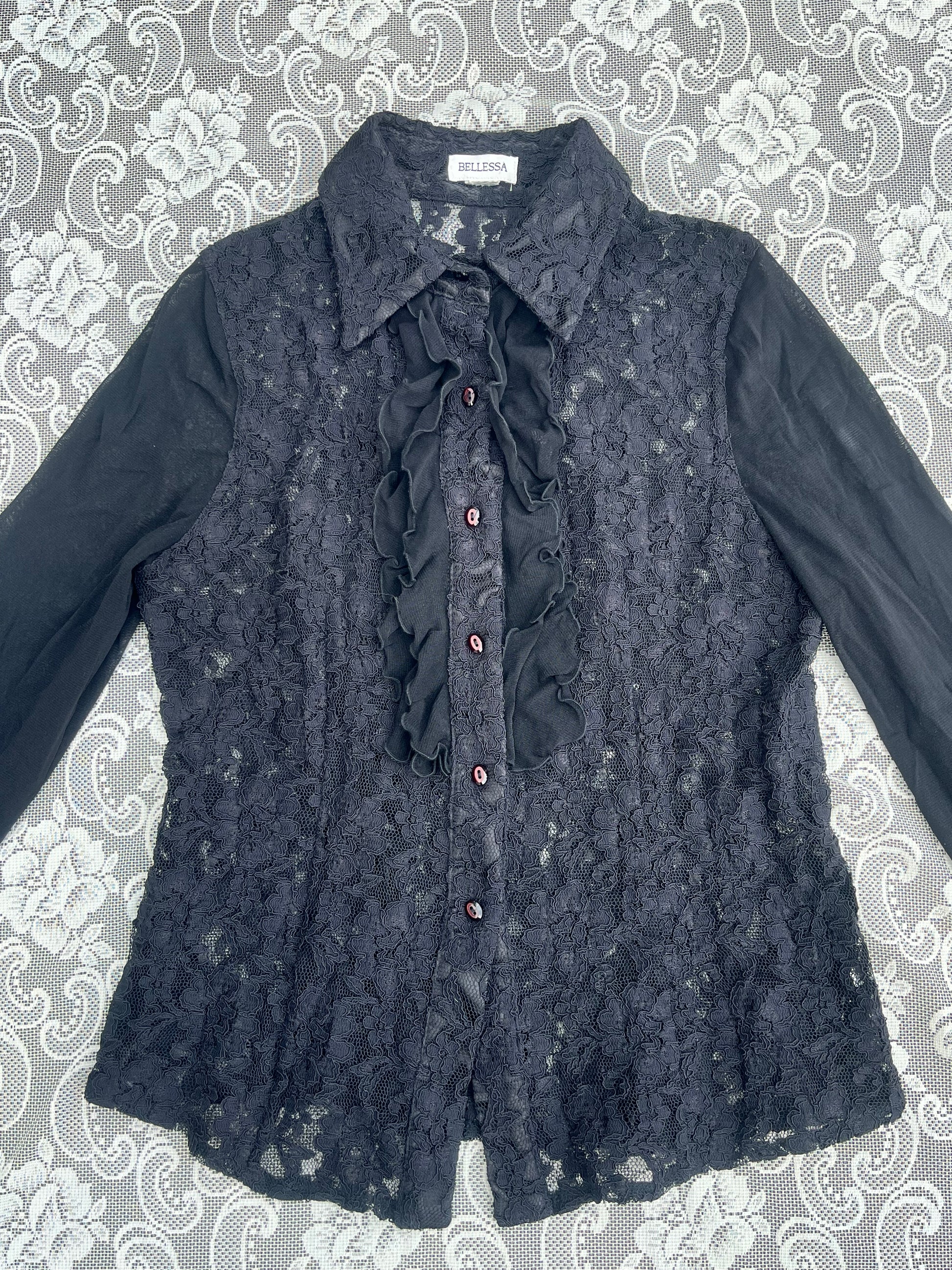 very sweet goth little blouse with mesh sleeves and the same mesh as little ruffle details on the front. tag says bellessa but no size tag sadly. fits like a small/medium. shoulders 15 inches across. pit to pit 18 inches. length 24 inches. sleeves 25 inches.