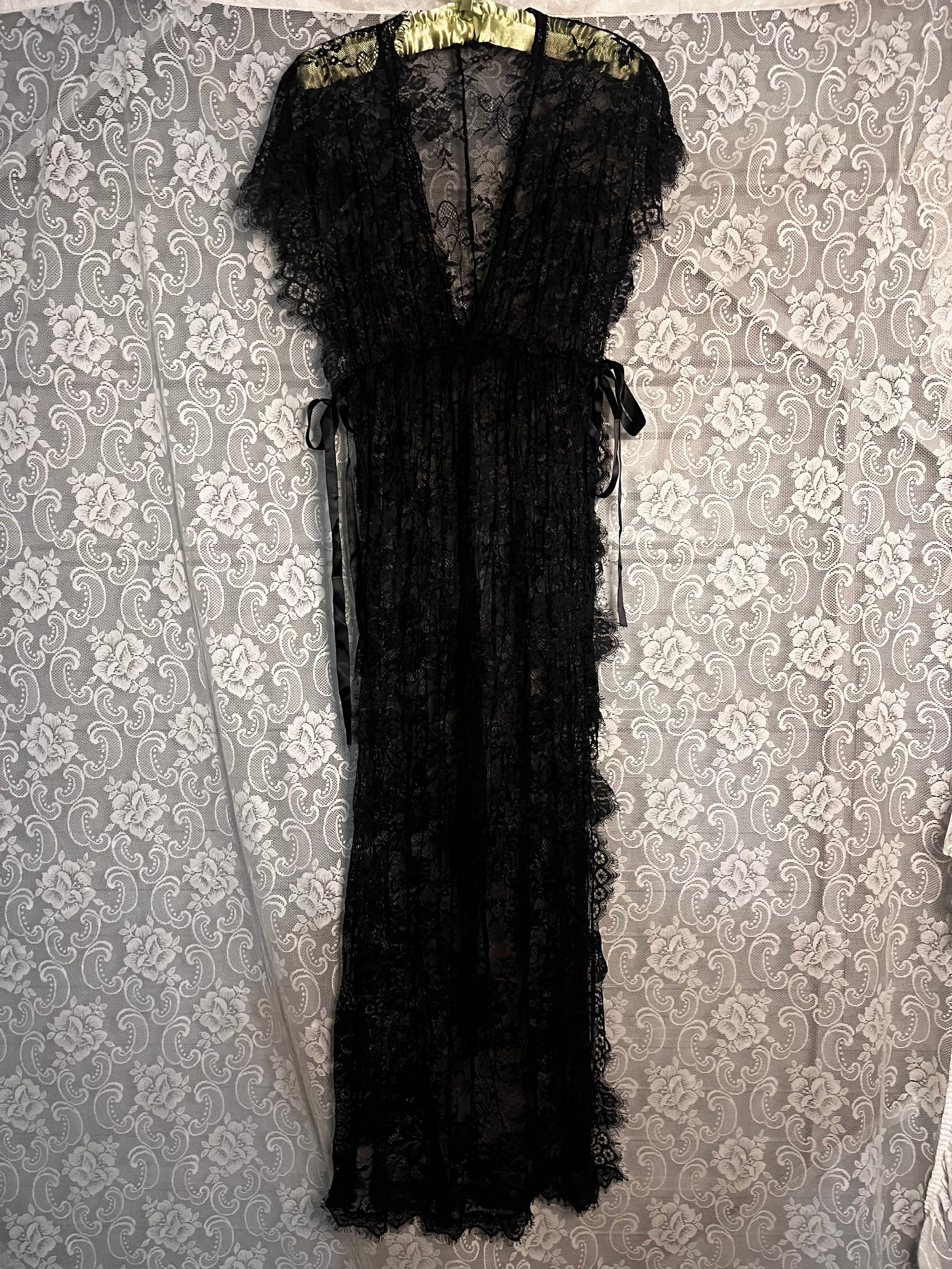 god this is a show stopping piece. floor length fully lace dress, frilly sleeves n fully open sides that come together at the bust with beautiful ribbon. it’s somewhat of an apron type situation, it’s only connected at the shoulders and it’s totally open on the sides. this also makes it very versatile size wise. there’s a lil care tag that says it’s a size L but the side tie system makes it versatile. length from top to bottom is 54 inches.