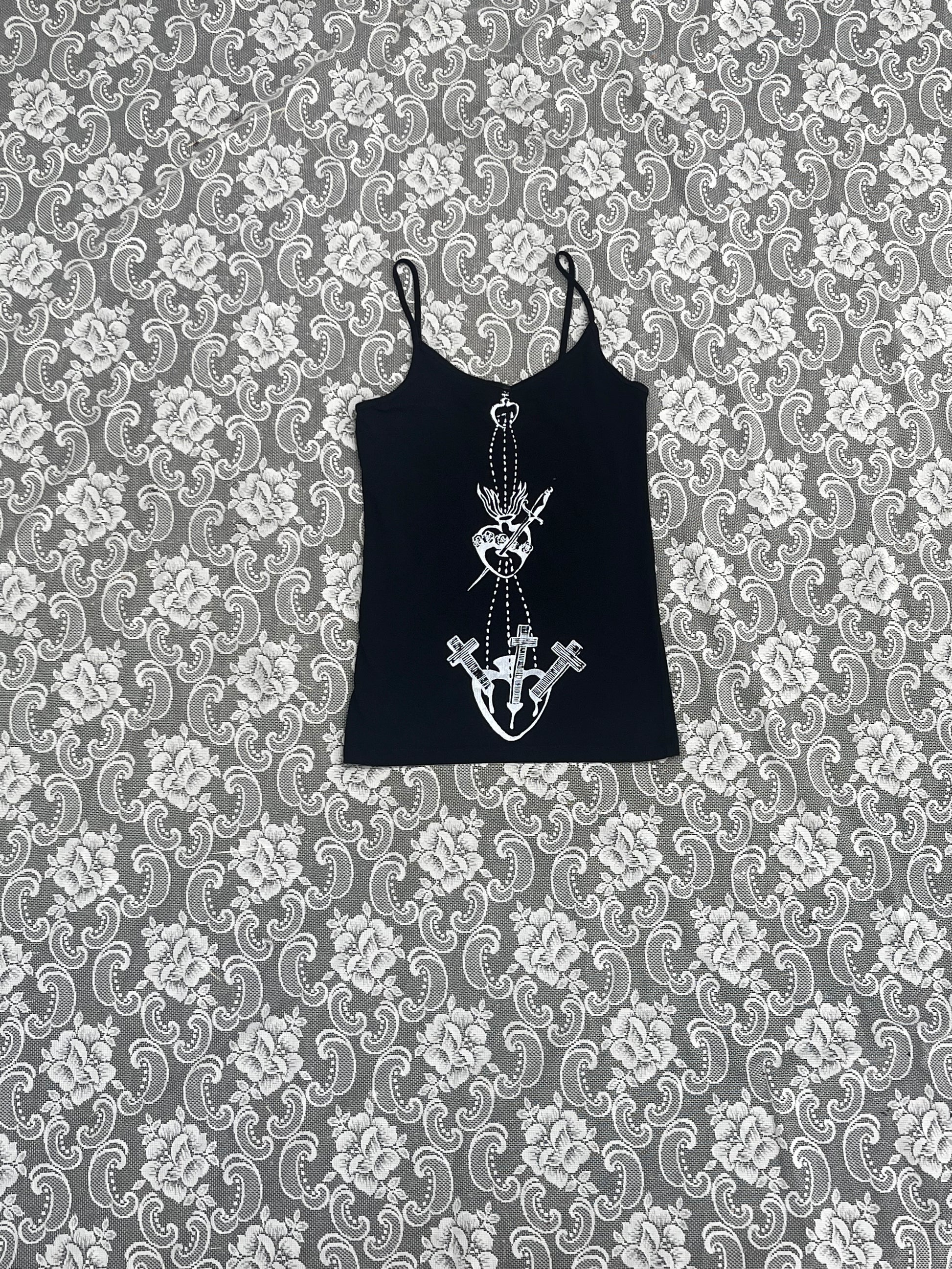 black sweetheart spaghetti strap screenprinted sacred heart tank top
