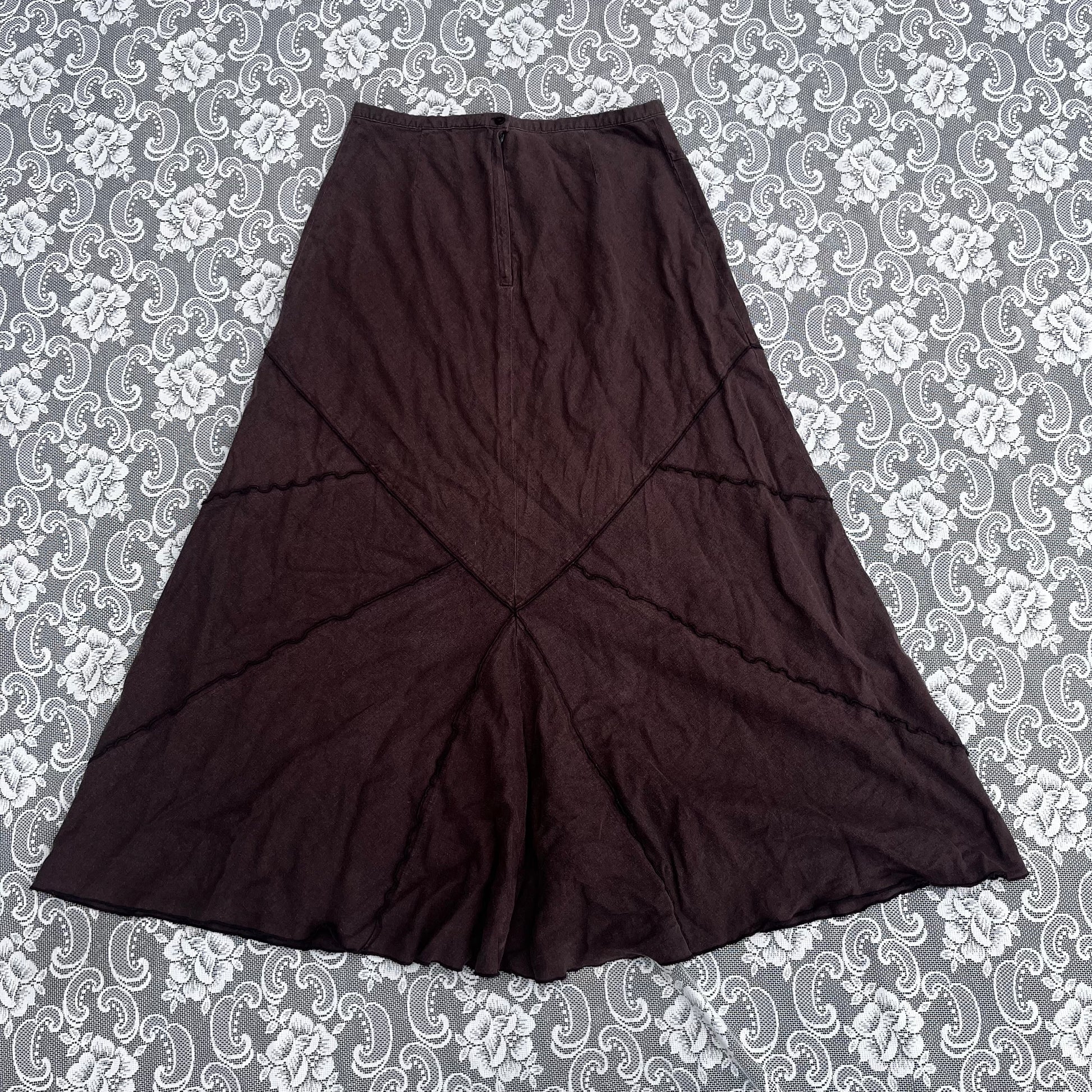 long beautiful wonderful brown linen-y skirt. buttons n zips up the back. tag says uk 12. waist is 28 inches. length is 36 inches.