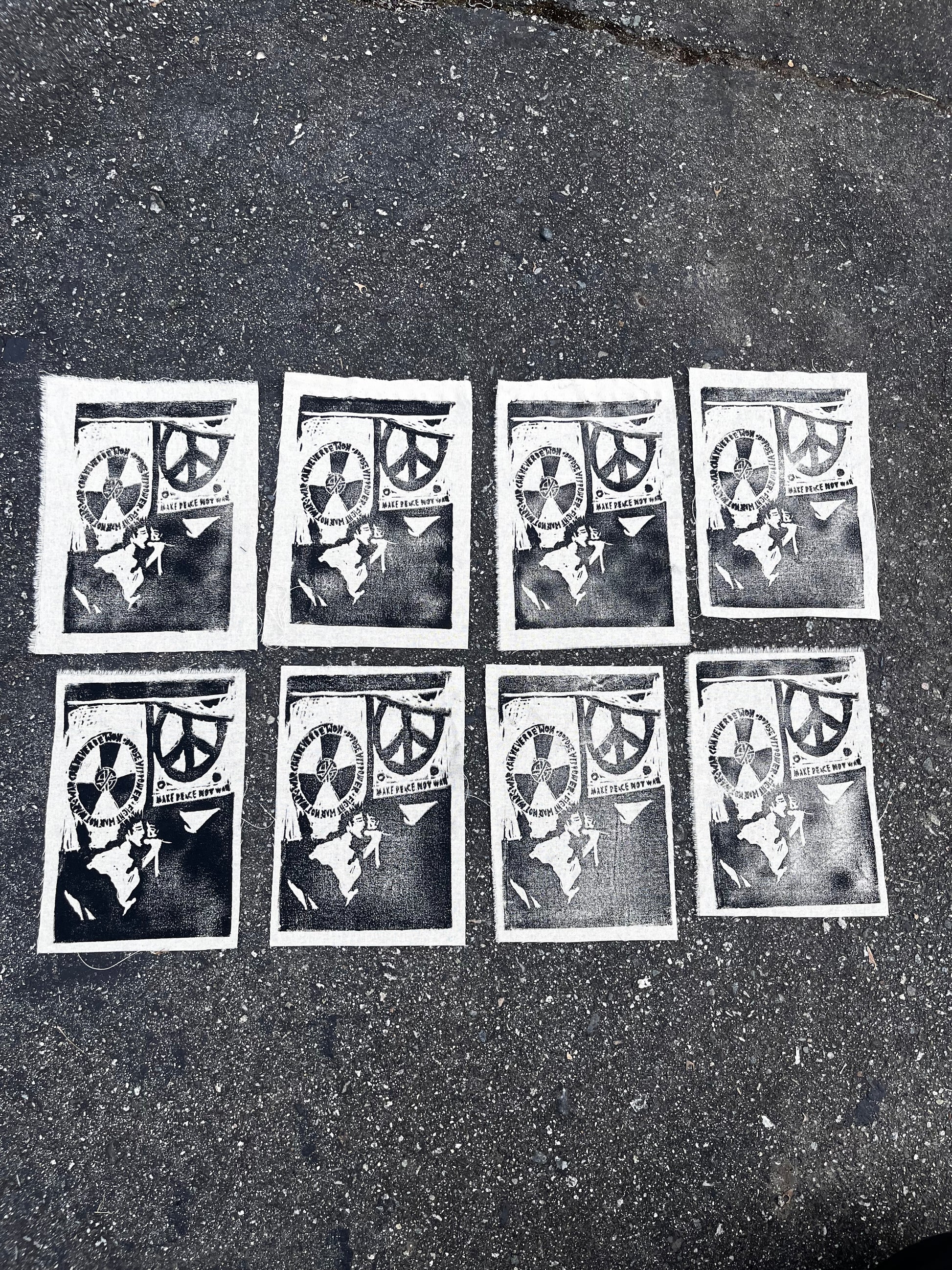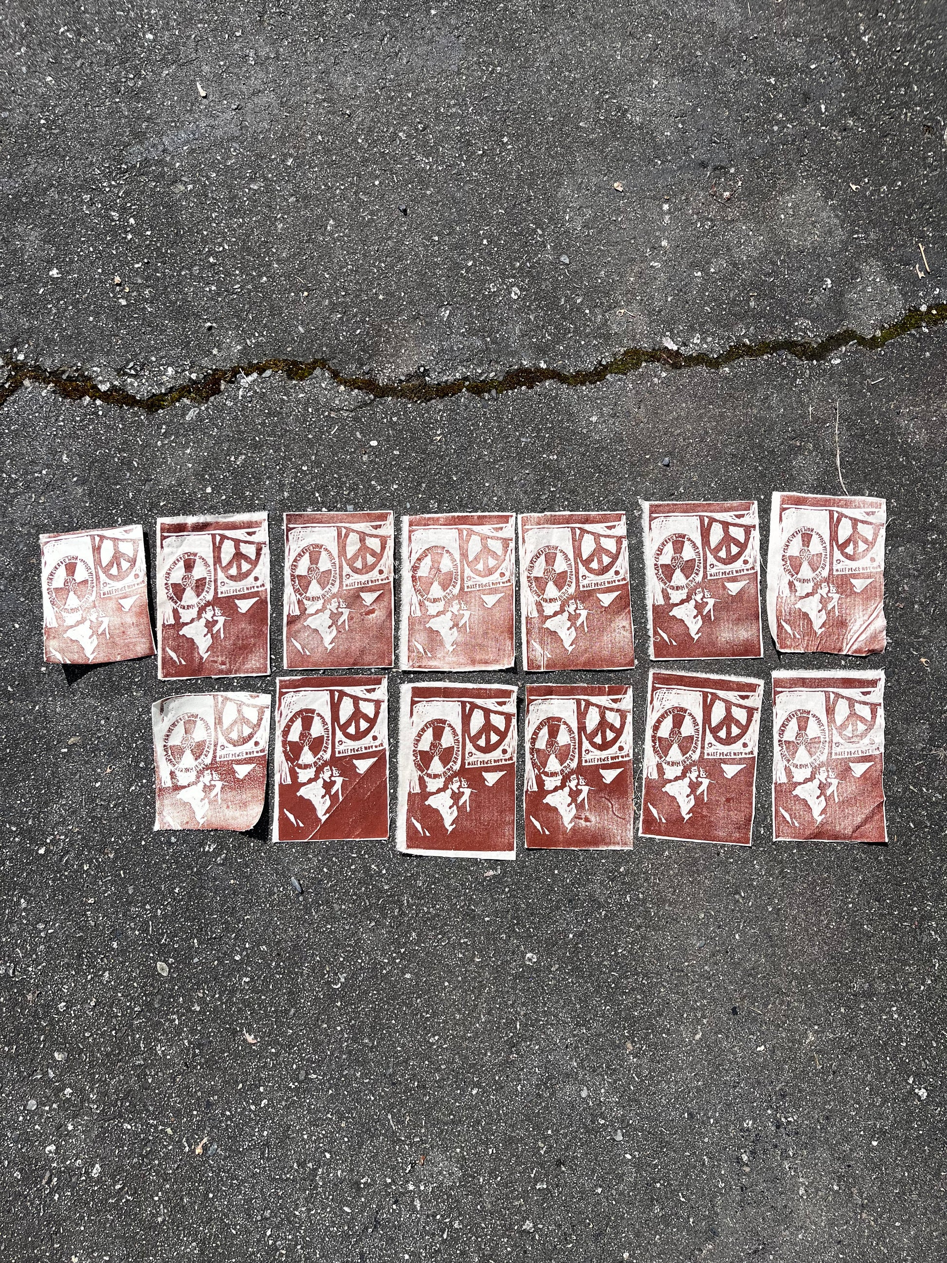 4x6 inches, hand made hand carved block printed patch. on lightweight muslin or thick canvas. patches r handmade so lots of them have little errors, so they’re all as-is. brown oil based ink on off-white fabric.