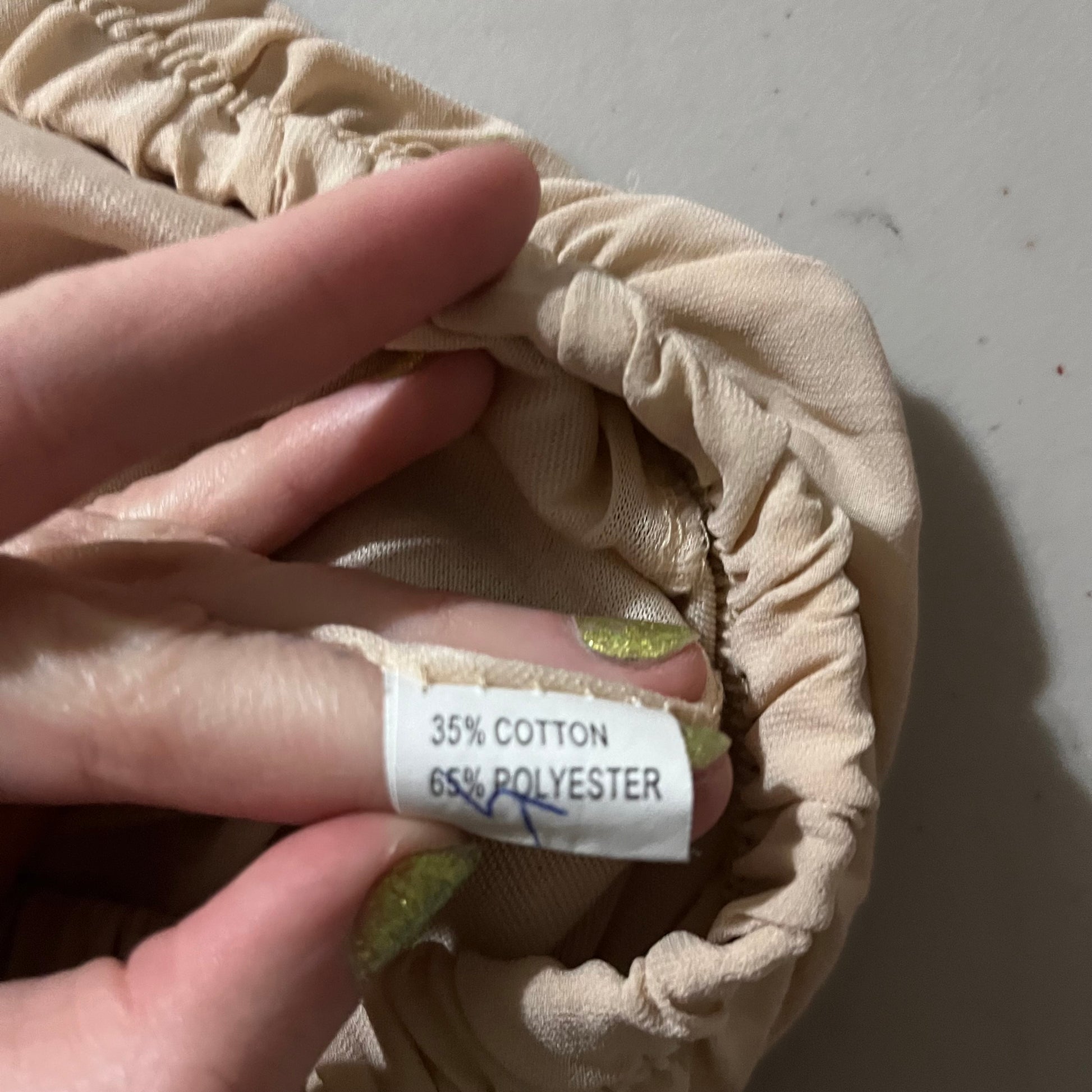beautiful light frilly lacy skirt. only tag is the fabric tag. it has 2 layers, has an inner polyester layer and an outer lacey layer. elastic waist, fits 26-44 inches. length is 25 inches.