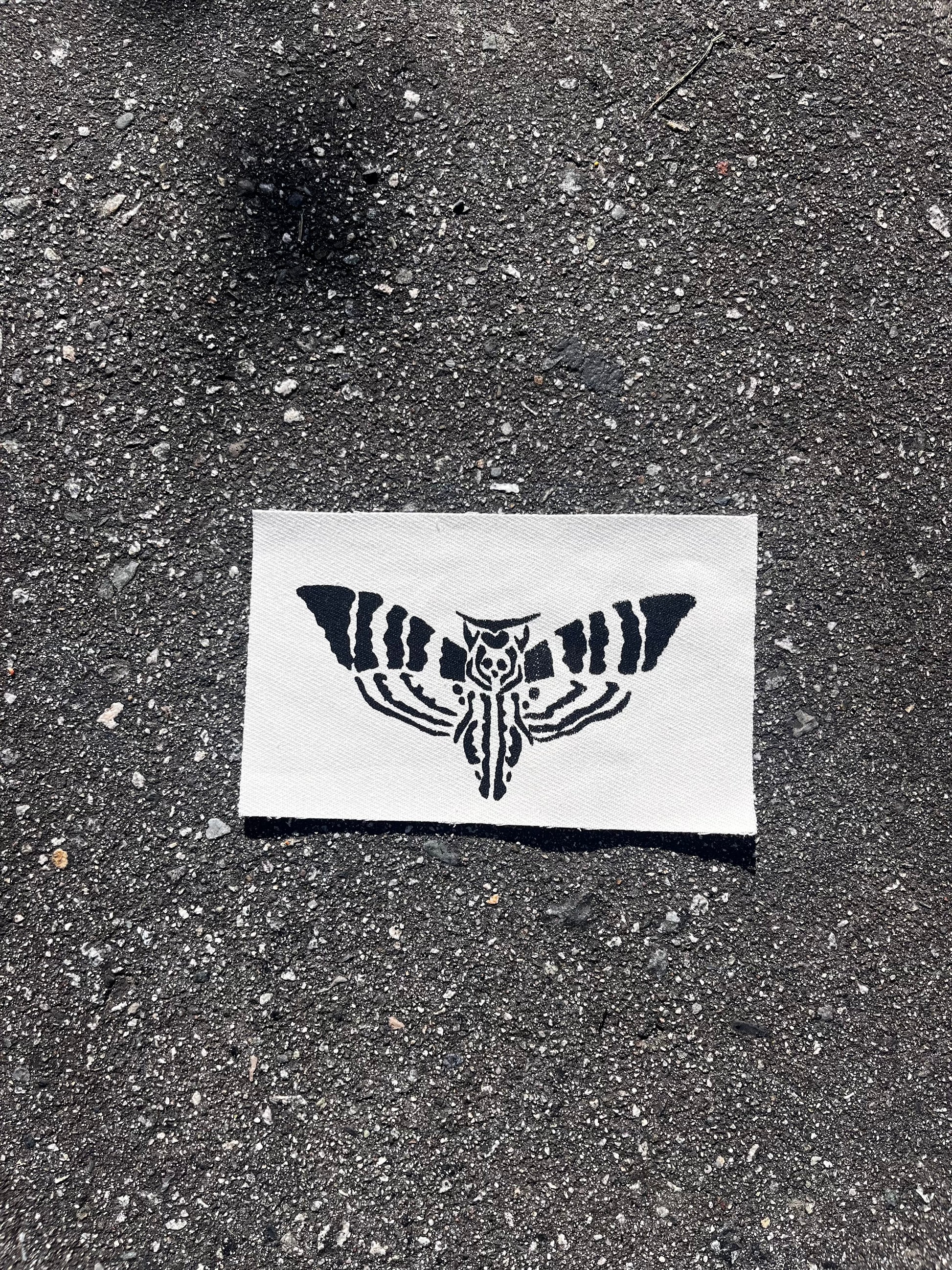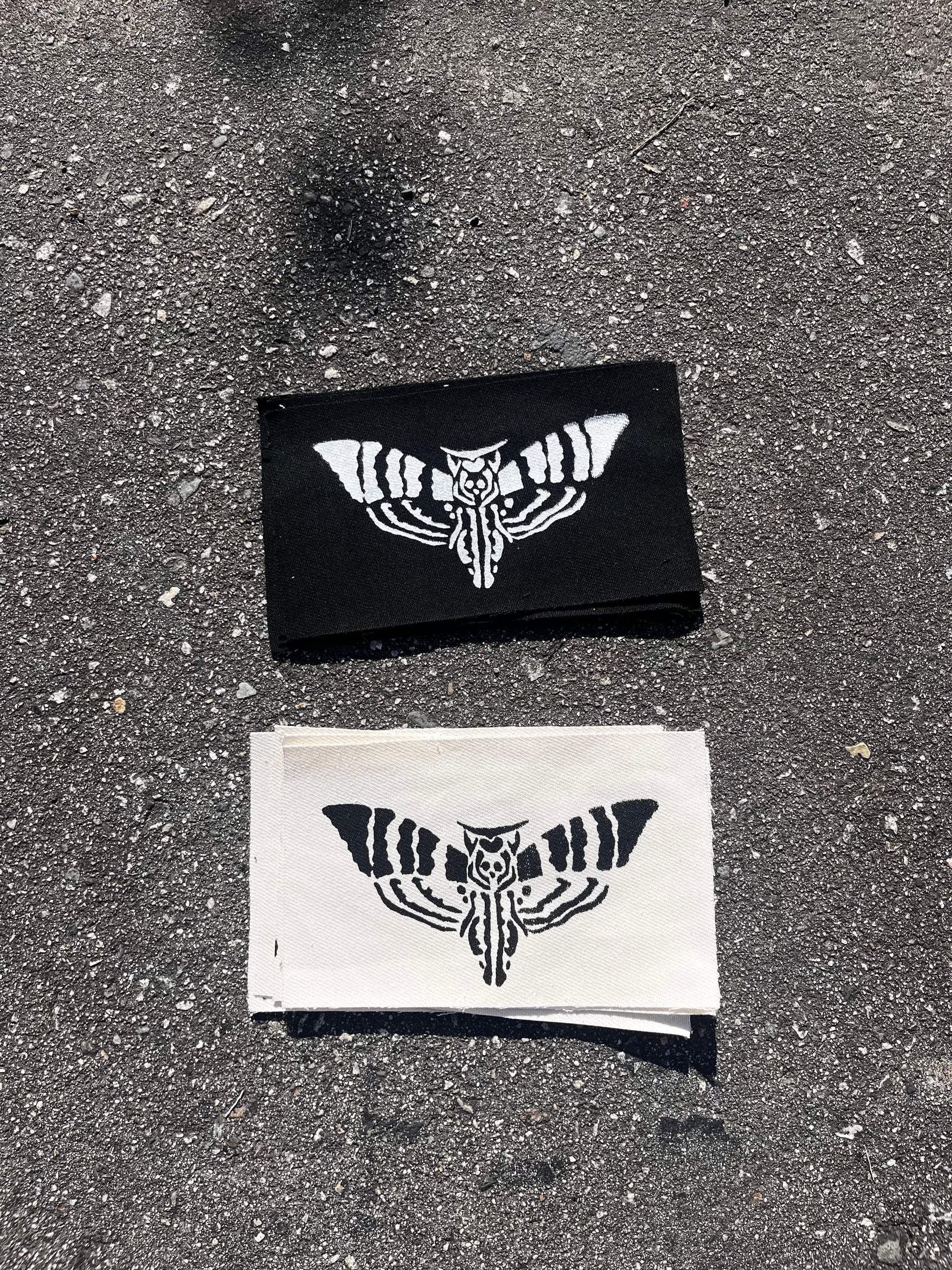 handmade screenprinted patches on nice thick canvas. they’re roughly 7x4 inches give or take a little extra/less fabric on the edges. ink is water based.