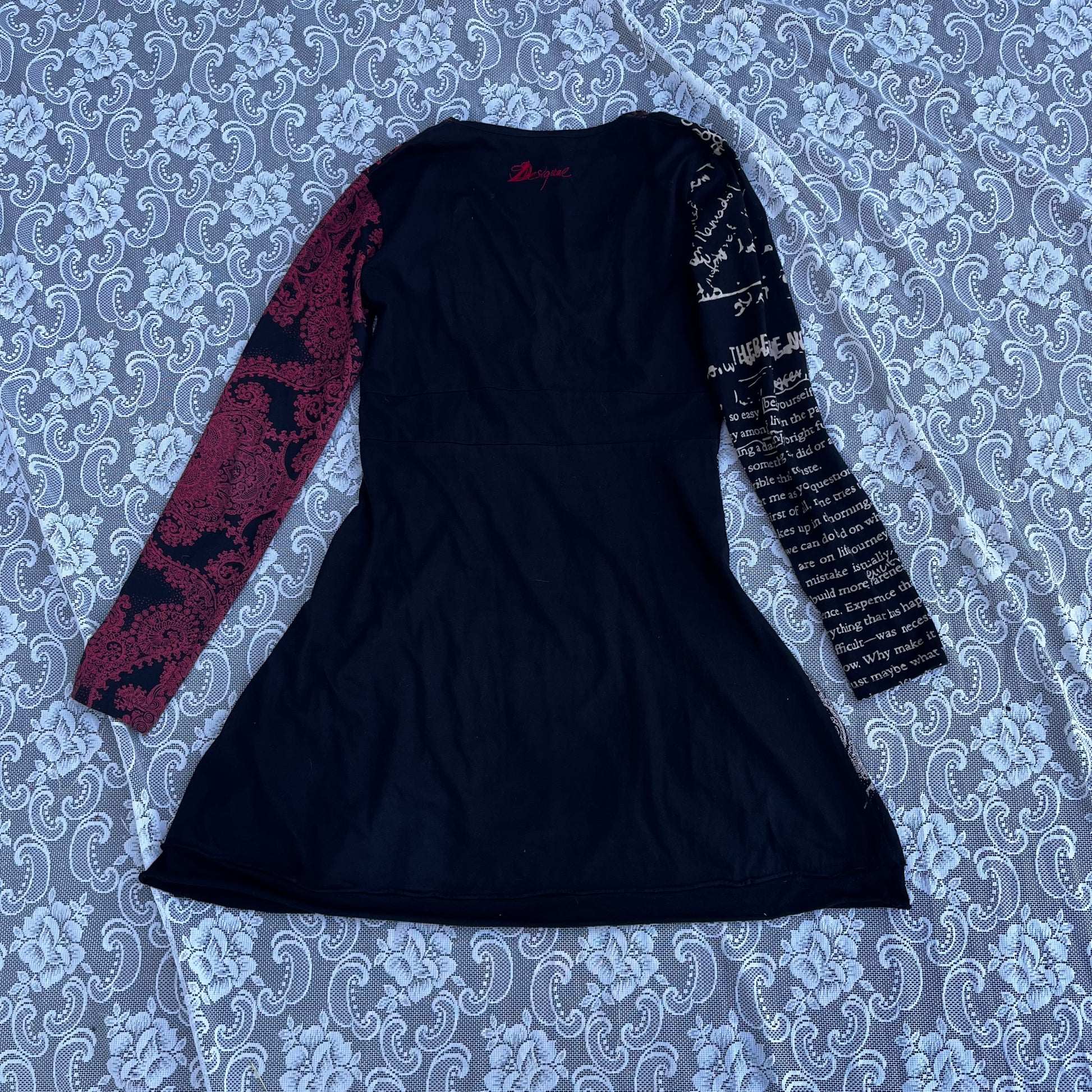 super rare designer unique piece. desigual is a spanish brand known for their bright colours n weird prints n this is a fine example. i call this the discharge dress because discharge has an album called “why”. fabric is stretchy and soft and comfy. doesn’t have a size listed but it’s probably small / medium. shoulder width is 15.5 inches. sleeve length 24 inches. waist 30 inches. length 33 inches.