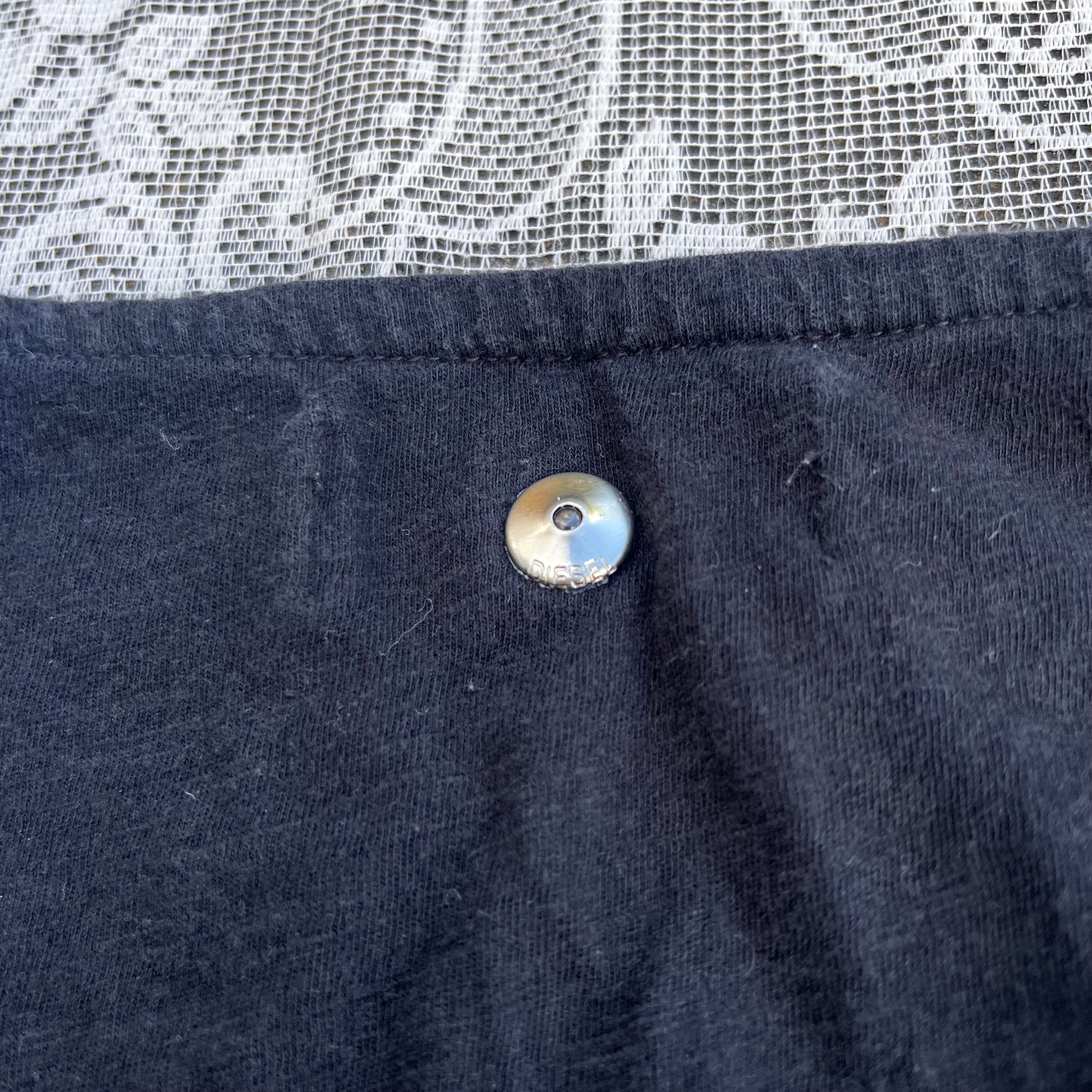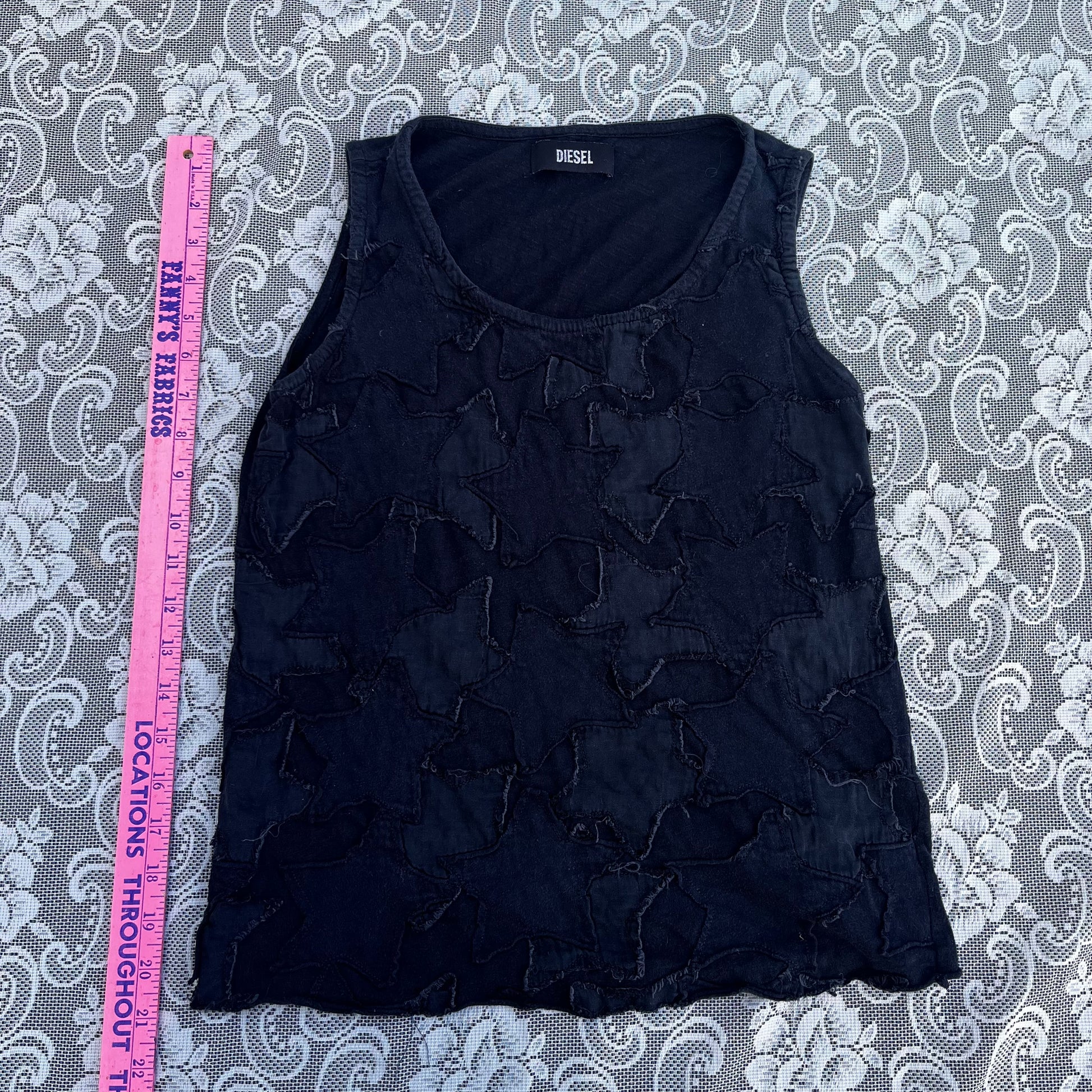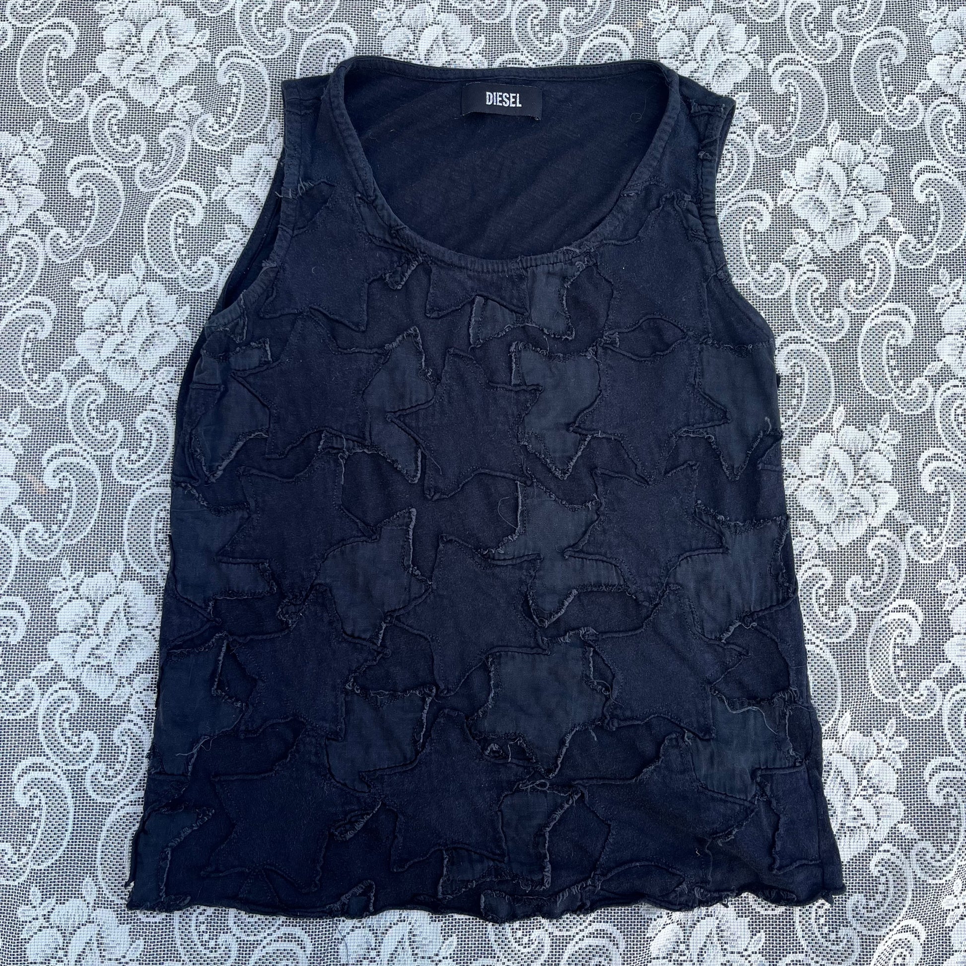 this is an insane piece. brand name asf. super cute awesome patchwork star design on the front. has a little silver diesel button on the back. tag doesn’t have a size but it’s probably small to medium. length is 21.5 inches. pit to pit is 17 inches. shoulder width is 12.5 inches. waist is 32 inches.