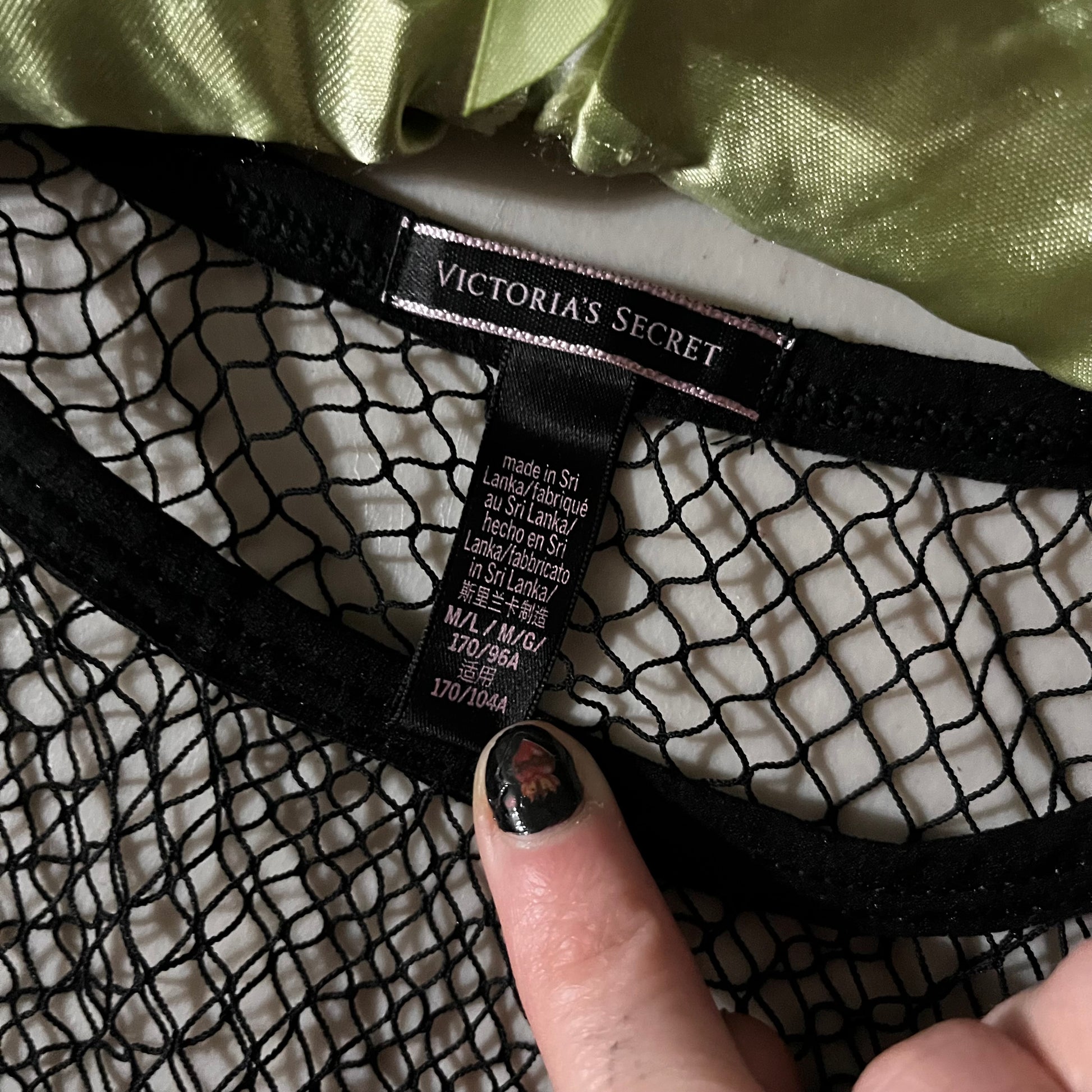 perfect fishnet shirt. except there is a little bit of tearing around the belly button area. probably from my belly button piercing i cannot lie. good ol VS, size M/L but fits small too. length 24 inches.