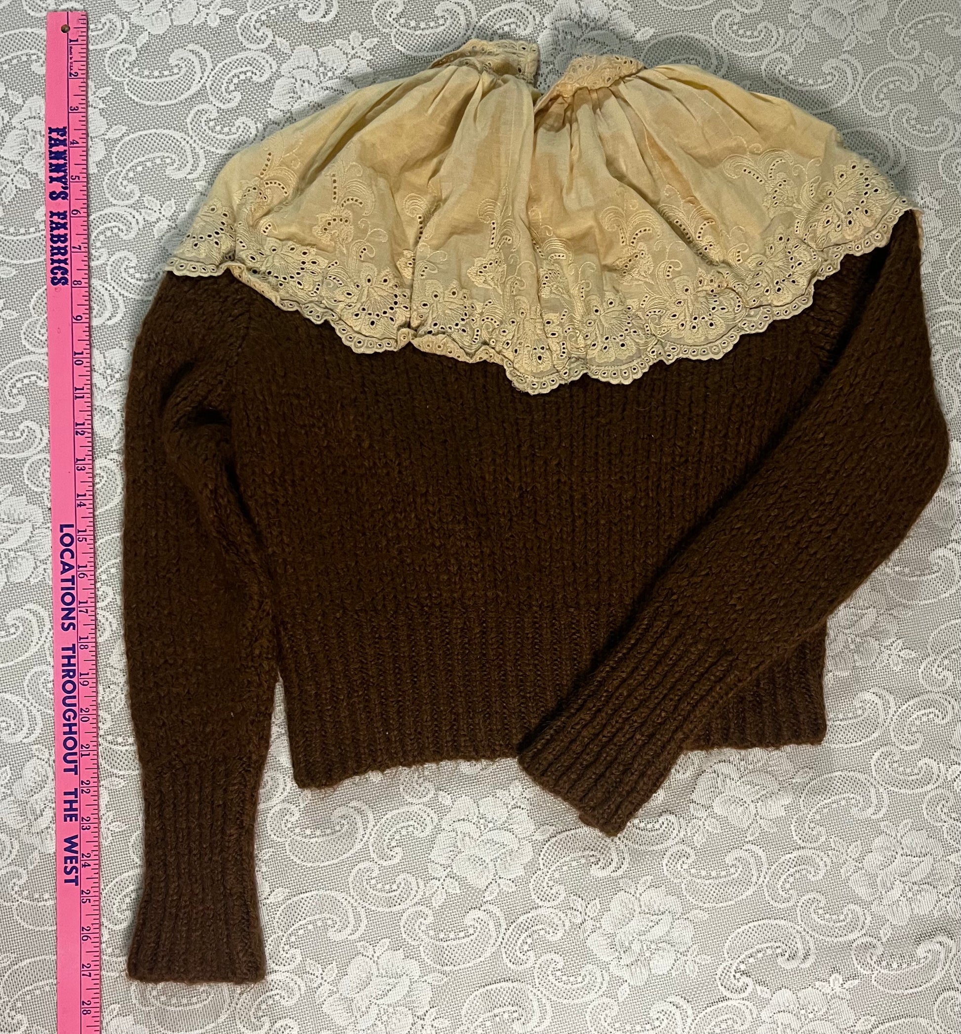 this is such a wonderful piece and i have so much context about it. ok so i got this piece thinking it was vintage and it’s so beautiful and soooo cute and so soft and warm. so unique. came to me without a tag so i was like hmmmm. come to find out it’s from zara!!!!!!!! so maybe not worth as much as i thought. but fuck it’s still a cute sweater. the bottom may even be some sort of cashmere blend cuz it’s so soft but idk cuz there’s no tag. lil button closure at the neck so u can put it on. length is roughly 19.5 inches. i had to price it this way due to the weight and cost of shipping