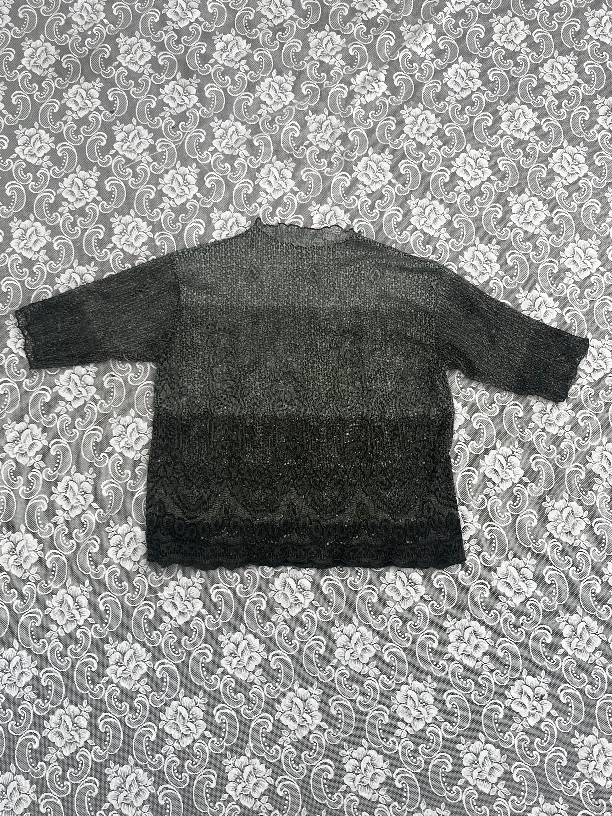 super cool layering piece. shades of green on see thru lacey textured fabric. no tag but it’s probably a size large. shoulder width 21 inches. sleeve length 12 inches. pit to pit 23 inches. length 24 inches.