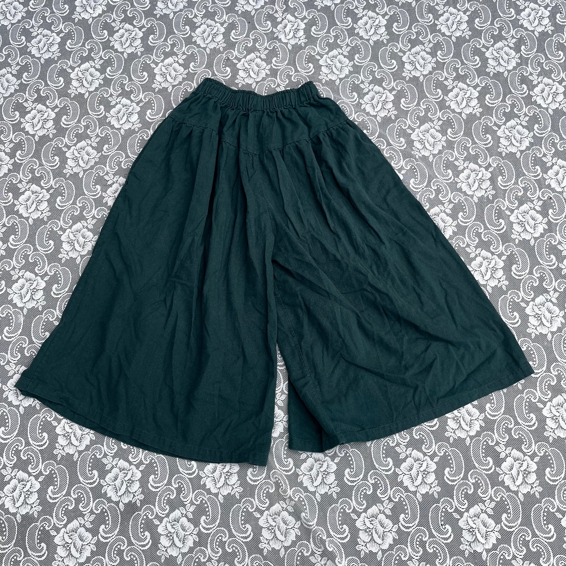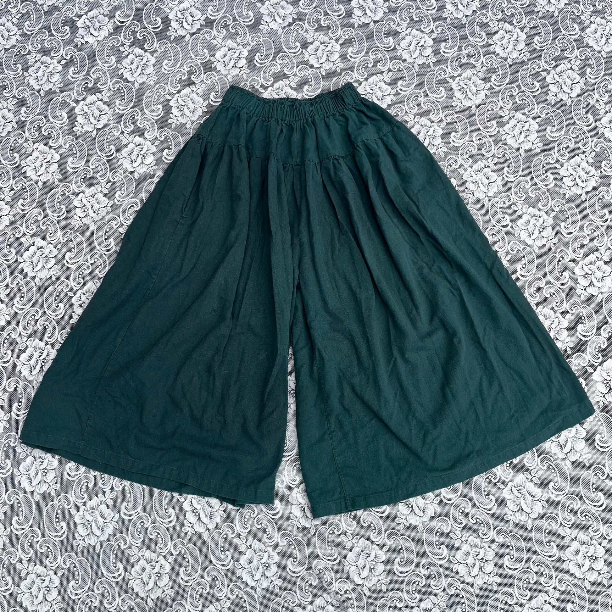 these rockkkkk. beautiful comfy wide leg pants that look like a skirt when ur wearing it. has POCKETS and they’re actually a good size. has some lil tiny paint stains. elastic waist that fits 24-30 inches. tag says “one size”. length is 30.5 inches.