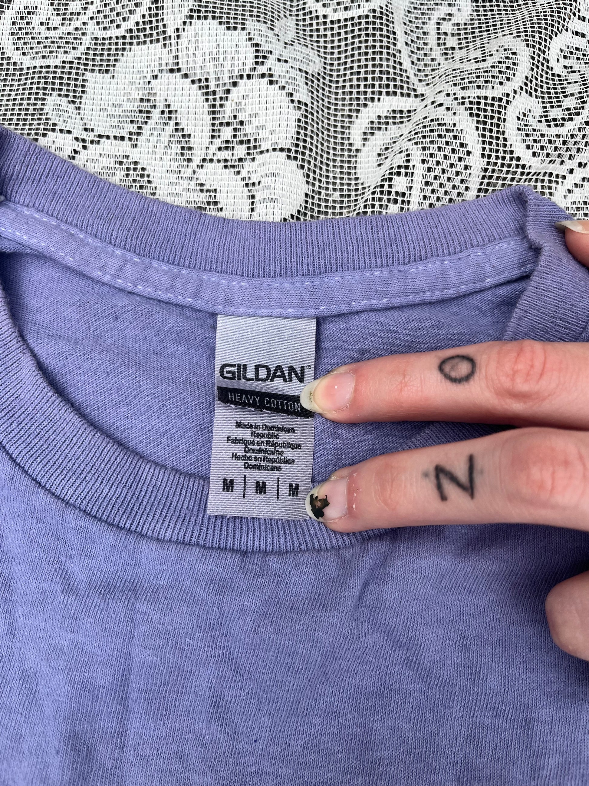 home dye job which had negative effects on the armpits of this shirt. priced accordingly. standard gildan size medium. shoulders 18.5 inches. pit to pit 19.5 inches. length 25 inches. sleeve 6.5 inches.