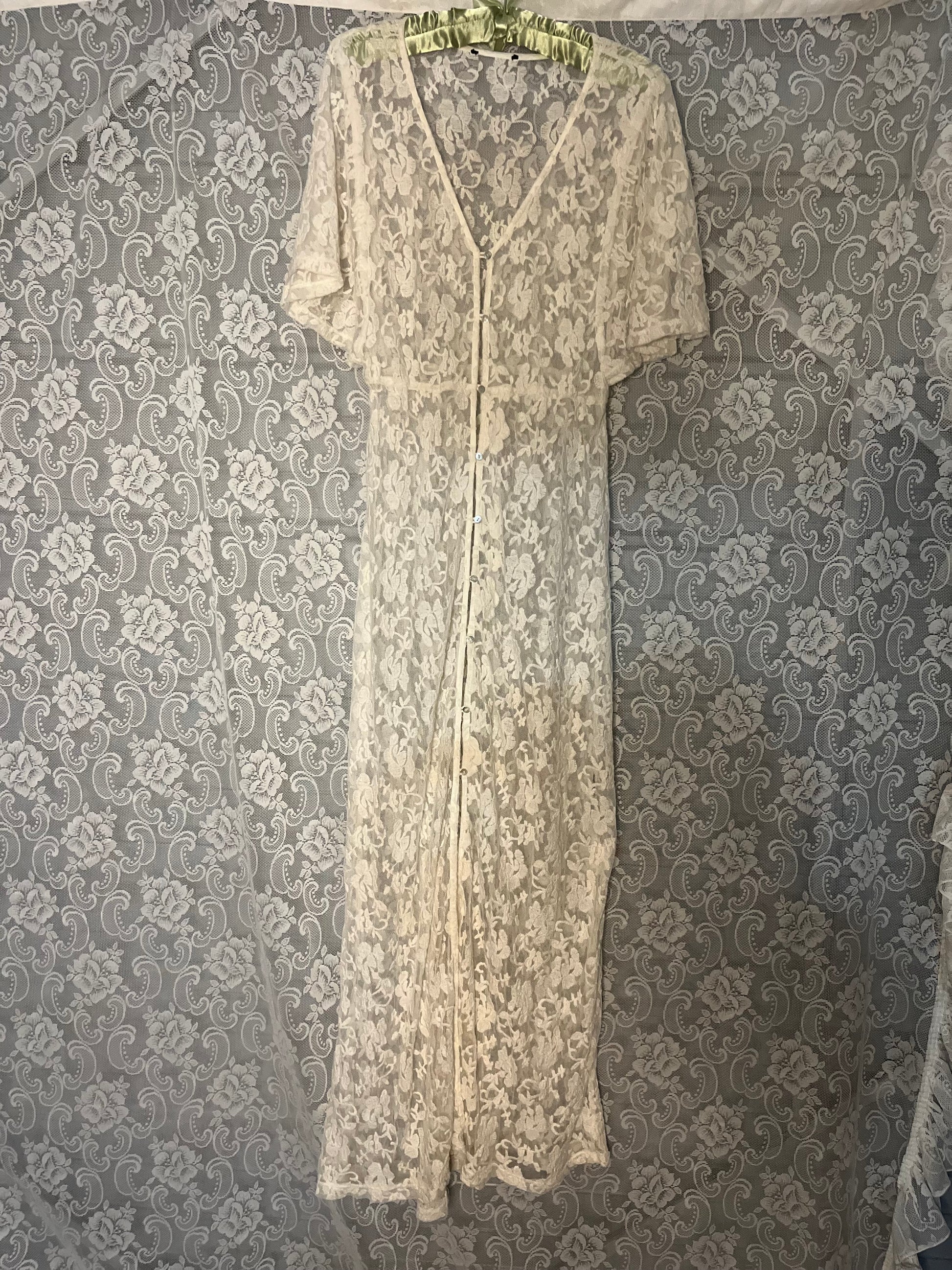 wonderful layering piece. whoooole thing is white lace n all the buttons are still intact. waist fits 26-34 inches and the length from top to bottom is 55 inches.