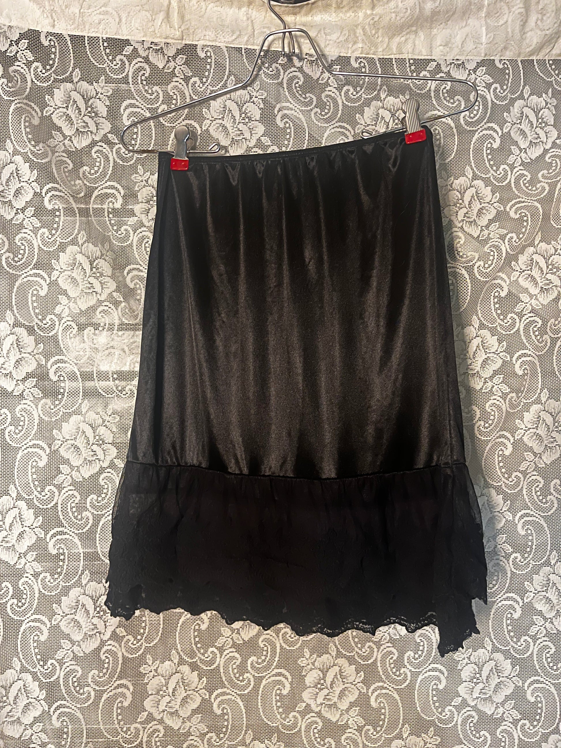 this slip skirt is quite sheer and has like 2 or 3 layers of lace trim at the bottom. waist fits 24-36 inches. length from top to bottom is 20 inches.