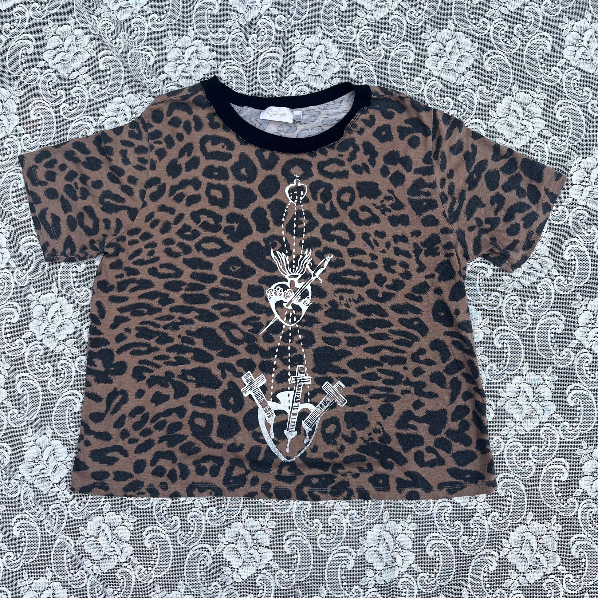 my diy screenprinted sacred heart design on a cool leopard print tshirt. has weird inside out looking seams around the collar but trust me that it’s the right way LOL. tag says size medium.