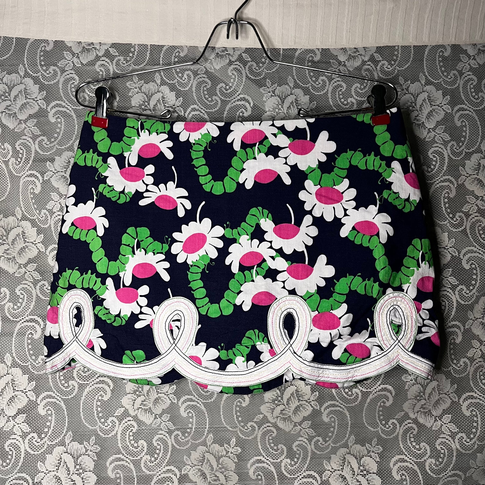 this is what i meant by bug farm vintage am i right!!!! super sweet short lil mini skirt. swirly trim and caterpillar n flower fabric. zipper in the back. tag says size 4. waist is 32 inches. length is 13 inches.