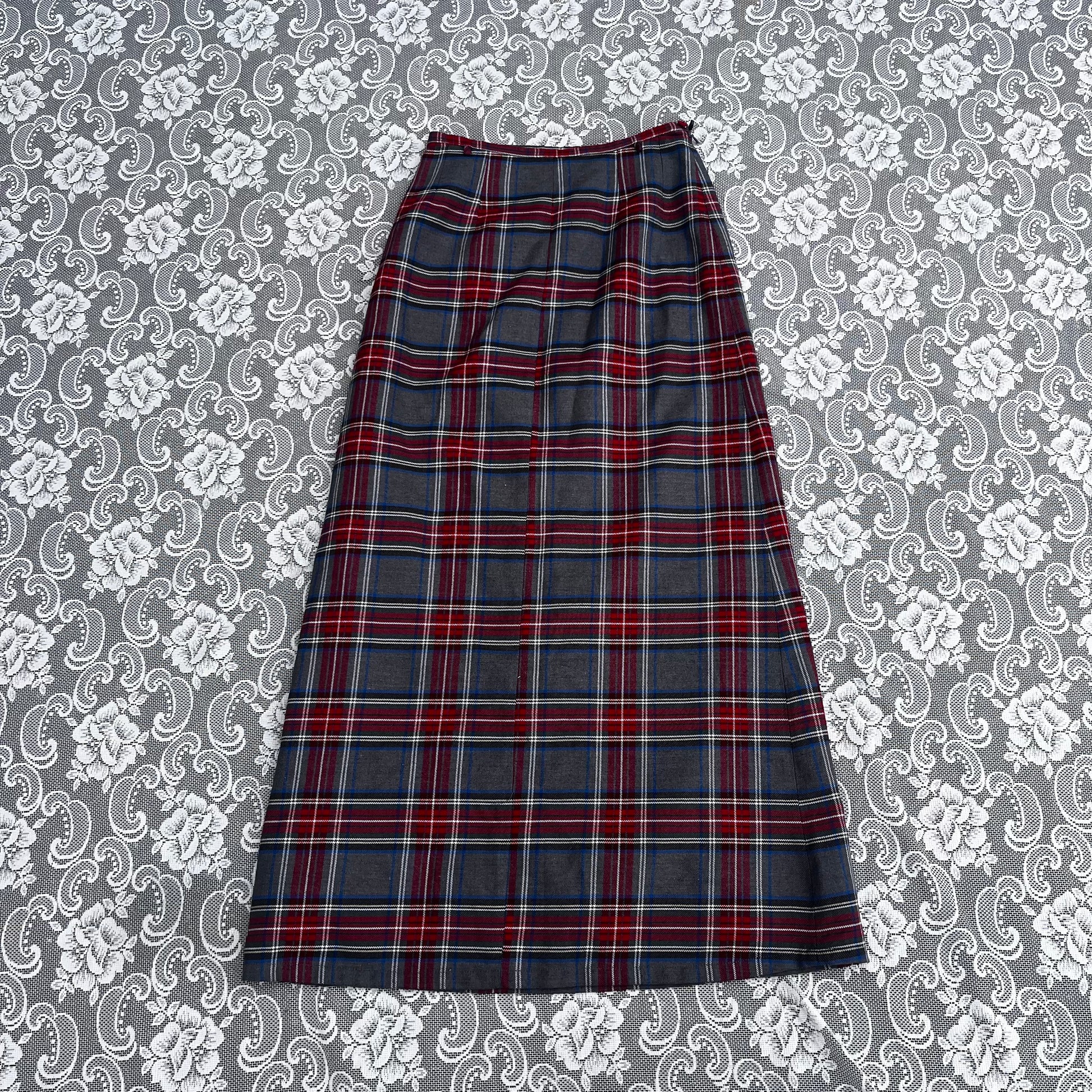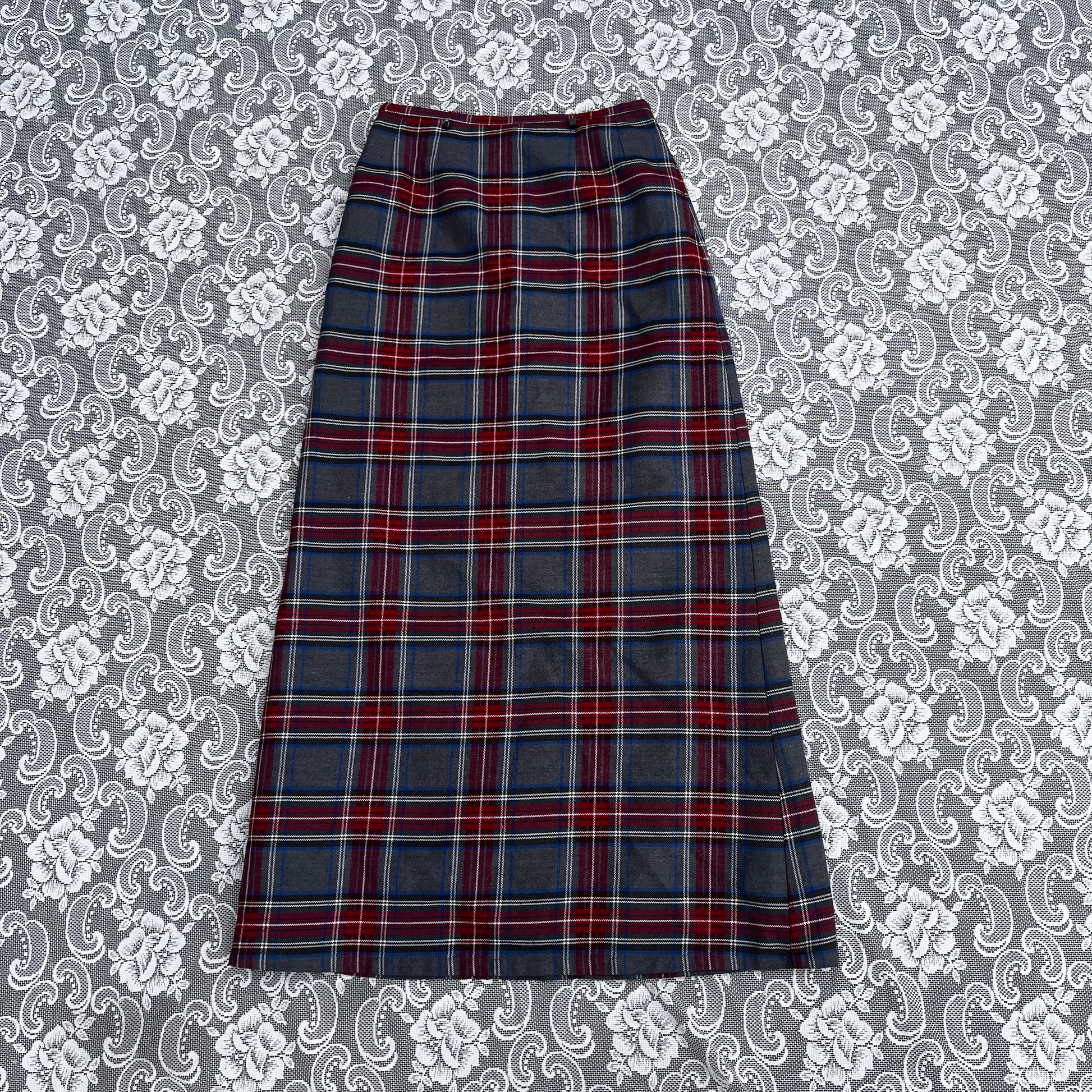 long grey n red plaid pencil skirt