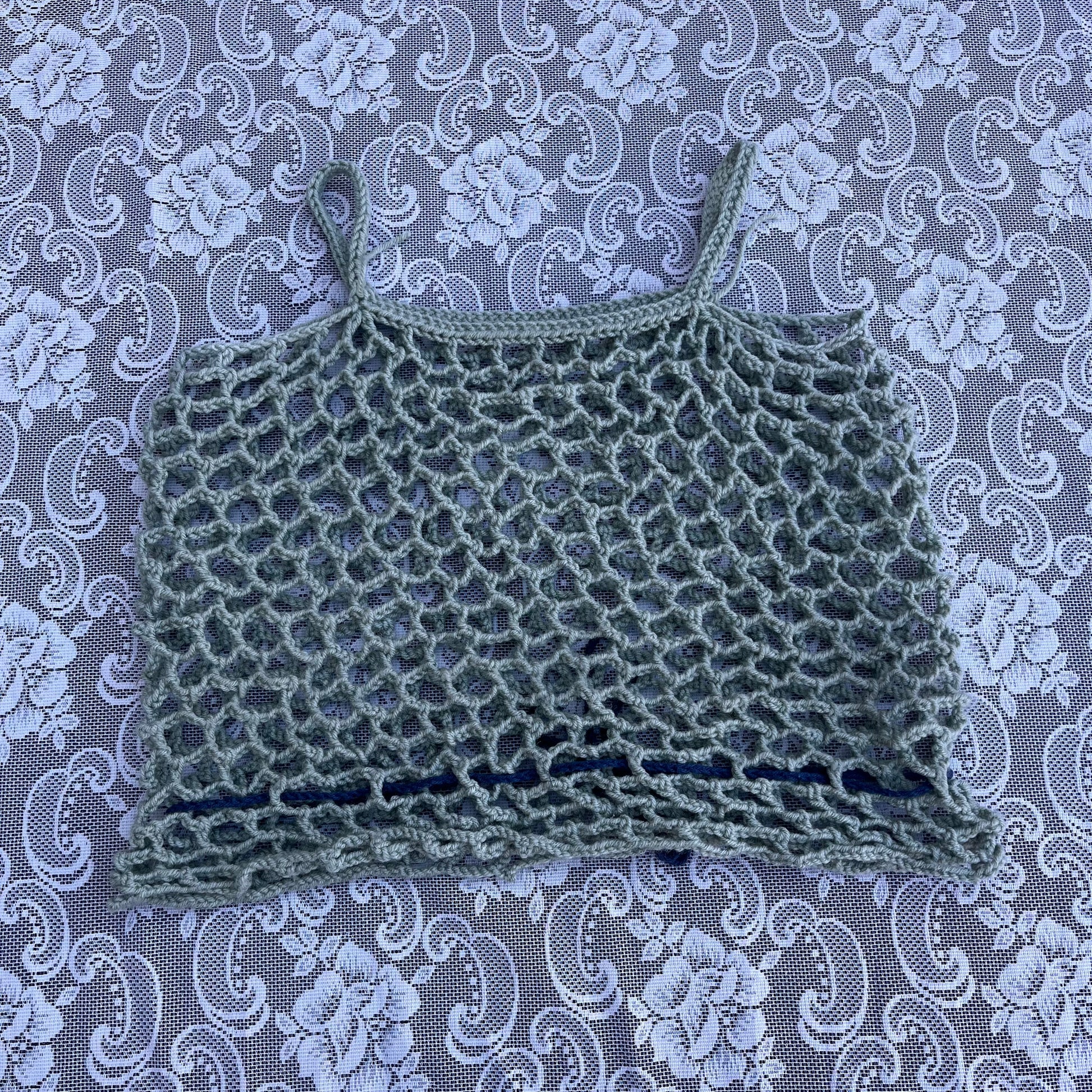 super cute lil knit top. handmade, no tag. has a lil blue drawstring at the waist. pit to pit 18 inches. length 13 inches. straps 9 inches.
