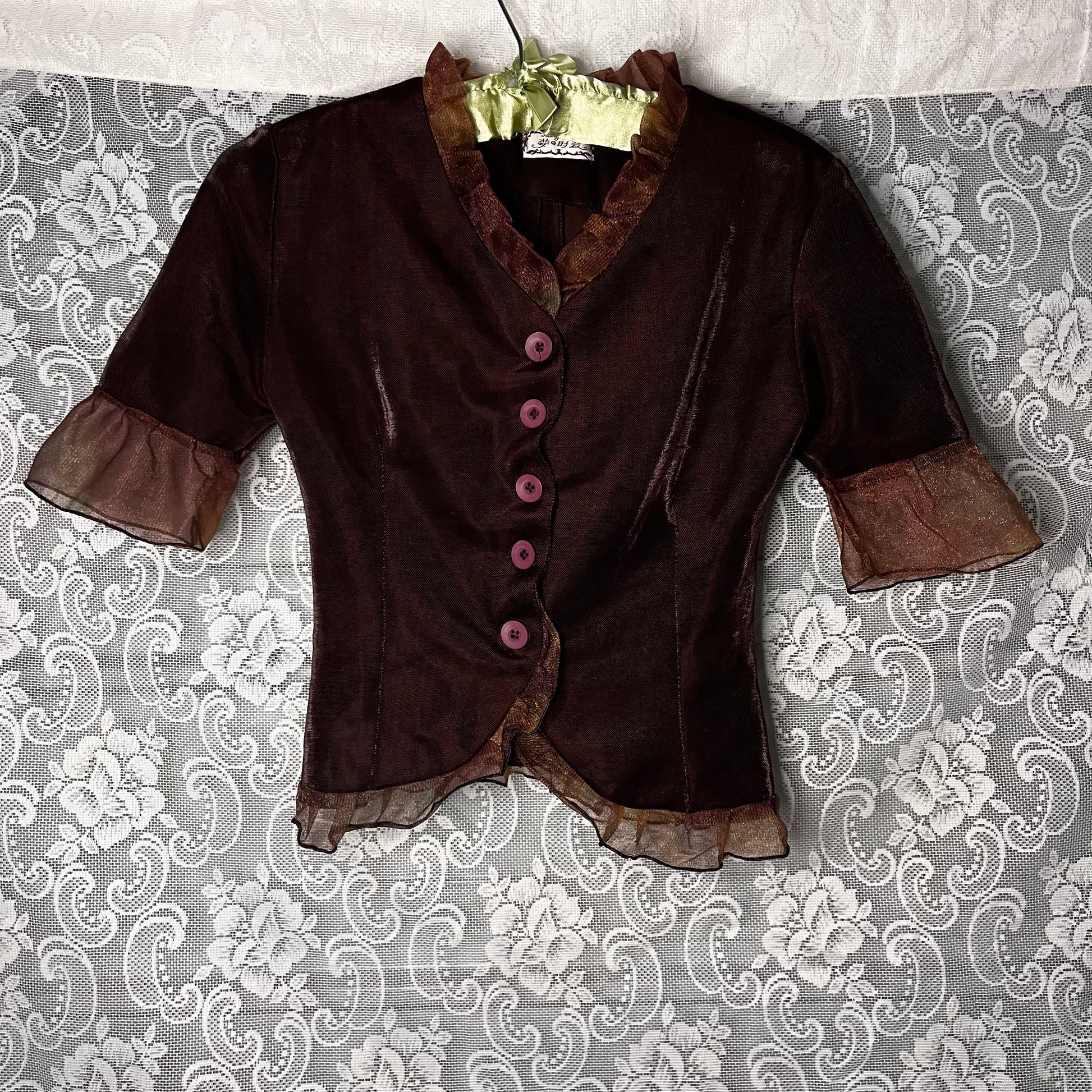 in my notes i did describe this as the cunty blouse. it is soooo cunty. very tight. has cute mesh trim on the sleeves n bottom n collar. all buttons intact. probably a size small or extra small. waist is 24 inches unstretched but 26 stretched probably. length is 17 inches.