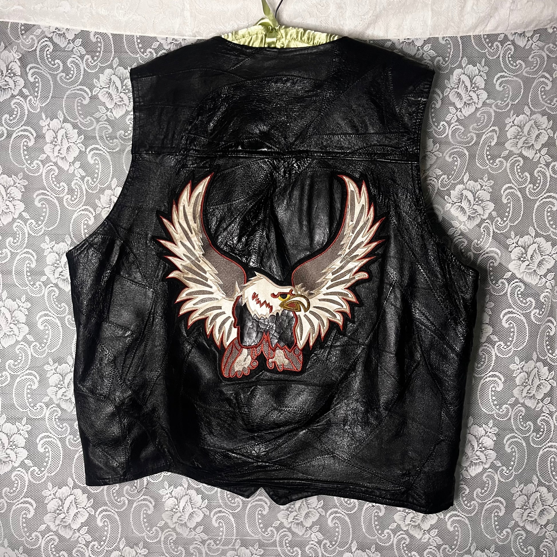extremely fucking awesome and iconic leather vest. patchwork leather. definitely some holes in it, patched up with safety pins. giant fucking eagle patch on the back. size XL. chest circumference is 50 inches, length is 27 inches.
