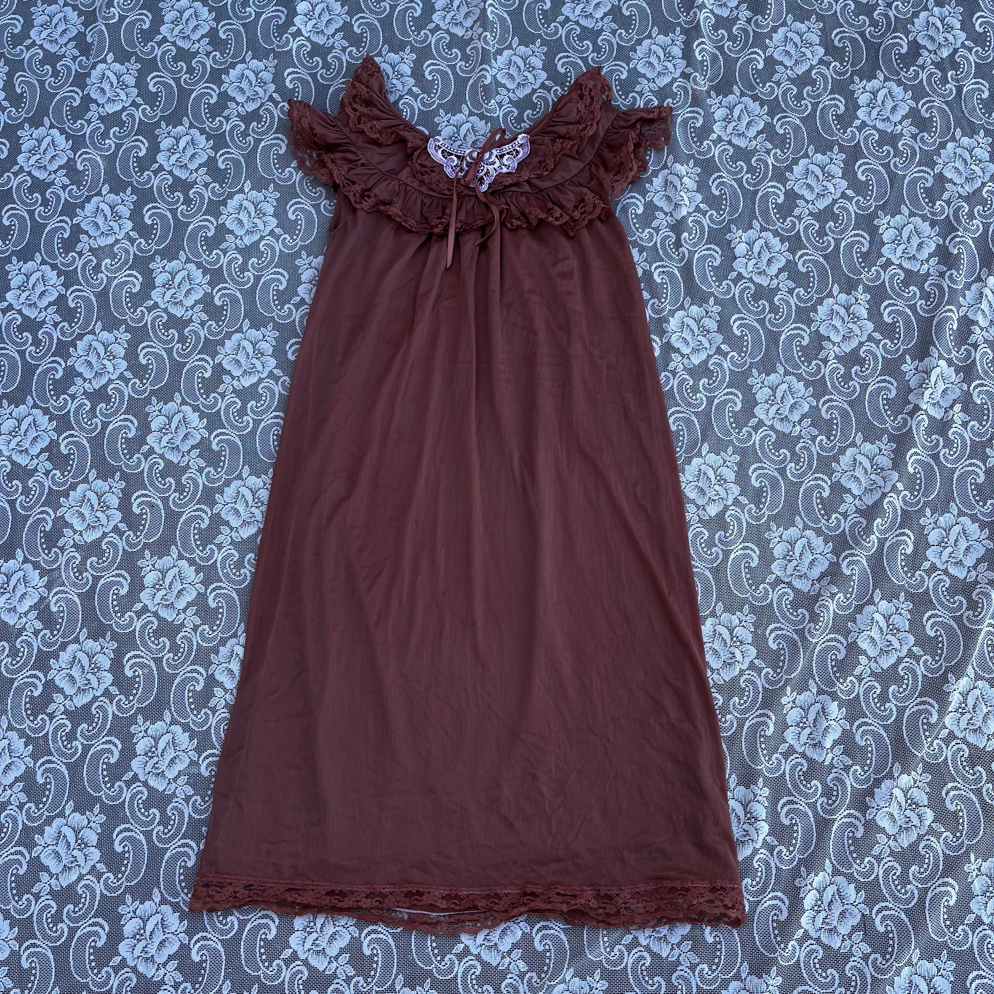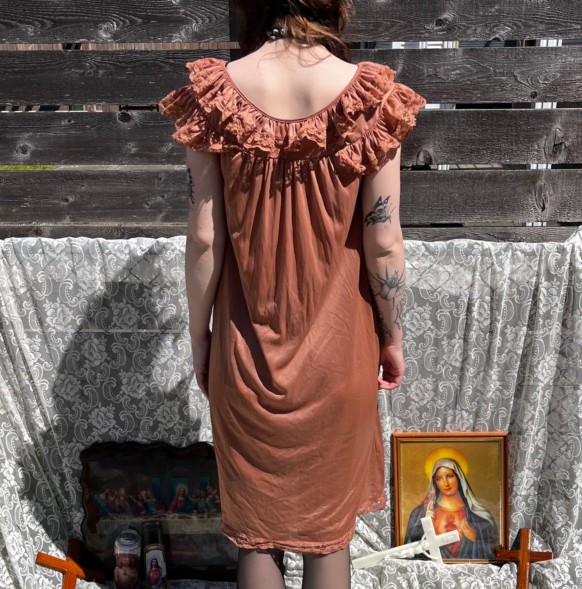 this one has no tag so i cannot date it properly but it looks to be 80s. this one is hand dyed as well but the dye didn’t grab as well so it’s still quite pinkish! head hole is 13 inches. shoulder width is 17 inches. pit to pit is 19 inches. length is 40 inches.