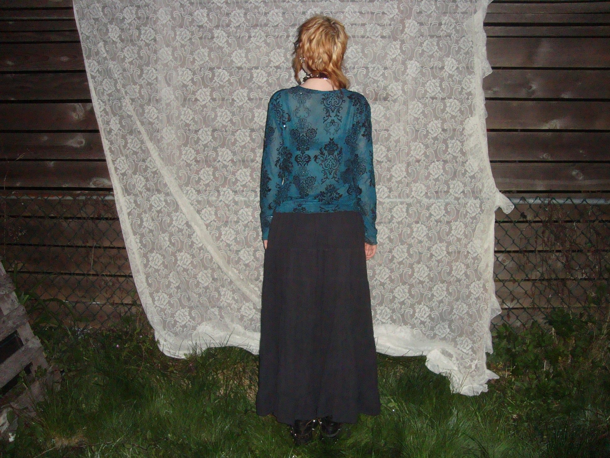 printed sparkly semi sheer teal long sleeve