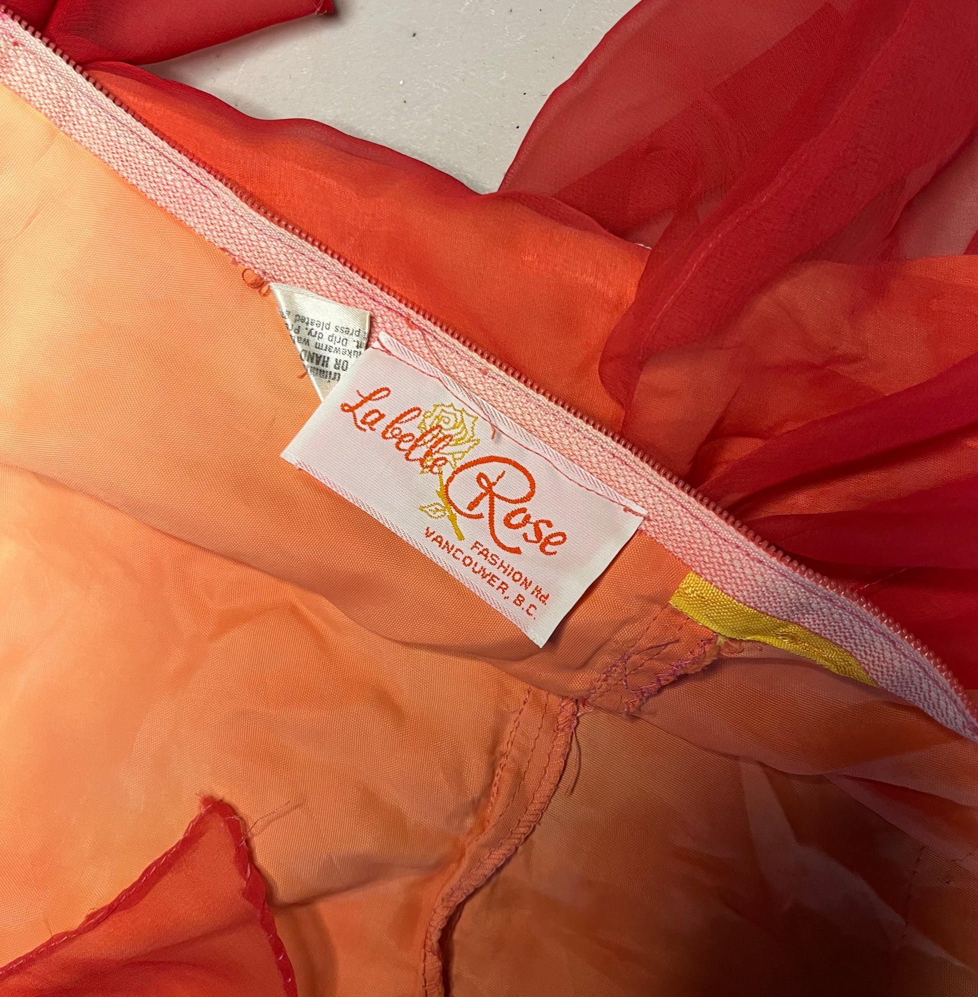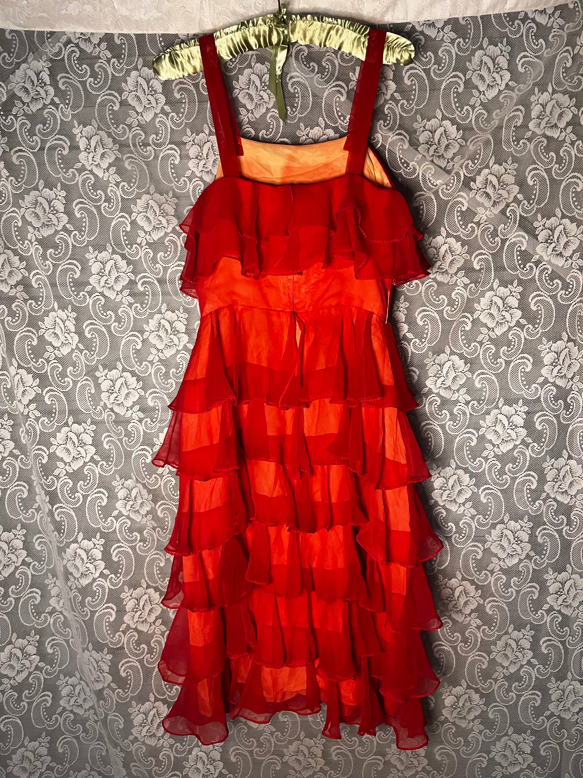 fun flowy lil number, it’s tricky to date this piece cuz it’s in beautiful shape and the brand is totally untraceable on the internet but it kinda reads as 50s-60s??? not super sure tho. length is 41 inches and the tightest part at the waist is 26 inches. it does zip up the back!