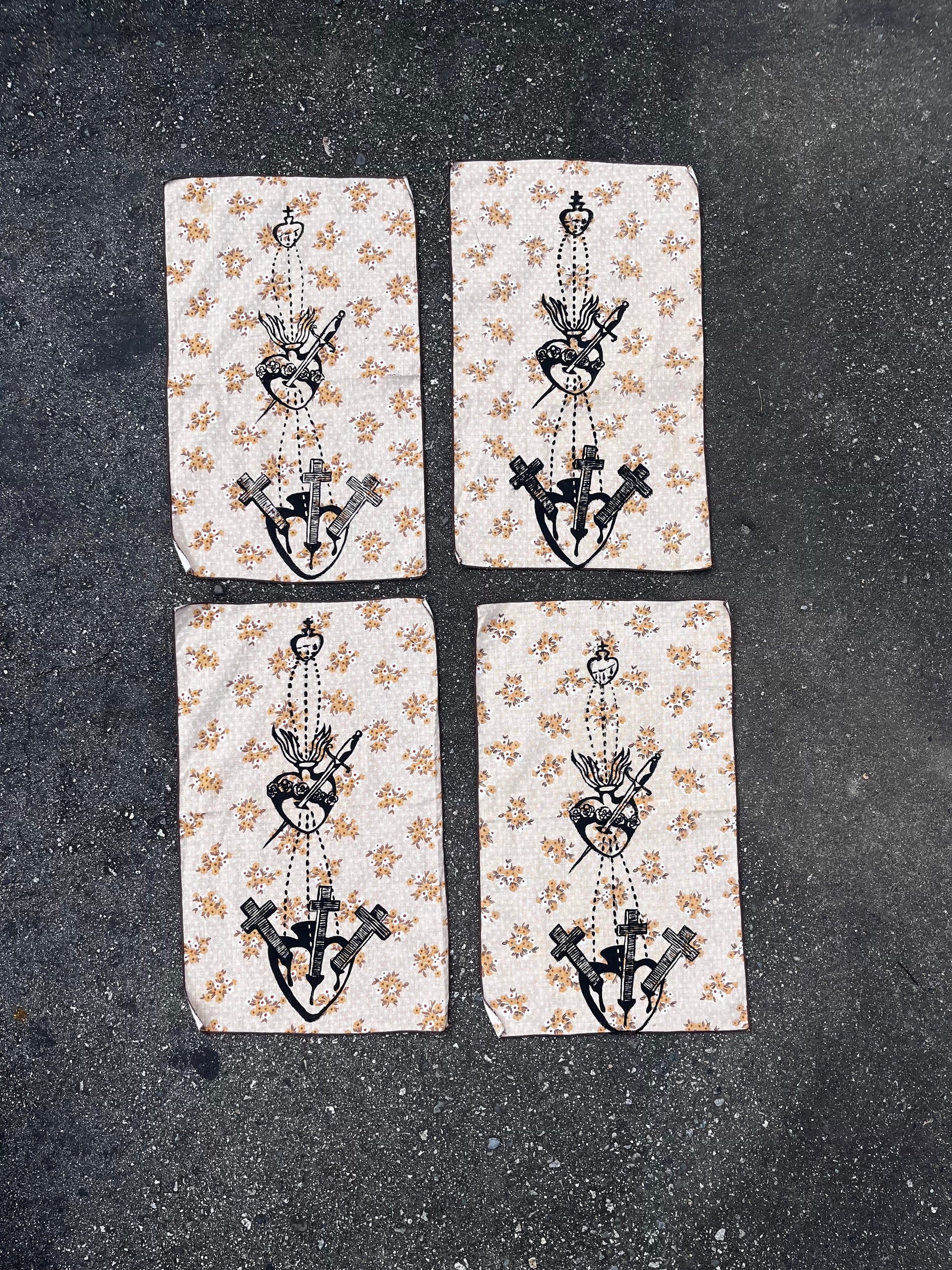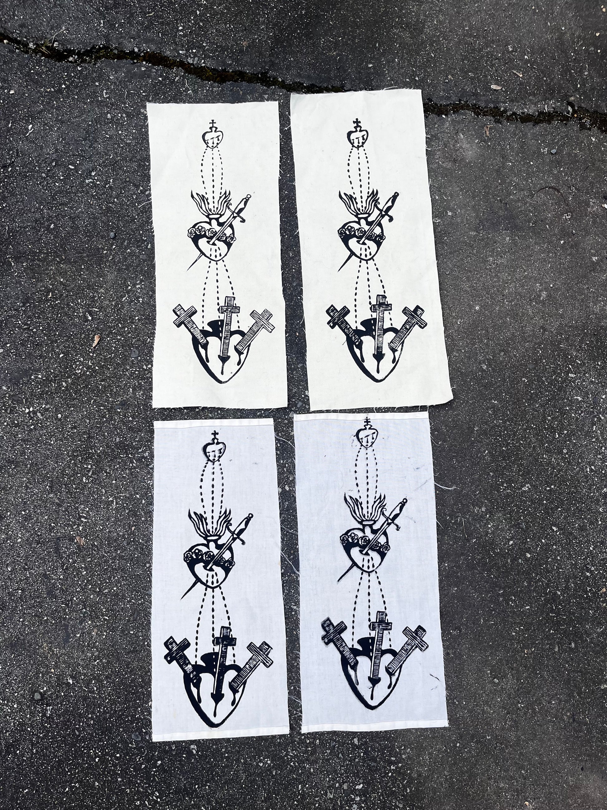 hand made hand screenprinted patches based off a design from a 1920s prayer card but redesigned by me. the design itself is 15 inches long and 5.5 inches wide, and the patches kinda vary in size depending on the fabric. all patches r handmade so there’s a chance that there’s ink spots n lil mess ups , everything is as-is! flower fabric is v limited edition but i can make more of the black n white ones!