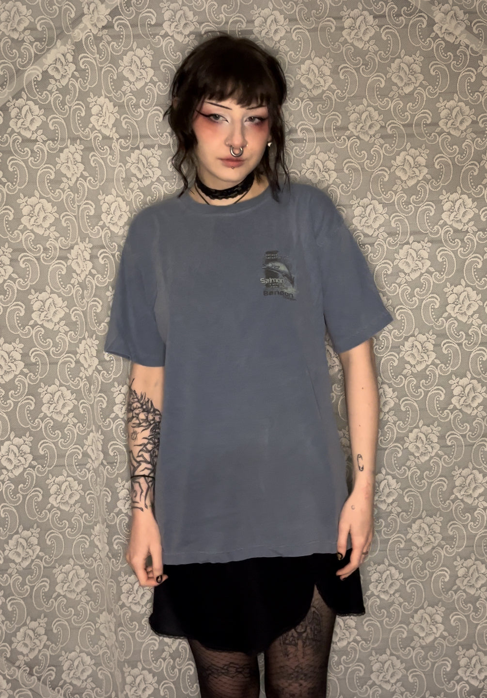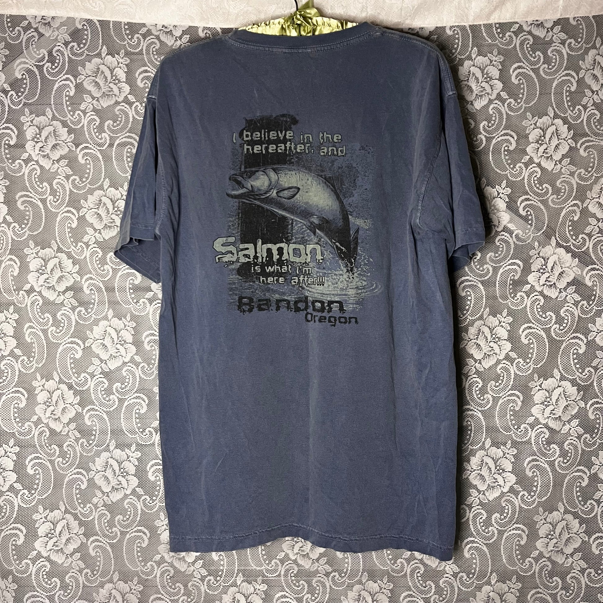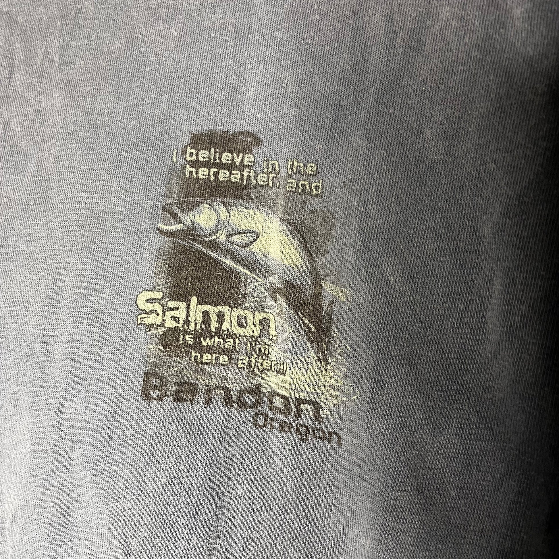 awesome fish graphic. “i believe in the hereafter. and salmon is what im here after!!! bandon, oregan” xoxox beautiful couldn’t have said it better myself. small version on the front and big version on the back. size medium.