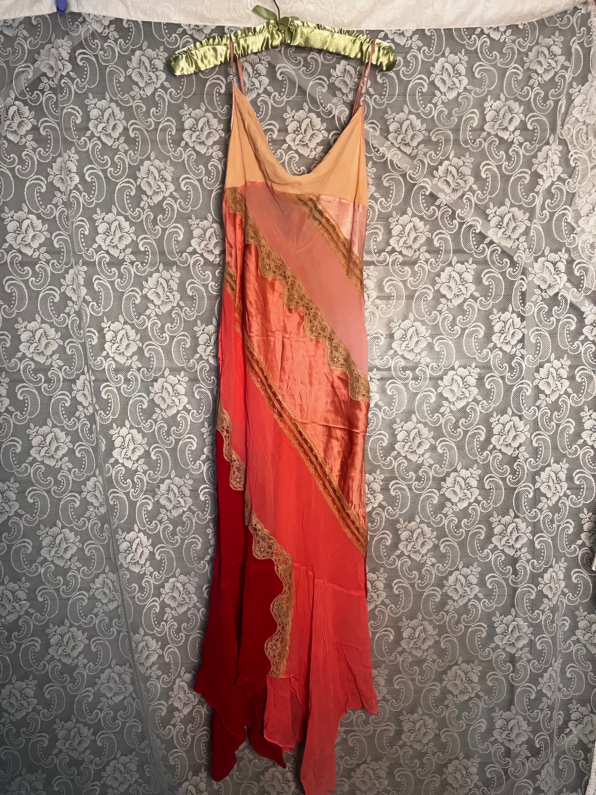wonderful unique slip. dress has a bunch of different types of silky fabric in different shades of pink, separated by strips of off-white/tan lace. open back with a little tie. size would probably be a small. waist is 30 inches and the length is varied because there’s little protrusions on the bottom but it’s 46 inches at the short parts and 52 inches at the long parts.