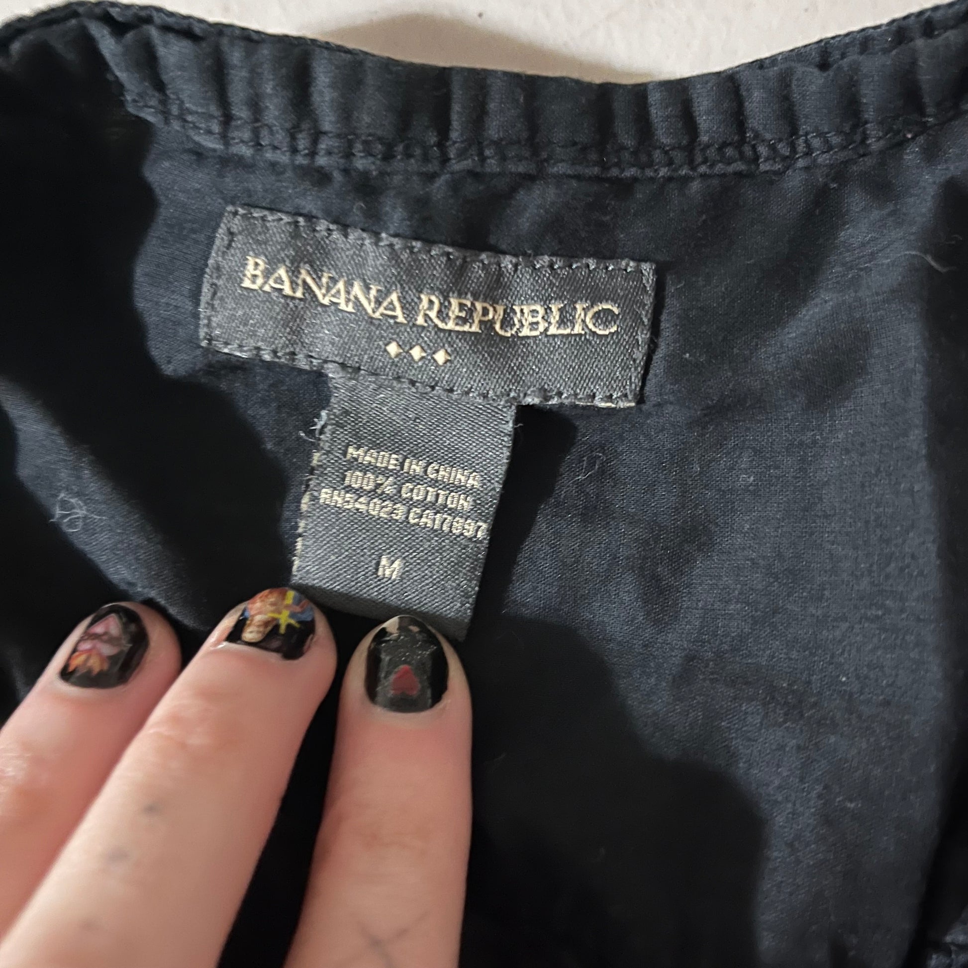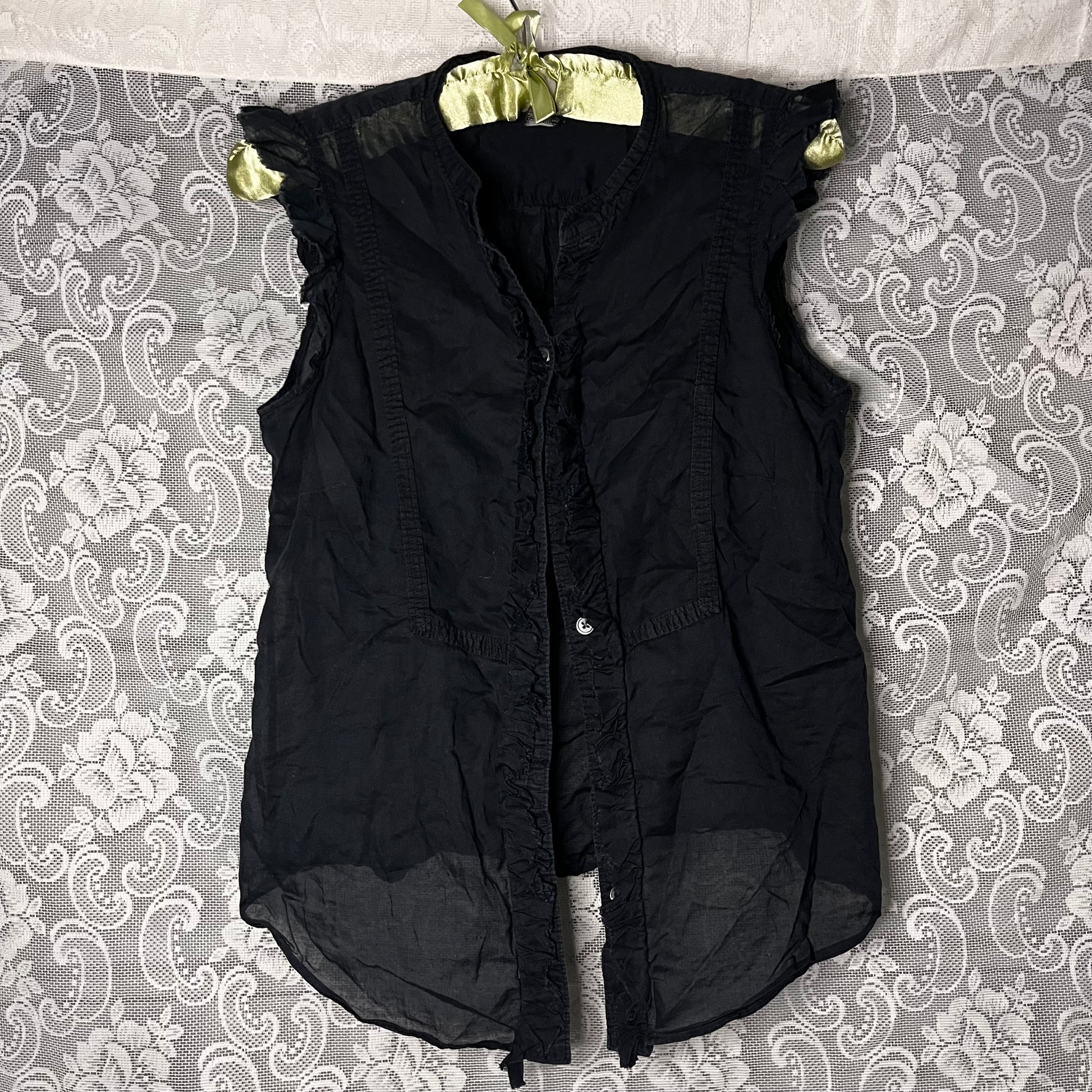 beautiful awesome piece from banana republic. ruffles around the buttons and also the shoulders which looks dope. pretty sheer tbh. size is medium. waist is 34 inches. length is 24 inches.
