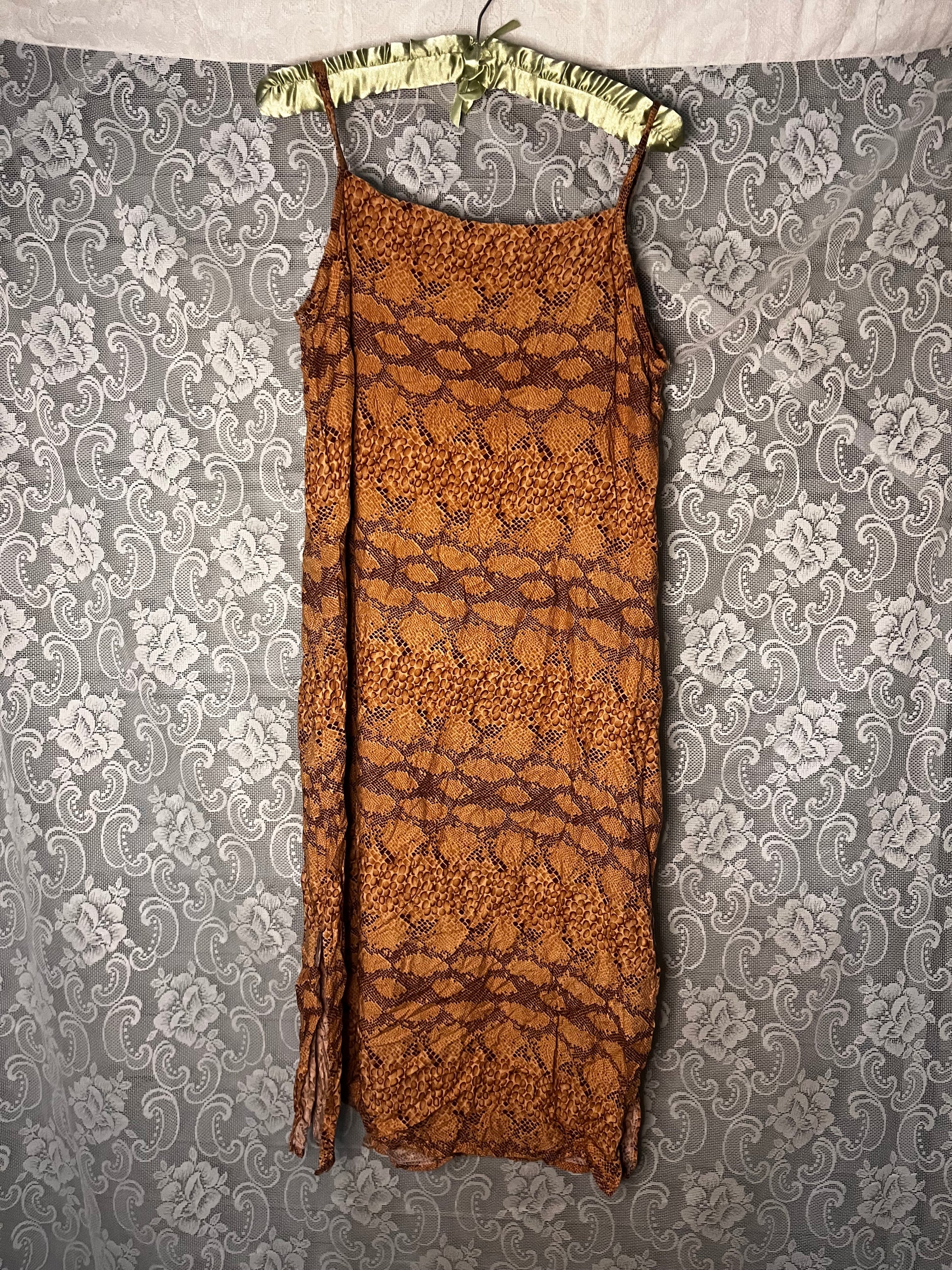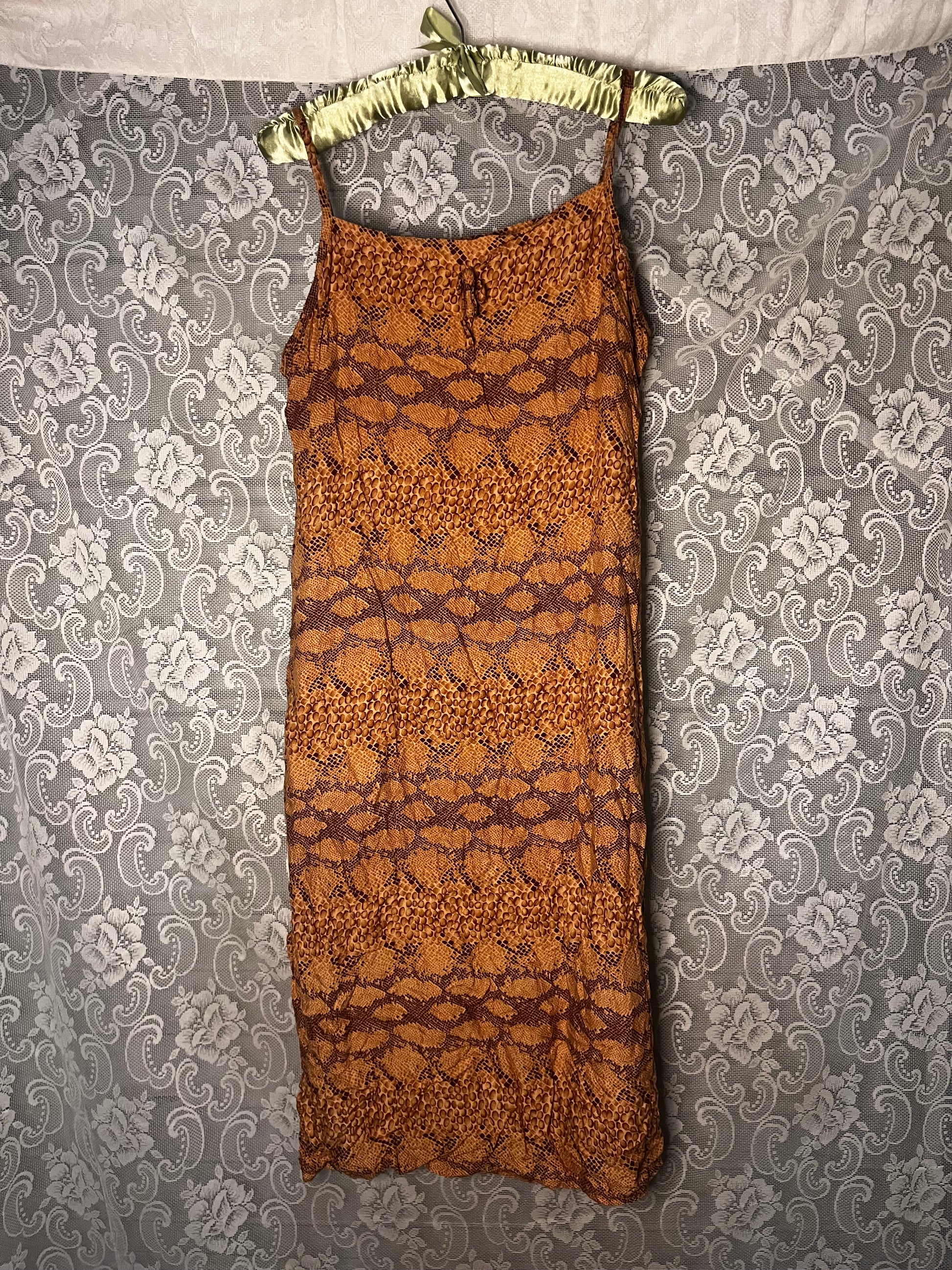 this dress rocks it’s got snake skin print. it has one singular pocket on the side amen. no tags or anything but the length from straps to bottom is 40 inches, and it’s more of a free waist that goes to 38 inches. i would call it a size medium probably.