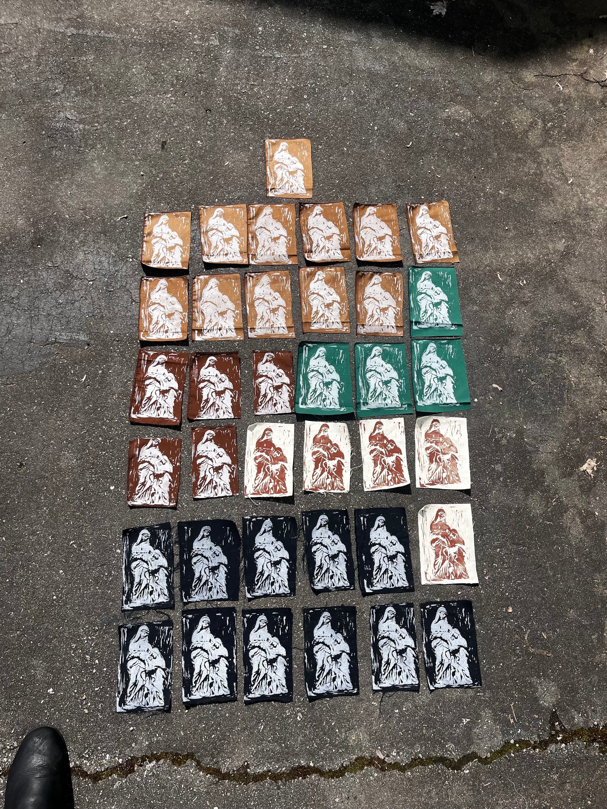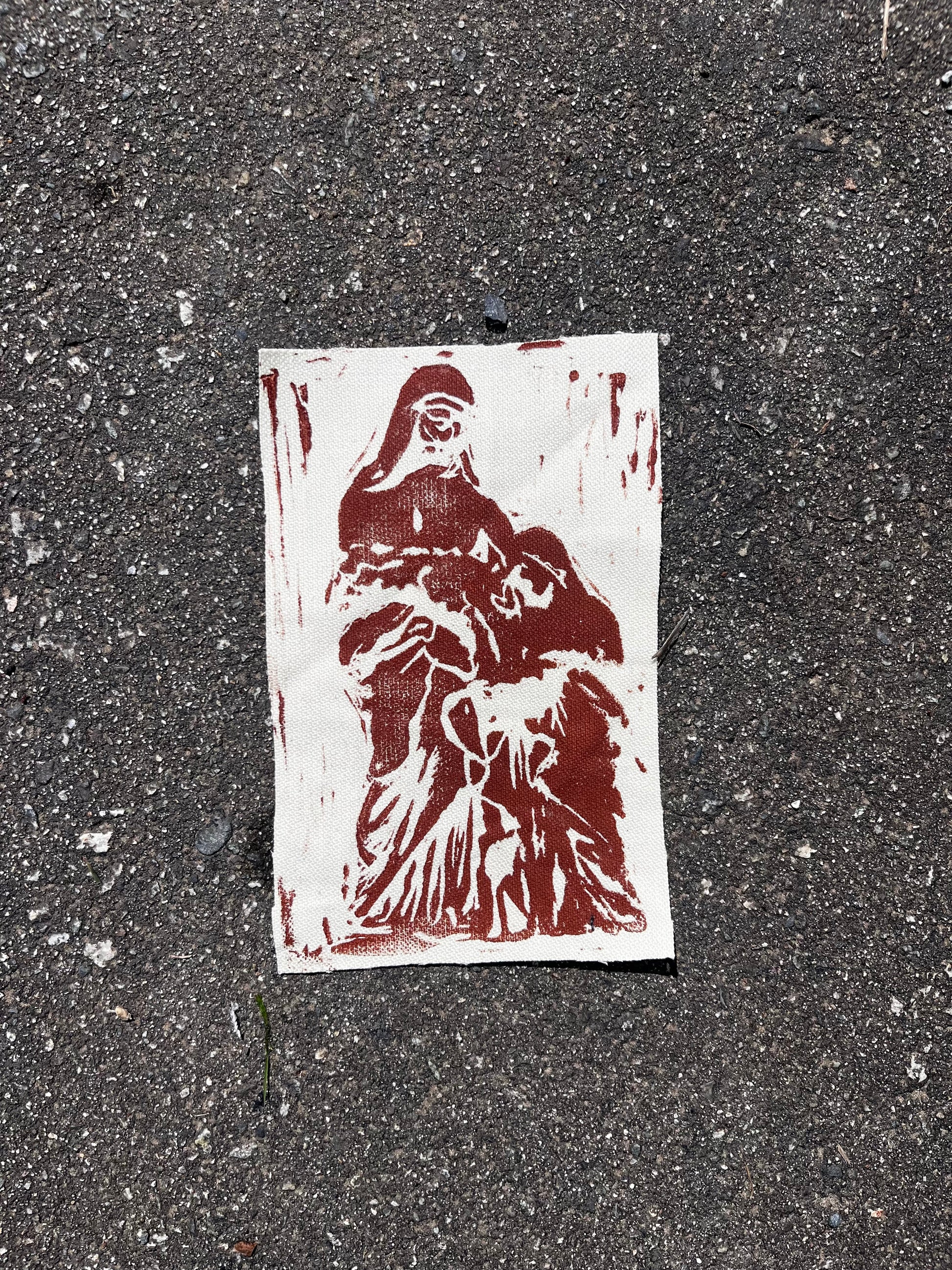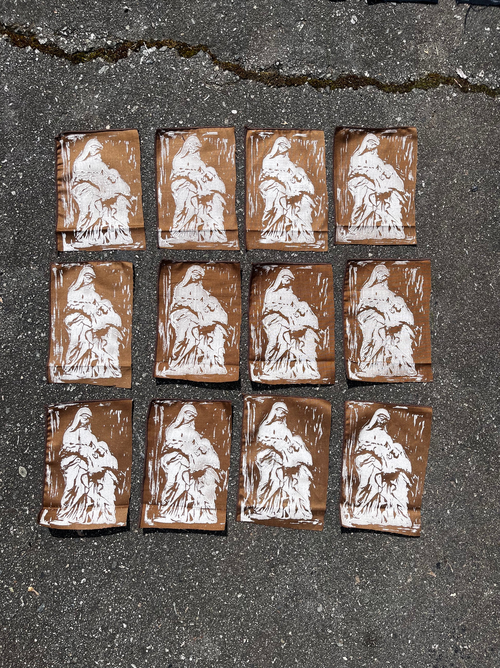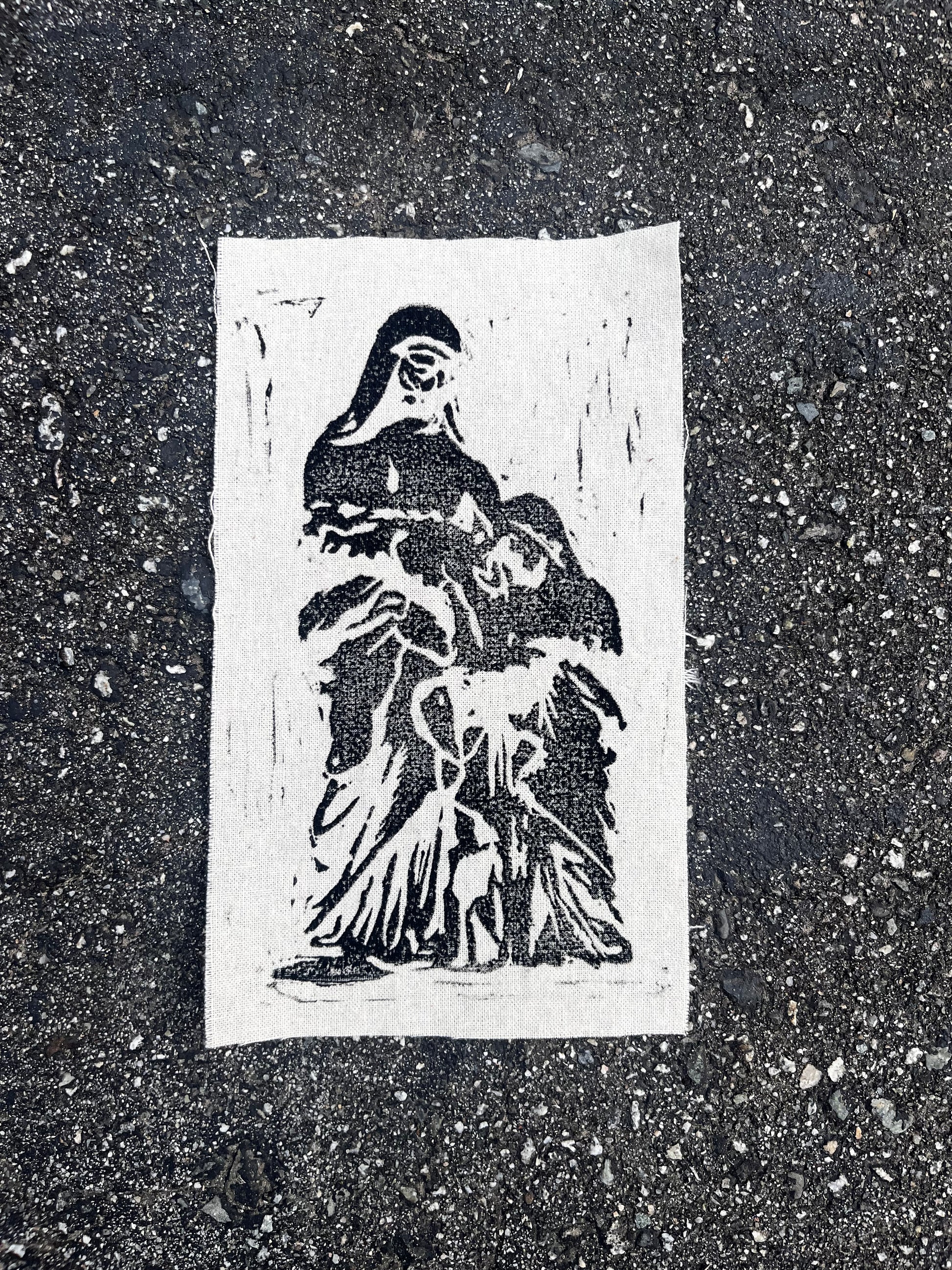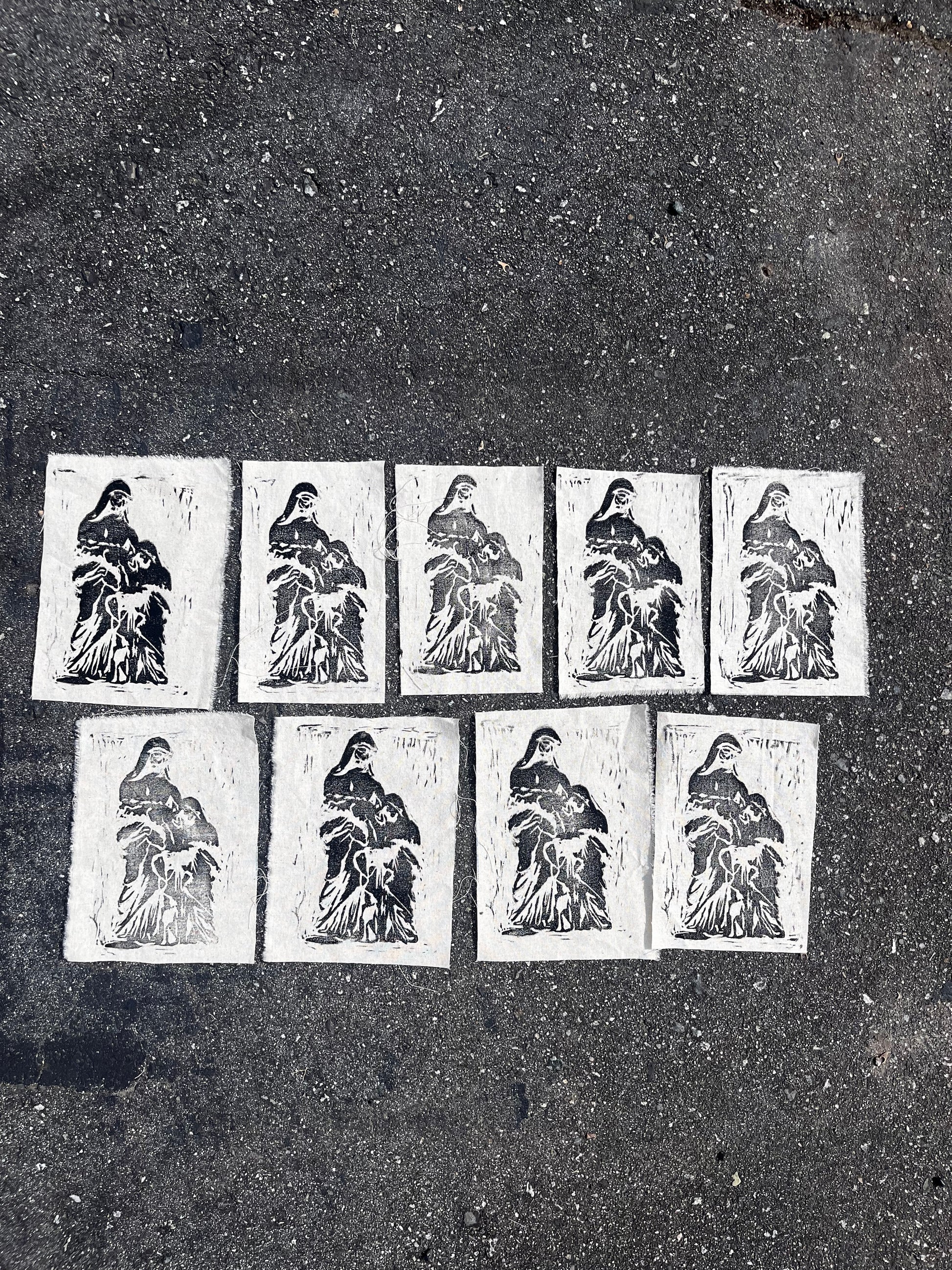 hand made block printed patches of st anne de la pointe. based on an old prayer card that reads “bonne st anne de la pointe au pere priez pournous.” but designed n made by me. oil based ink on various fabrics. patches are roughly 4x6 inches with slight variations. ones on lightweight fabric, most have 2 sides serged cuz it was a corner.
