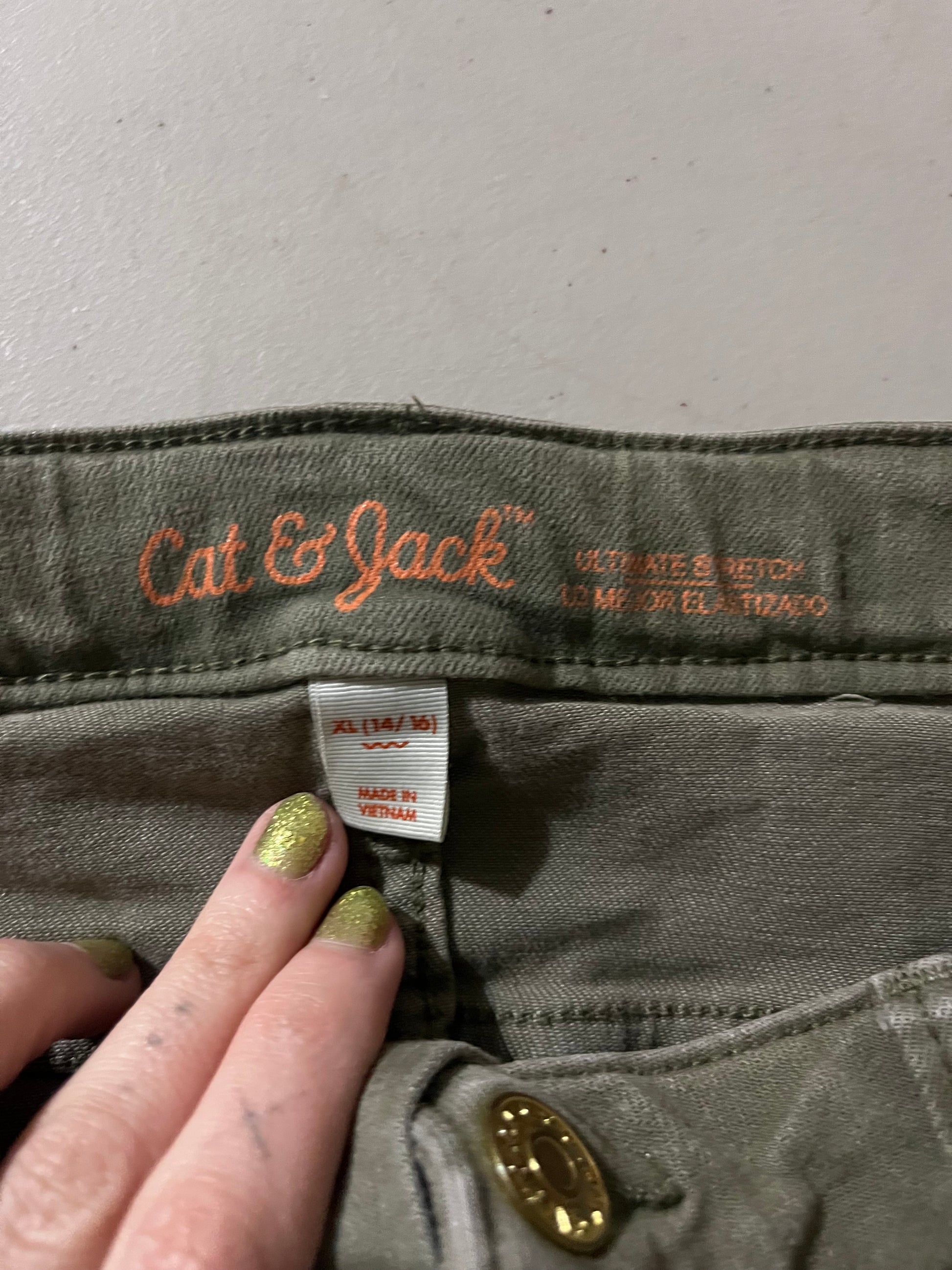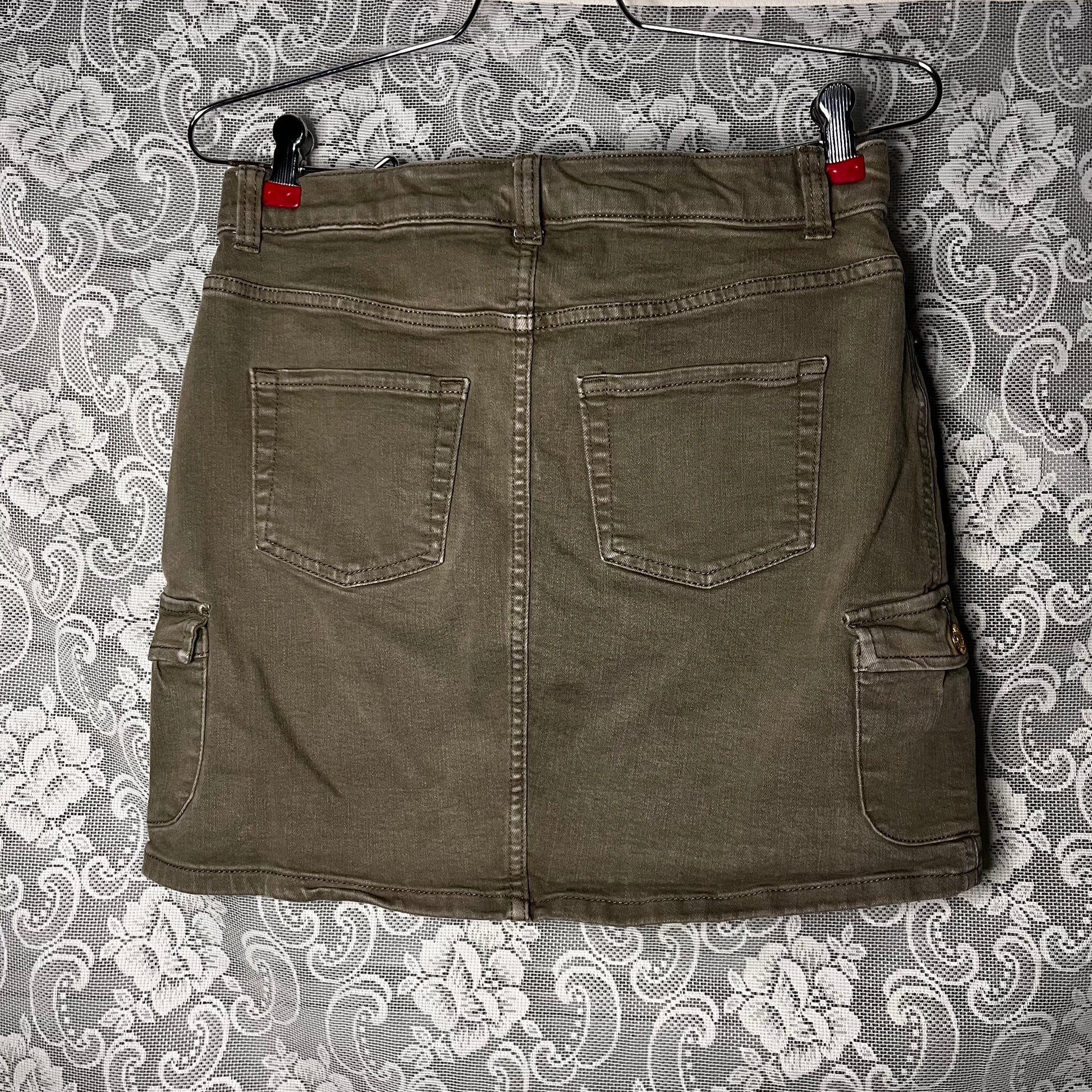 very cute comfy little cargo mini skirt with side pockets. tag says XL 14-16 which means children’s sizing LOL but waist is 30 inches and length is 15 inches.