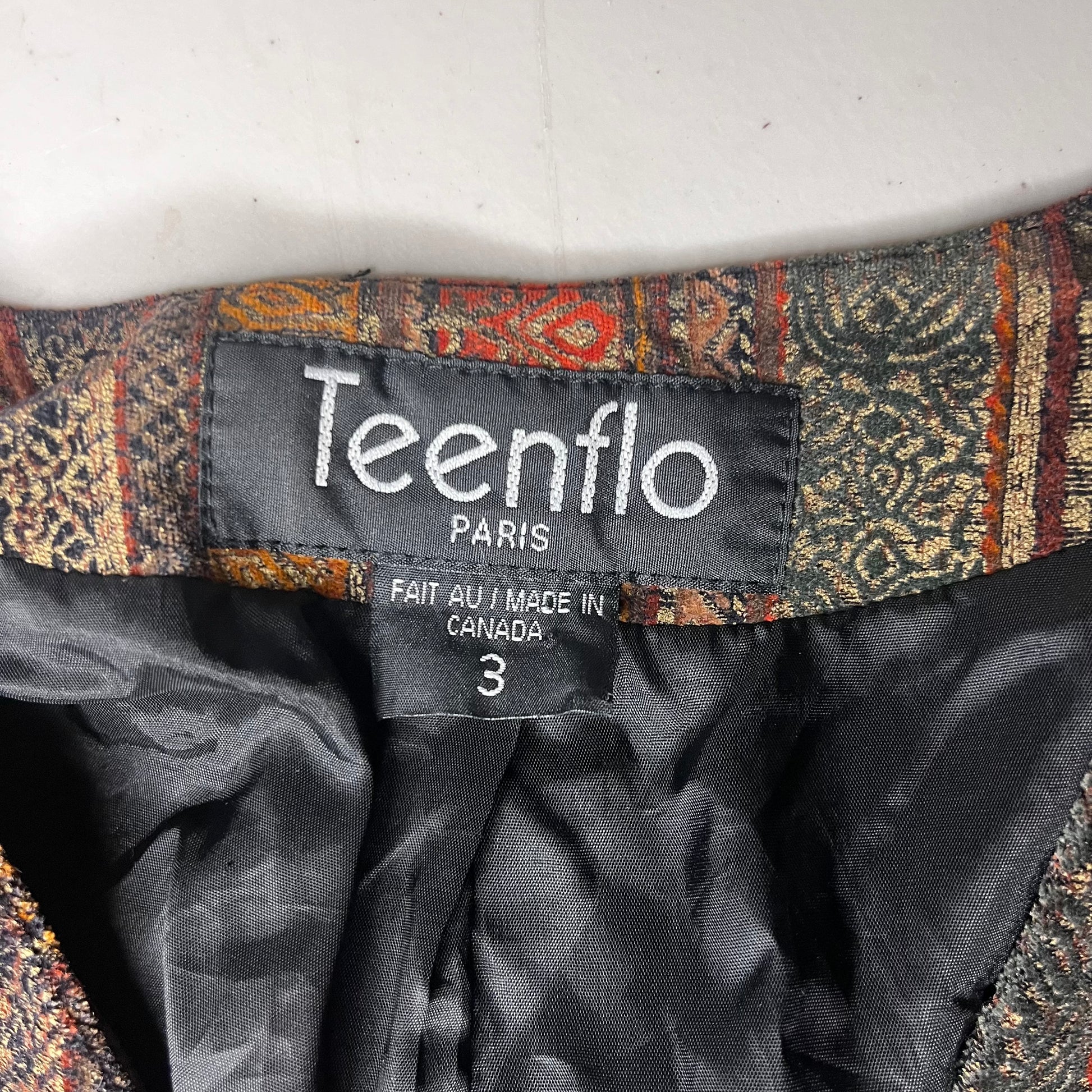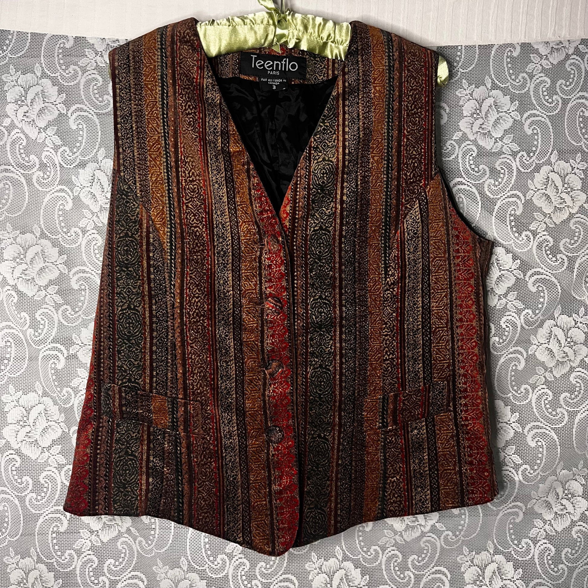 idk how to describe this one tbh it’s very unique. a velvety kind of fabric with nice neutral earth tones n paisley type print. in great condition. pit to pit measurement is 21 inches. waist is 40 inches. length is 23 inches. tag says size 3
