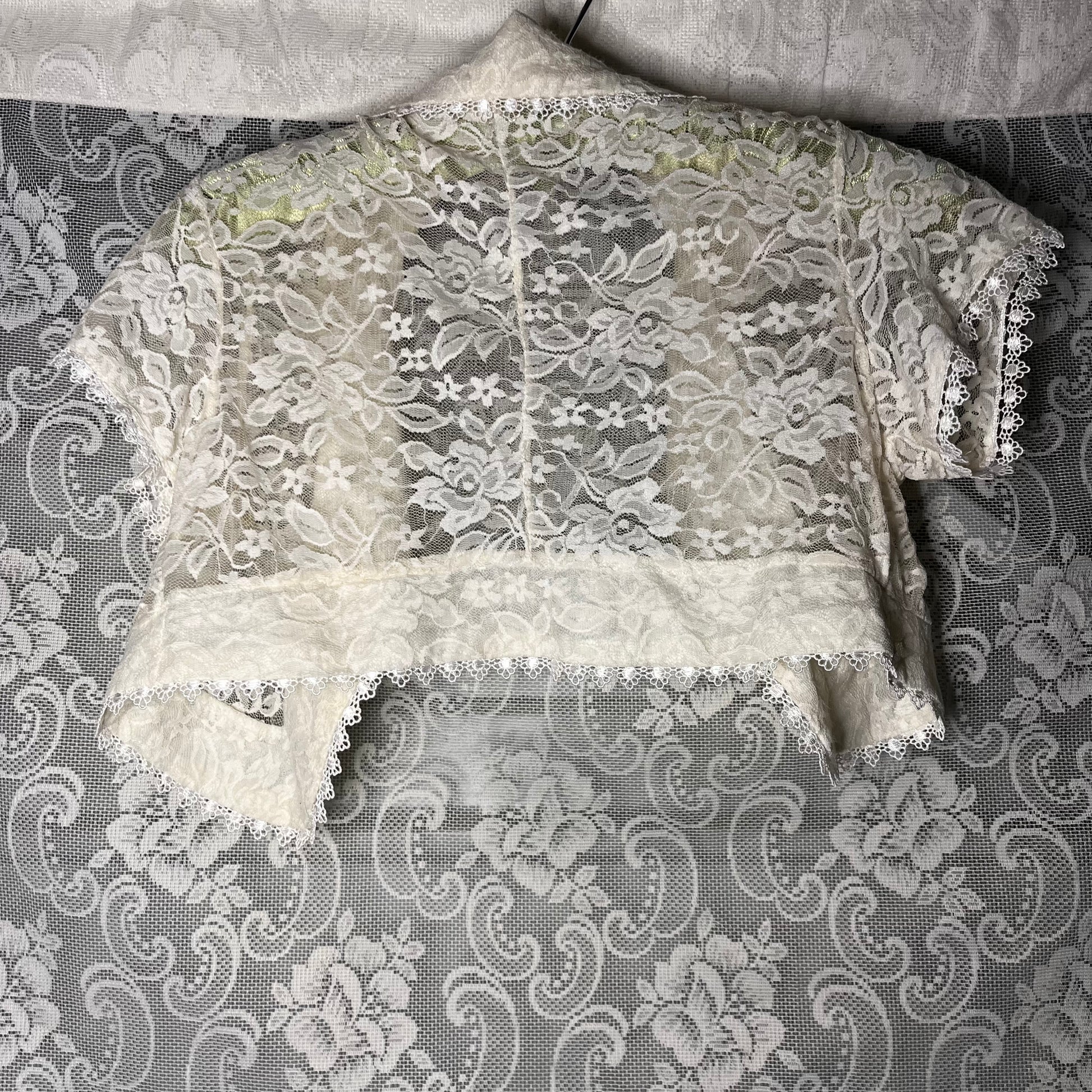 sweet lil lace top. no buttons or closures or anything. no tag but probably size small or extra small. length is 12 inches.