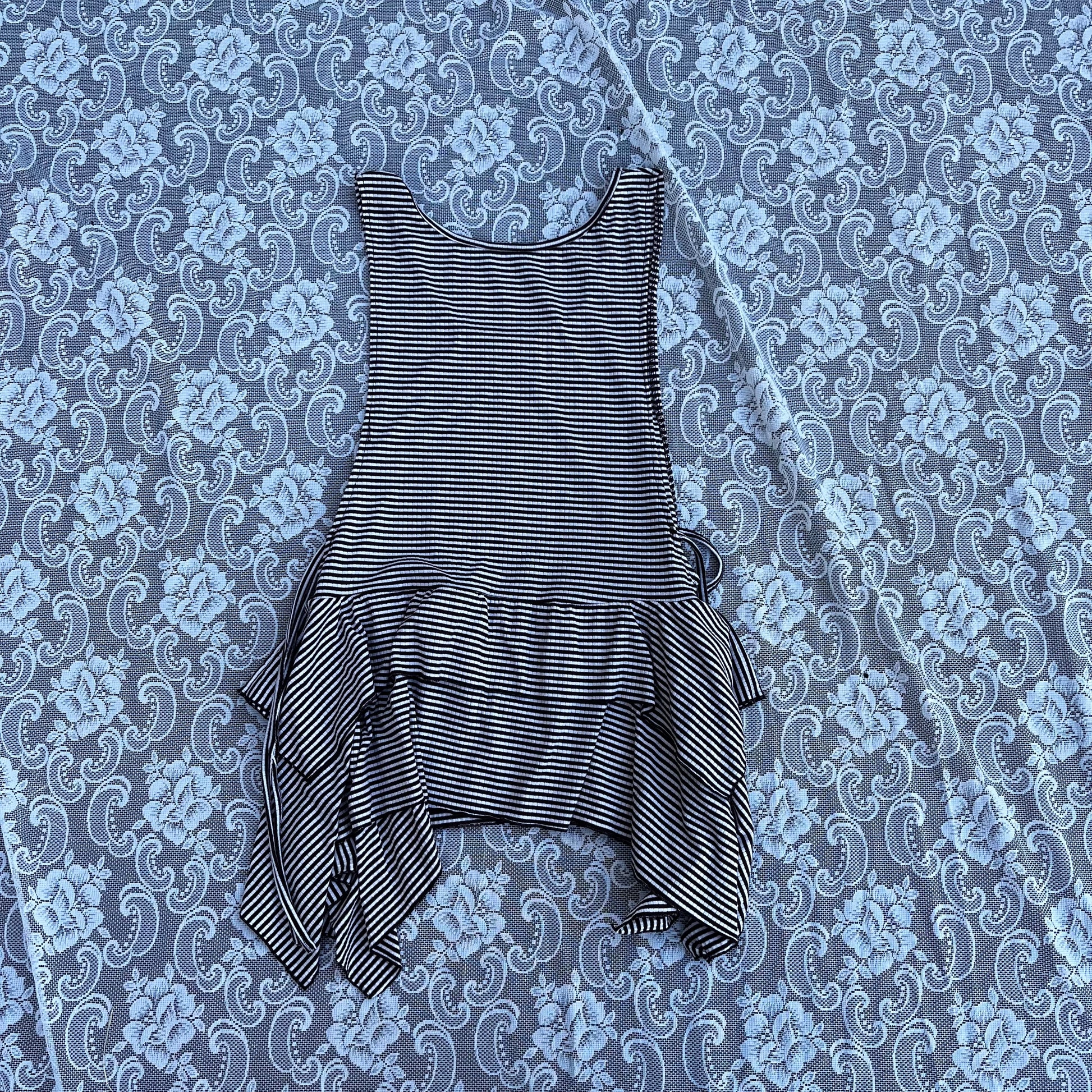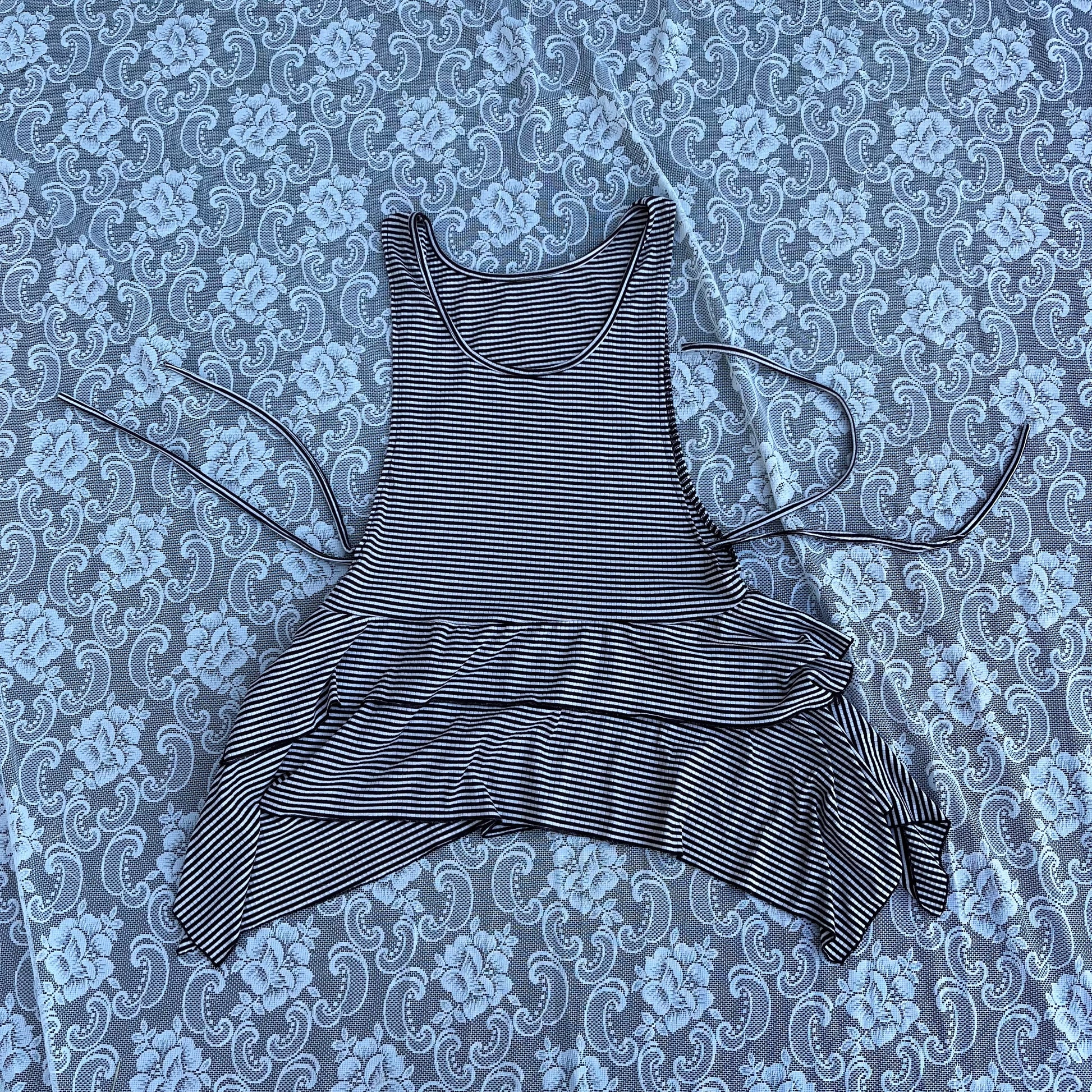 idk if this should be considered a dress. it’s probably not. barely covers anything. but i want it to be a dress for a short person (i am 5’9). no tag sadly. open on the sides n it has 4 ties, u tie 2 in the front and 2 in the back. ruffles r long on the sides. shoulder width 12 inches. hip seam 34 inches. armpit hole length is 16 inches. total length is 25 inches to the shortest part and 30 on the sides.