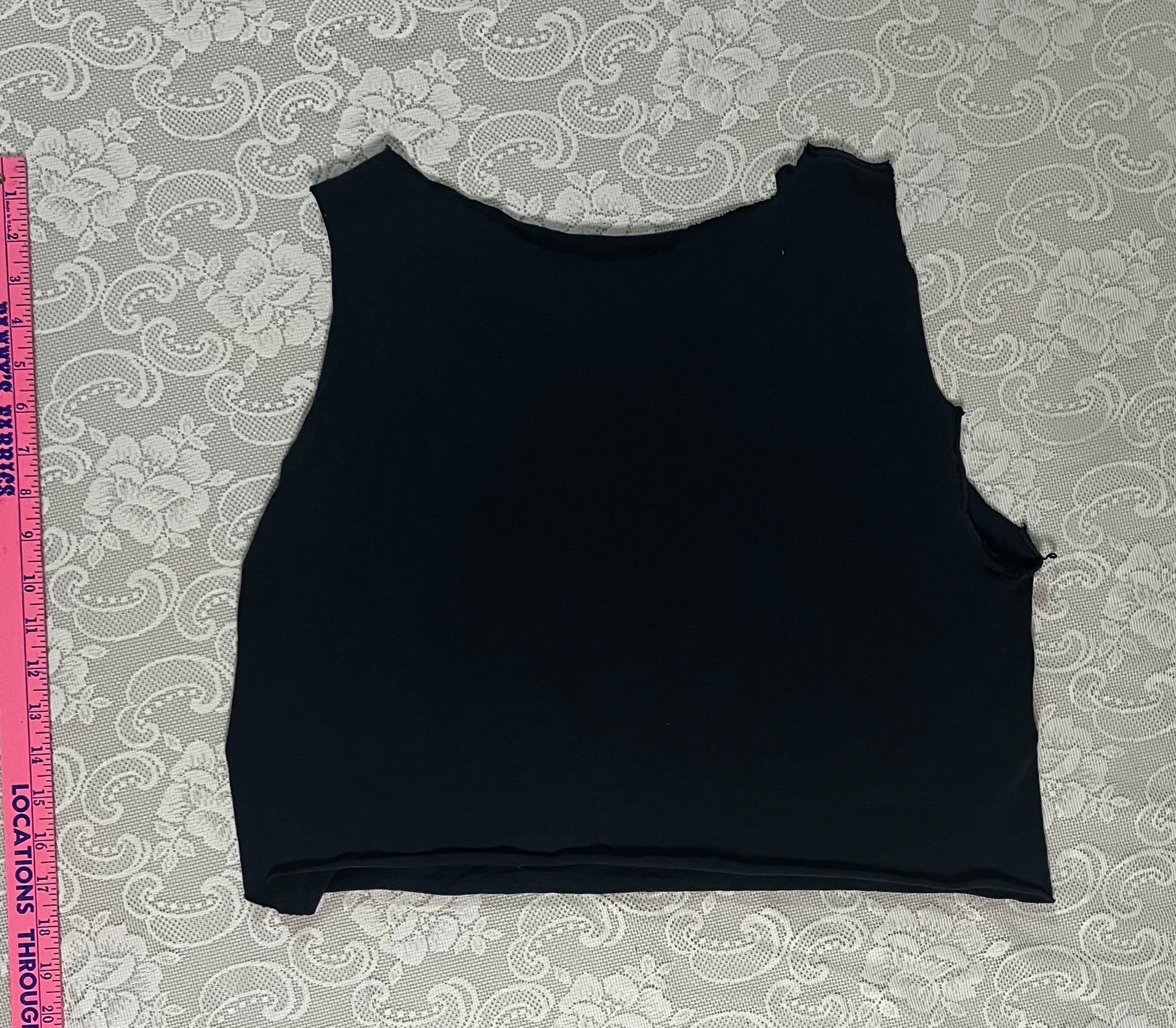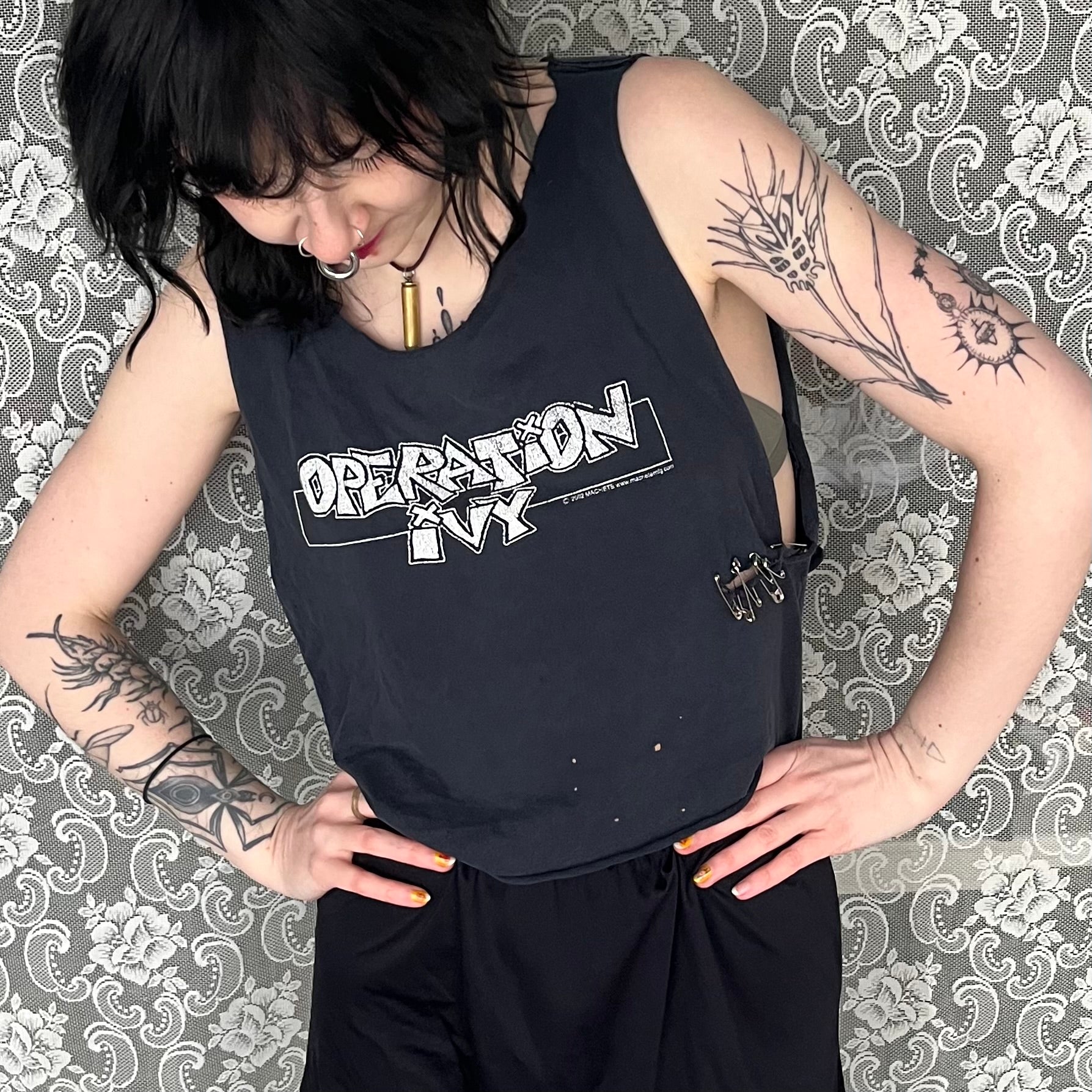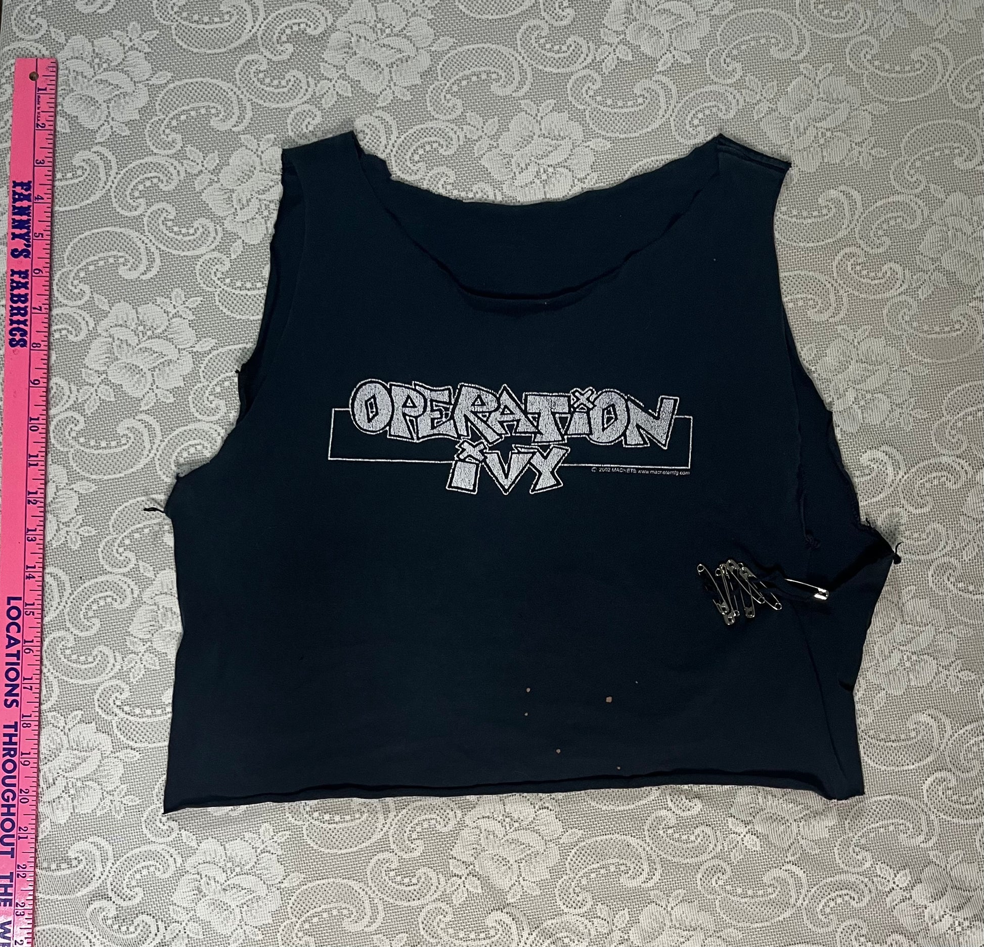 yes ok this is destroyed. i salvaged it in the punkest way i knew how, with safety pins. and it does look sick. this shirt is from 2002 officially making it VINTAGE!!!!! and rare. the length on this is 17 inches and the shoulder width is 13.5 inches ish if you wanna count it like that. it was probably a size M/L shirt. has some bleach stains too. just admit how fucking cool this looks. price considers the condition but also how rare and old this is