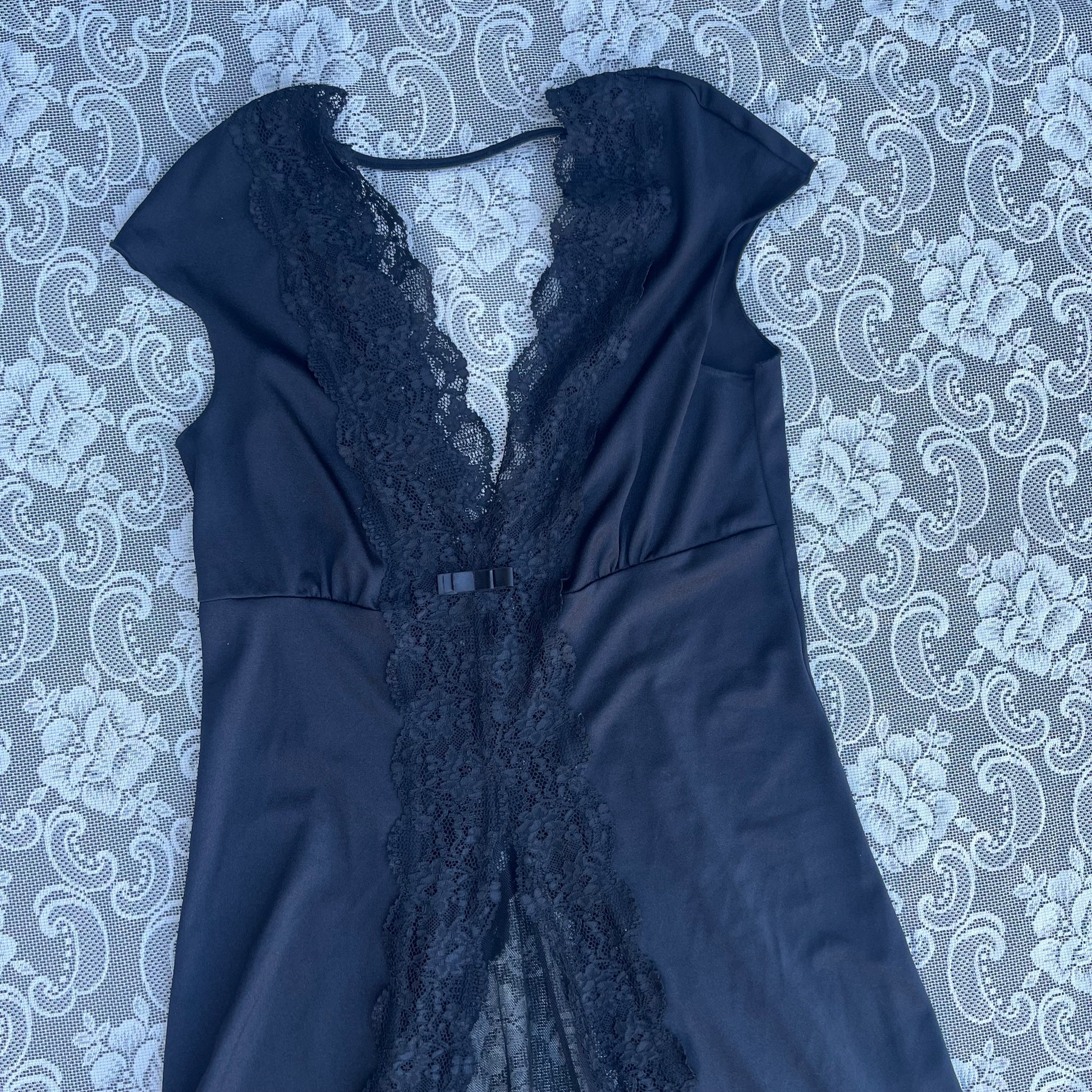 super sexy hot goth piece. long as helllll. as-is cuz there’s a strap that goes across the back that has snapped on one side so it’s safety pinned on. u don’t really need the strap tbh so u could just remove it if u wanted. it’s also a bit chewed up in one spot at the bottom i have no idea what happened there. tag says size large. length is 61-67 inches (longer in the back). underbust 30 inches. pit to pit 16 inches. shoulders 17 inches.
