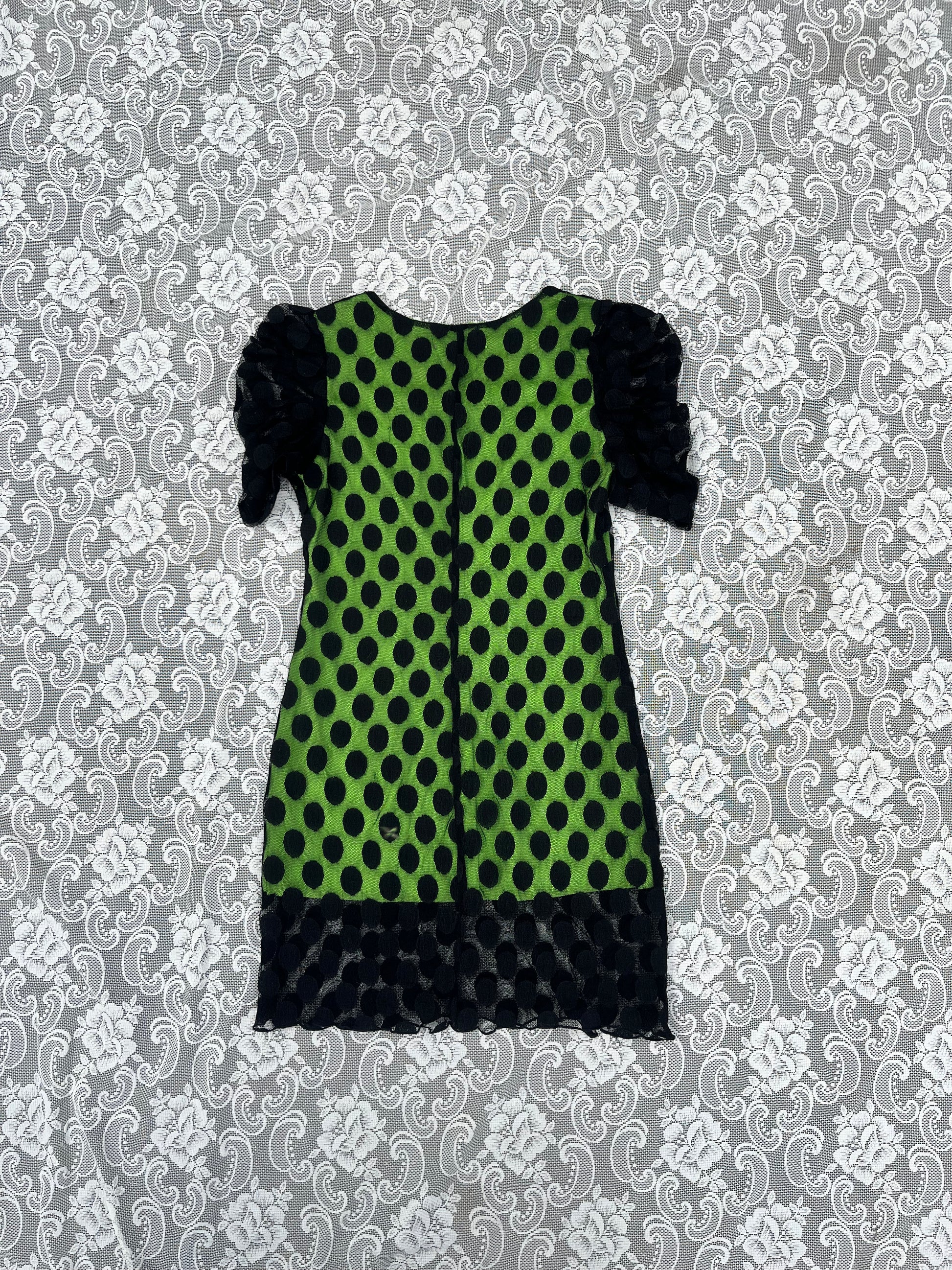 tag removed grrrrrr. so cute tho. made for a very short person. jasmine is 5’3 for reference. likely size small. stretchy fabric. cute rooched sleeves with the polka dot mesh n little green lining. shoulders 14 inches. pit to pit 16 inches. sleeves 12 inches. length 26.5 for the lining and 32 inches for the mesh. waist 30 inches.
