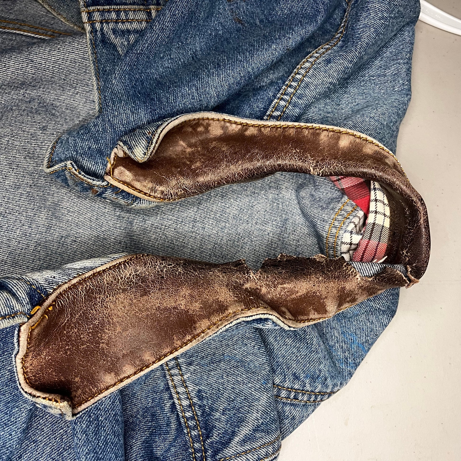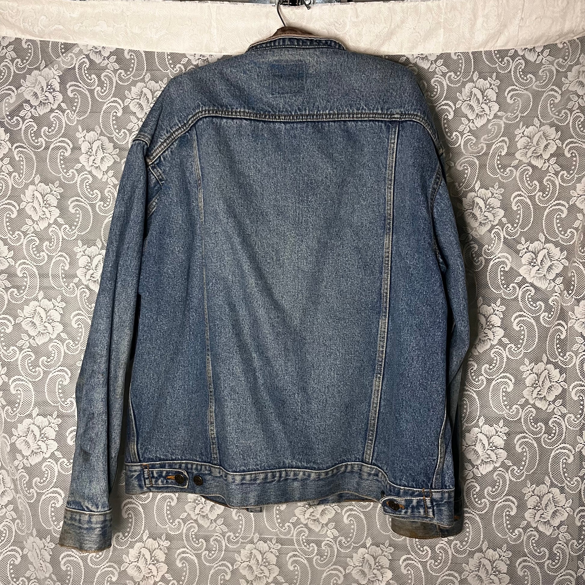 very cool well loved piece. quite dirty and tattered, collar is pretty shredded leather. still dope regardless. marlboro country store brand, i think it’s from the 80s. doesn’t even really smell like cigarettes. size XL. width around is 50 inches, shoulder width is 22 inches and length is 27 inches.
