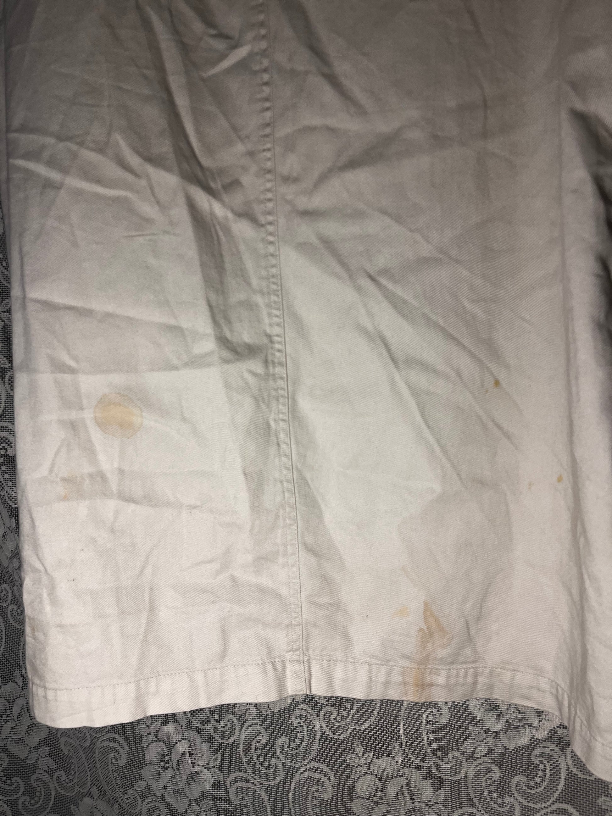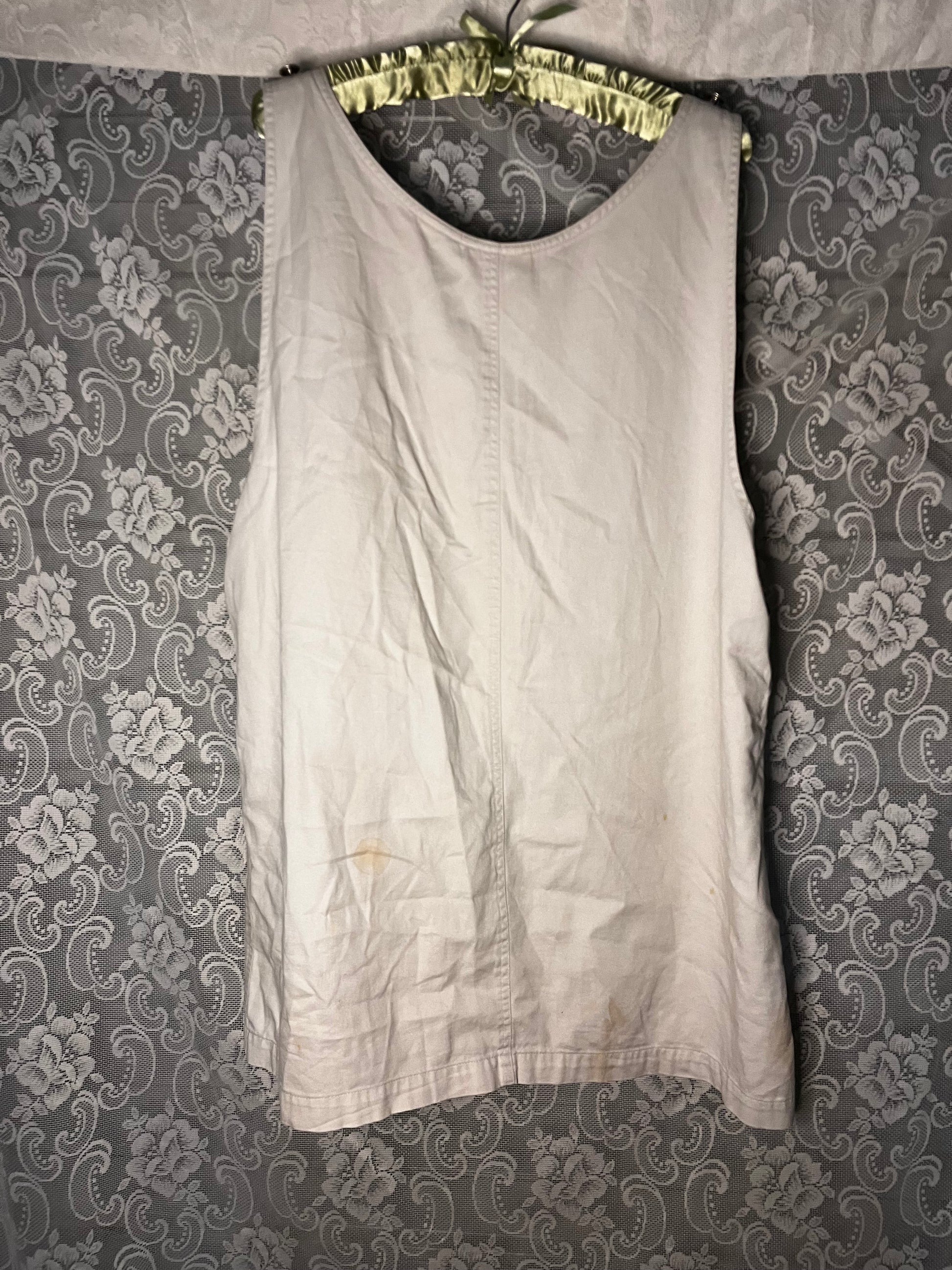 awesome unique lil dress. damage is photographed in last pic, there are stains on the back. u could probably bleach them out but i will price this lower so U can do that labour. buttons on the sides. has pockets. length from top to bottom is 32 inches. waist is free.