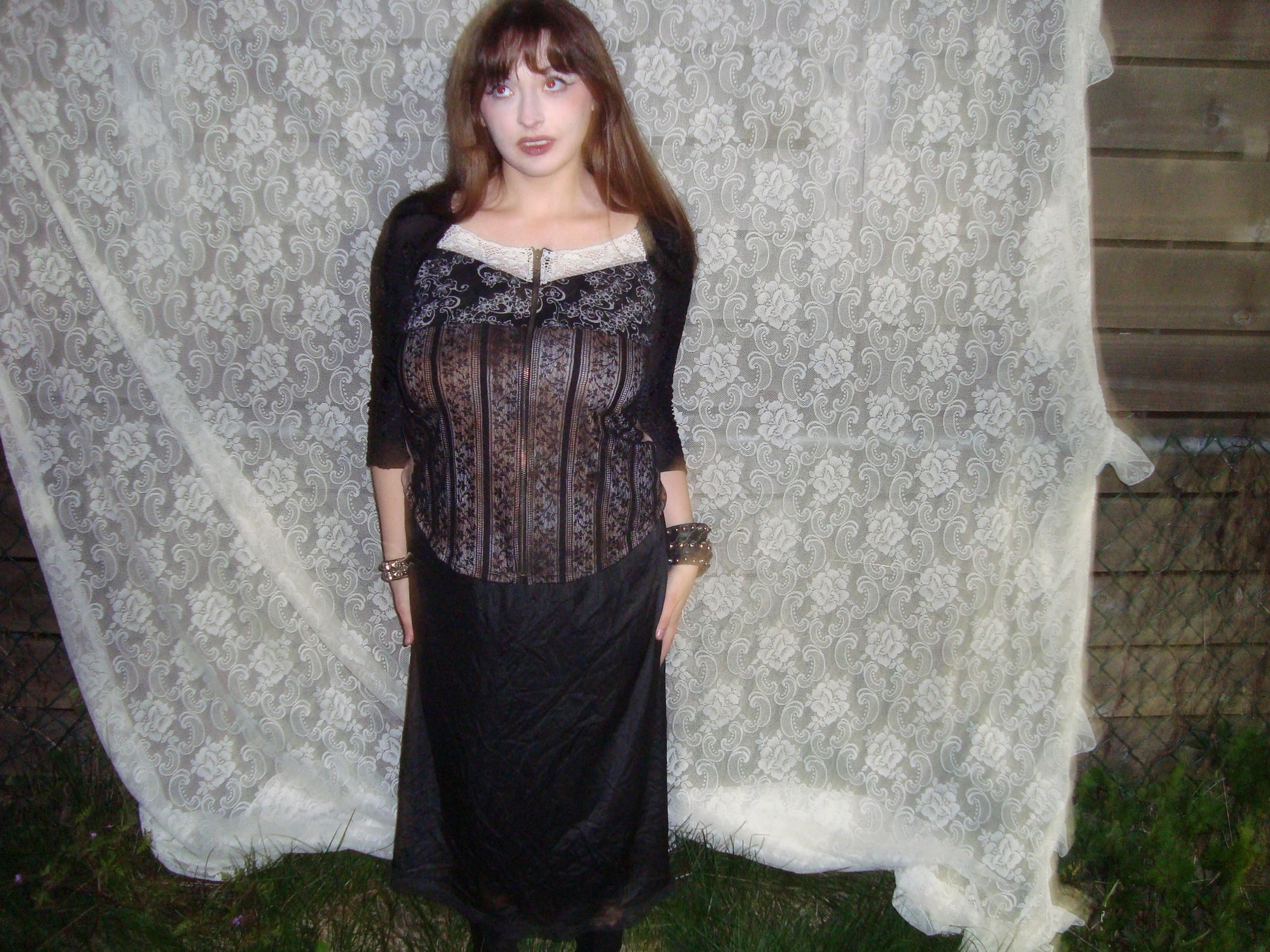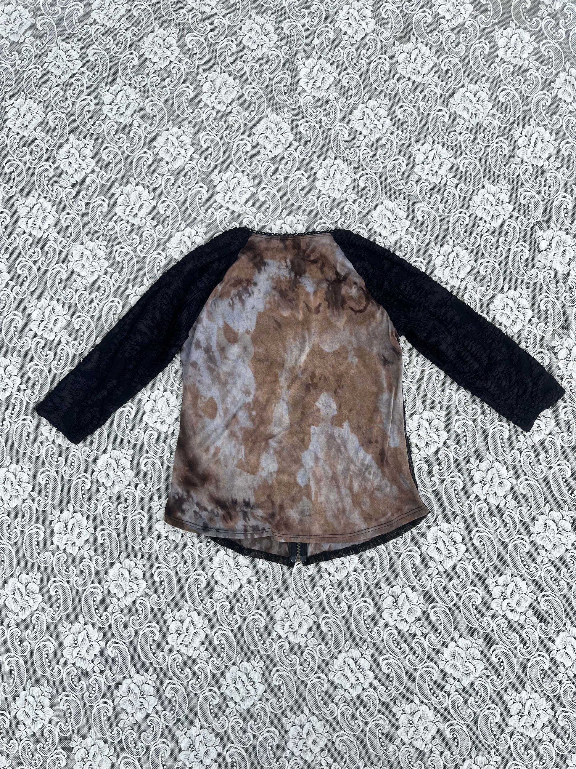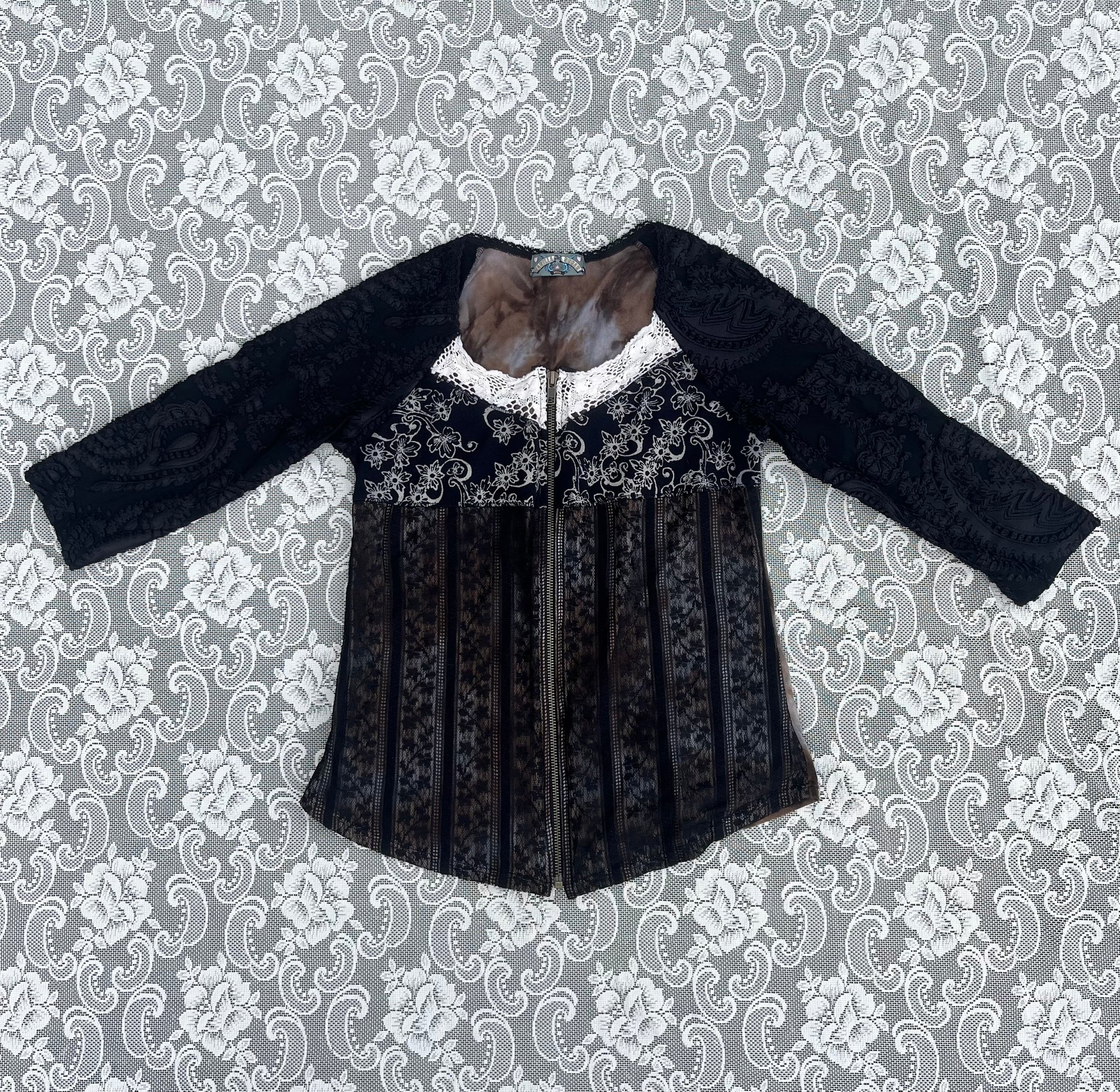 lil vanilla sugar 3/4 sleeve top with a zip! lace sleeves, mesh section in the middle, functional zipper! tag says size small. pit to pit measurement is 17 inches. length 23 inches. sleeves 19 inches (from shoulder). waist 32.