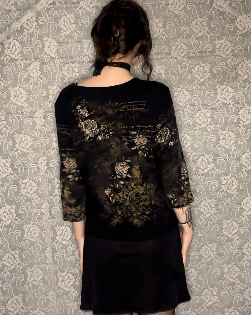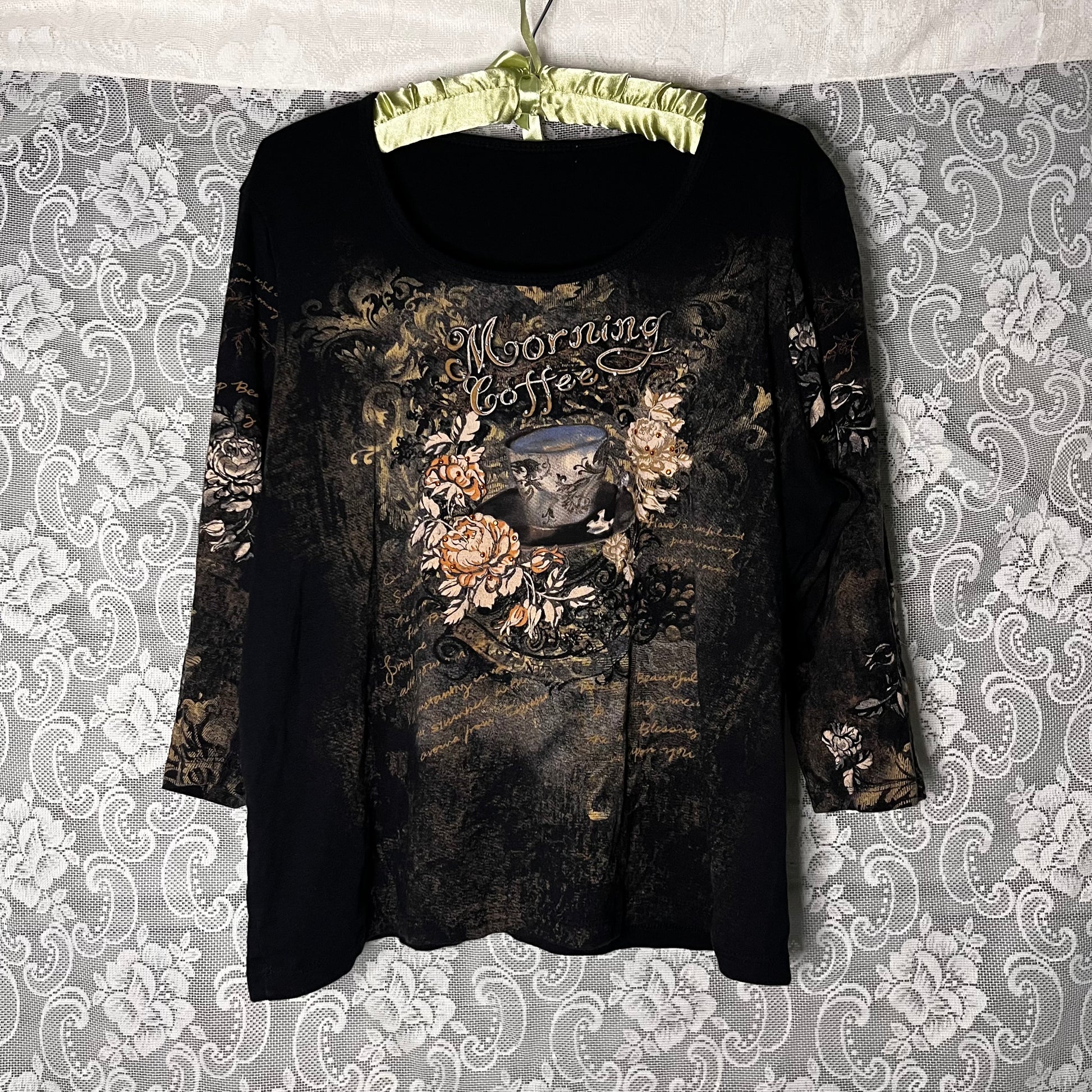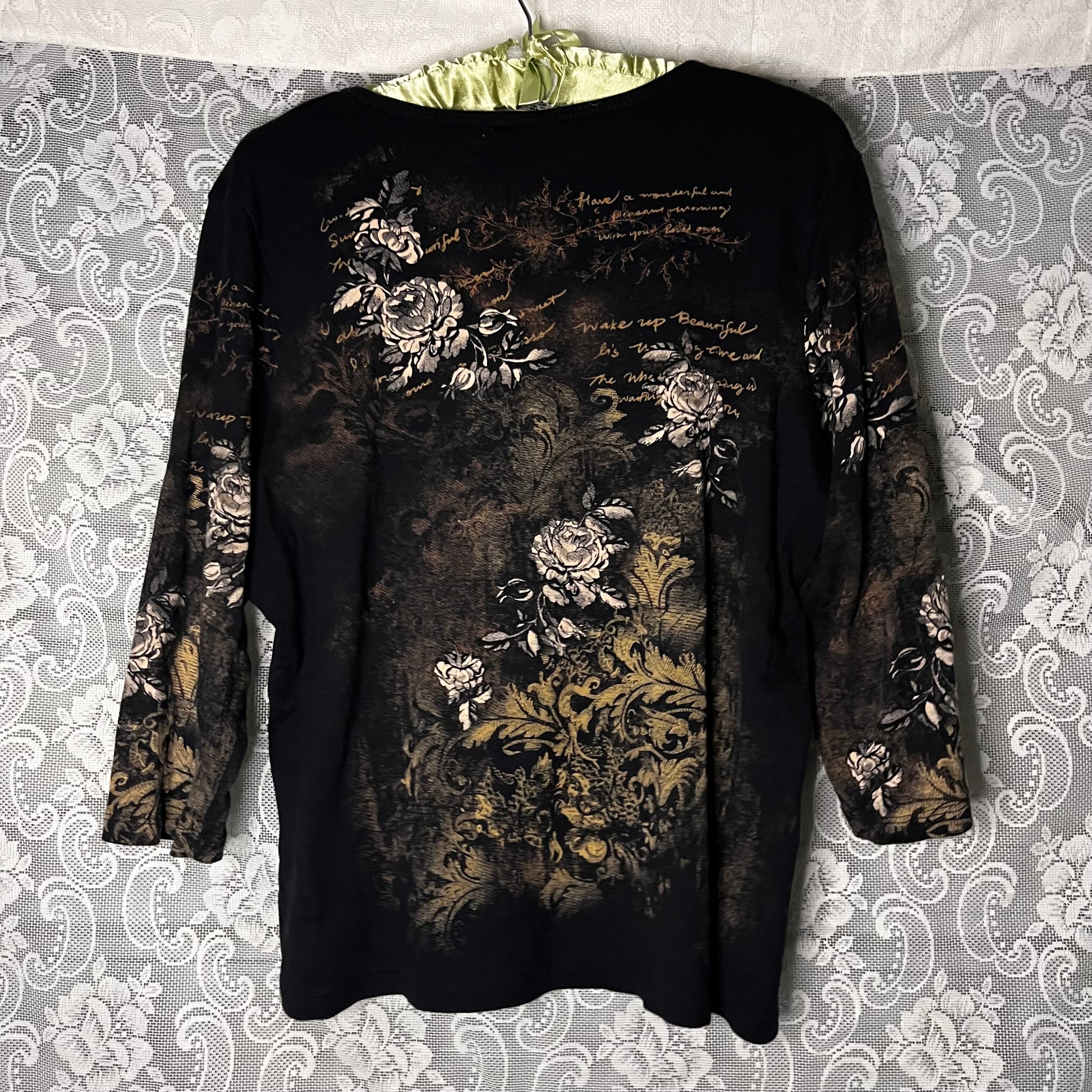 awesome old weird floral 3/4 length sleeve top. doesn’t have a tag but probably size L/XL.