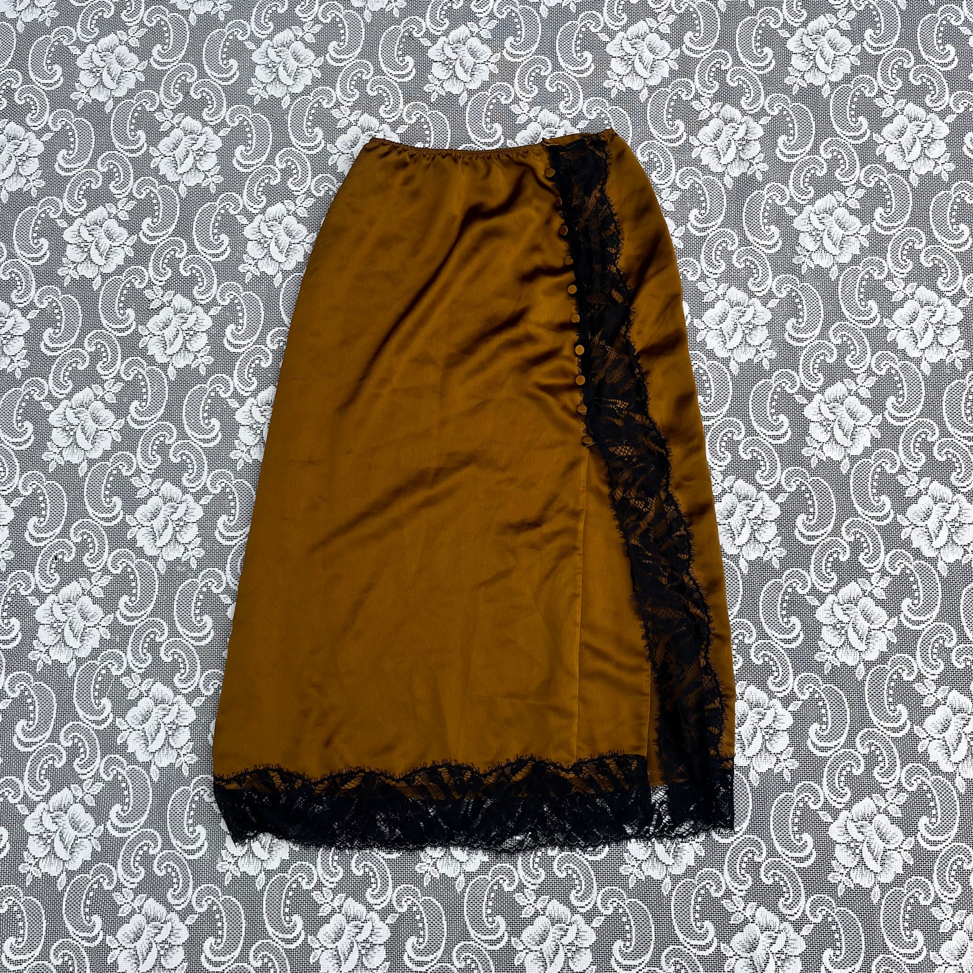 super cute lil modern number from victoria’s secret. the buttons are functional all the way up the side/slit and it has a lil extra flap that snaps in to help cover your leg under the lace. elastic waist but the fabric isn’t stretchy. tag says size XS. waist fits 24-26 inches. hips 36 inches. length 25-26 inches with lace.